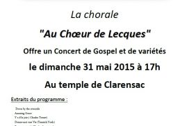 Groupe TDE de Clarensac La chorale « Au Chœur de Lecques« Offre un Concert de Gospel et de variétés le dimanche 31 mai 2015 à 17h…
