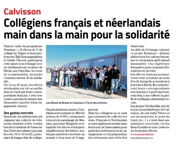 Dans le cadre du programme Erasmus, 18 élèves de 3ème du collège Le Vignet et leurs professeurs, Rija RAMANGASALAMA et Gisèle VINCENT, participent cette année à un échange avec un établissement scolaire de BREDA aux Pays-Bas. Au cœur de ce partenariat, un projet commun autour de la solidarité.