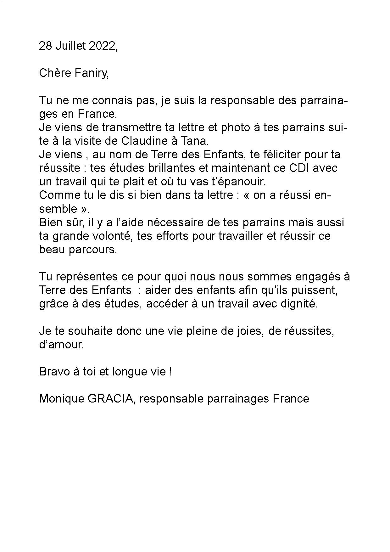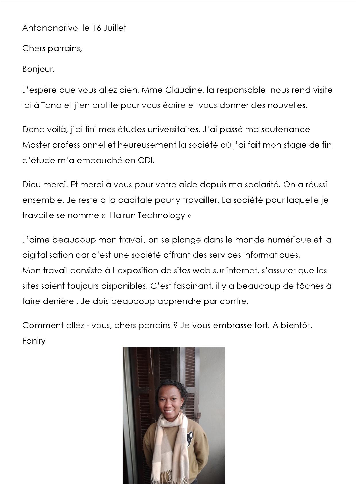 Tiana Fanasina  redouble sa 1ère année de Gestion au (CNTEMAD), elle a 4 matières à refaire pour la nouvelle rentrée. Elle va bien, elle souhaiterait passer un concours pour rentrer en 1° année à l’Université publique d’Antananarivo (Ankatso) mais l’avis de concours n’est pas encore sorti.