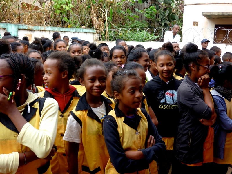 147 garçons et 135 filles fréquentent les classes du primaire, encadrés par 7 institutrices. 13 professeurs sont chargés de mener leurs élèves jusqu’au brevet. Les filles sont plus nombreuses au collège, à savoir 86 filles pour 76 garçons qui fréquentent les classes de 6ème jusqu’en 3ème. Le but de l’équipe pédagogique était de poursuivre le suivi des enfants parrainés au collège, ce suivi leur échappant trop souvent dès qu’ils quittaient l’école élémentaire. Il semble que le but est atteint, car nous avons pu constater que les enfants parrainés étaient nombreux dans les classes de 6ème à 3ème. Une seule directrice pour l’ensemble de ces enfants (il s’agit tout de même de 444 élèves dont 223 garçons et 221 filles !) Lourde responsabilité. Les classes sont chargées, mais les élèves sont très disciplinés et bien encadrés. Nous avons eu accès à toutes les classes, accompagnés par la directrice et M. Rolland. Nous avons eu droit à des récitations, des chants ou des exercices de calcul au tableau. La directrice exige que les enfants parlent le Français lors des récréations.