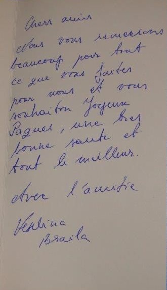 Merci pour tes mails. Nous allons bien et nous travaillons autour de la maison. Chez nous il fait beau mais il fait le vent et il y a beaucoup de poussière. Je suis contente que tu aies bien reçu les cartes et les dessins. Aux écoles maternelles tout va bien. La cantine marche bien, la nourriture et bonne et il fait chaud. Les enfants sont en bonne santé et ils viennent chaque jour. La semaine prochaine sera la fête de PAQUES et toutes les écoles sont fermées. Les enfants ont un peu de vacances. Tu as écrit que vous venez en Octobre chez nous. Quand vous venez vous êtes bienvenus. Avec l’amitié. Véselina  »