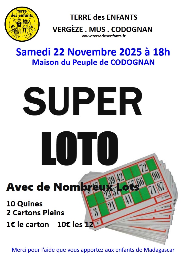 Le groupe Terre des Enfants Vergèze Mus Codognan vous convie à son grand LOTO annuel,