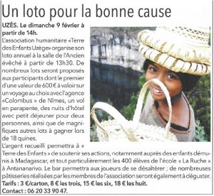 L’association humanitaire « Terre des Enfants Uzège » organise son loto annuel le dimanche 9 février 2020 à 14 h00.