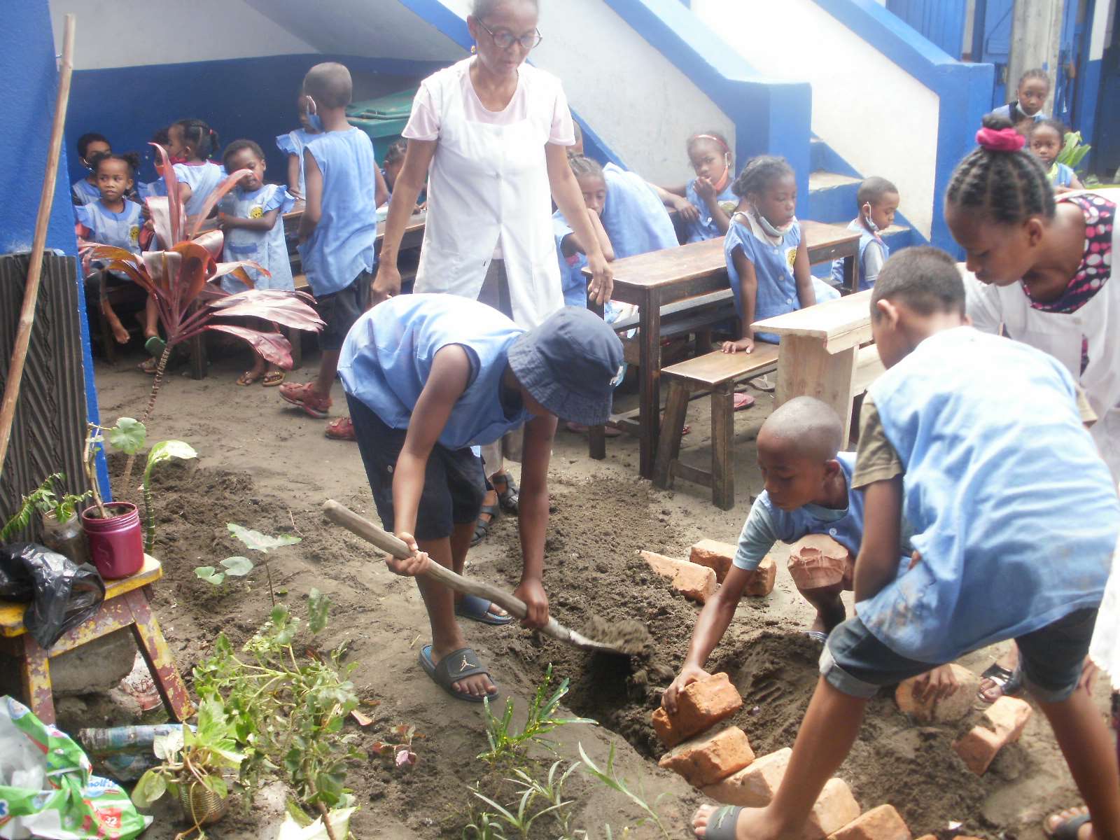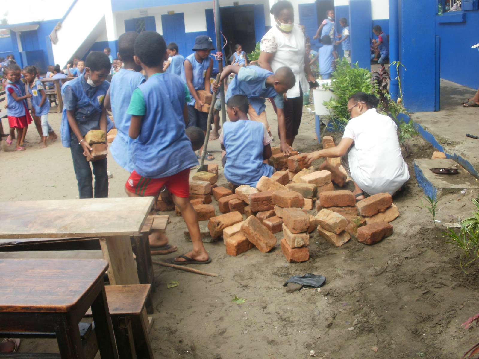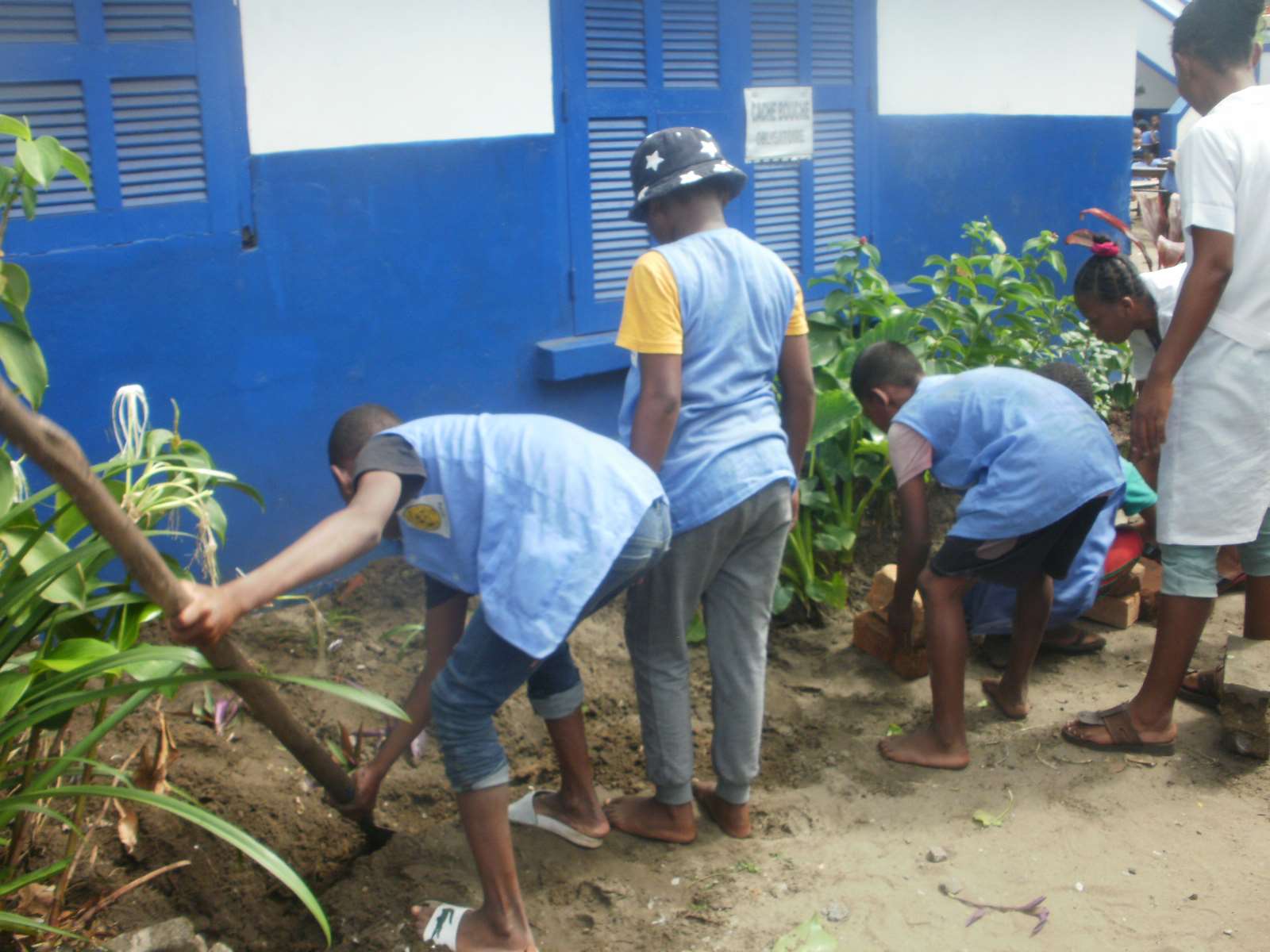 Après ces 3 cyclones tout le monde souffle un peu: à l’Ecole Antoine, on entreprend de nettoyer à fond l’école et on refait les plantations.