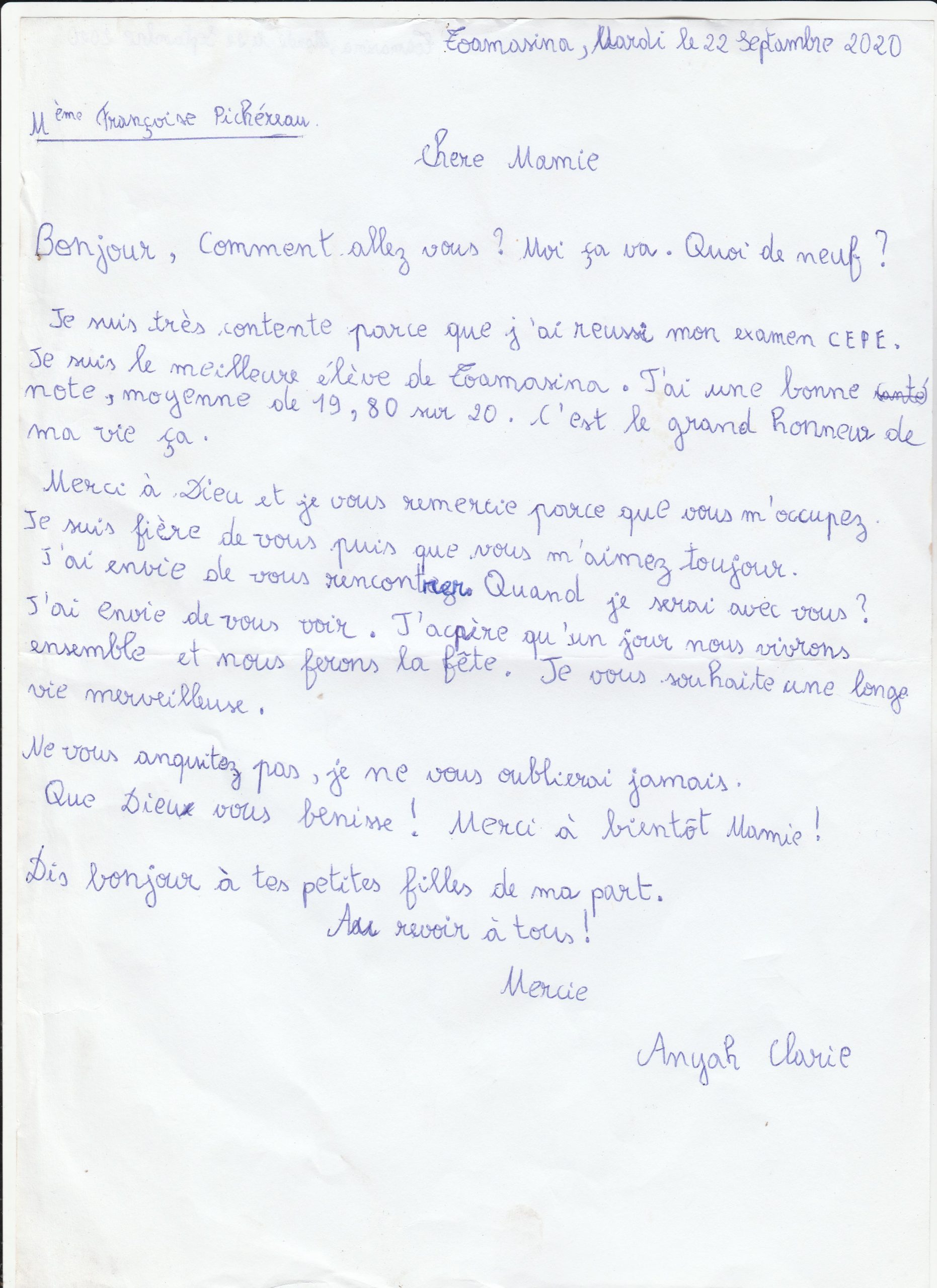 Je vous envoie en pièces jointes la lettre de Anyah Clairie qui exprime sa joie à sa marraine car elle est le major au CEPE de Tamatave.