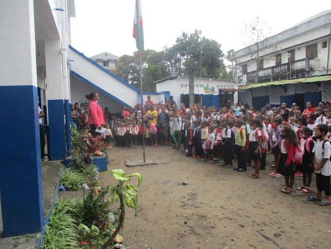 Des élèves de la classe Intégrée, (C.I – handicapés) hissent les couleurs nationales, comme toutes les semaines, avant l’hymne national.