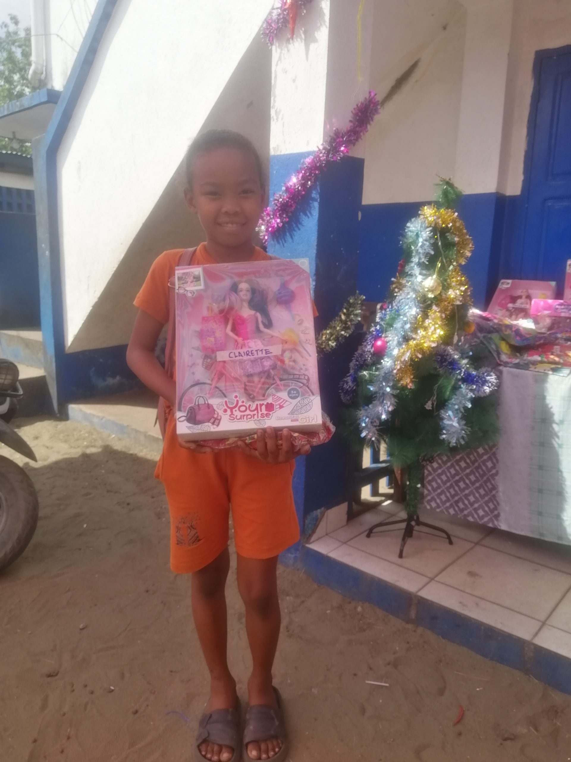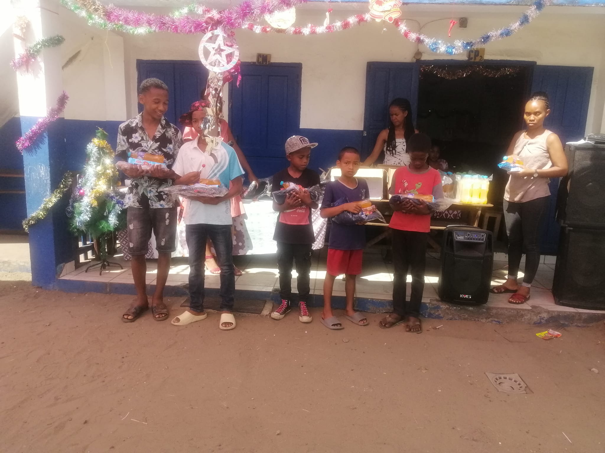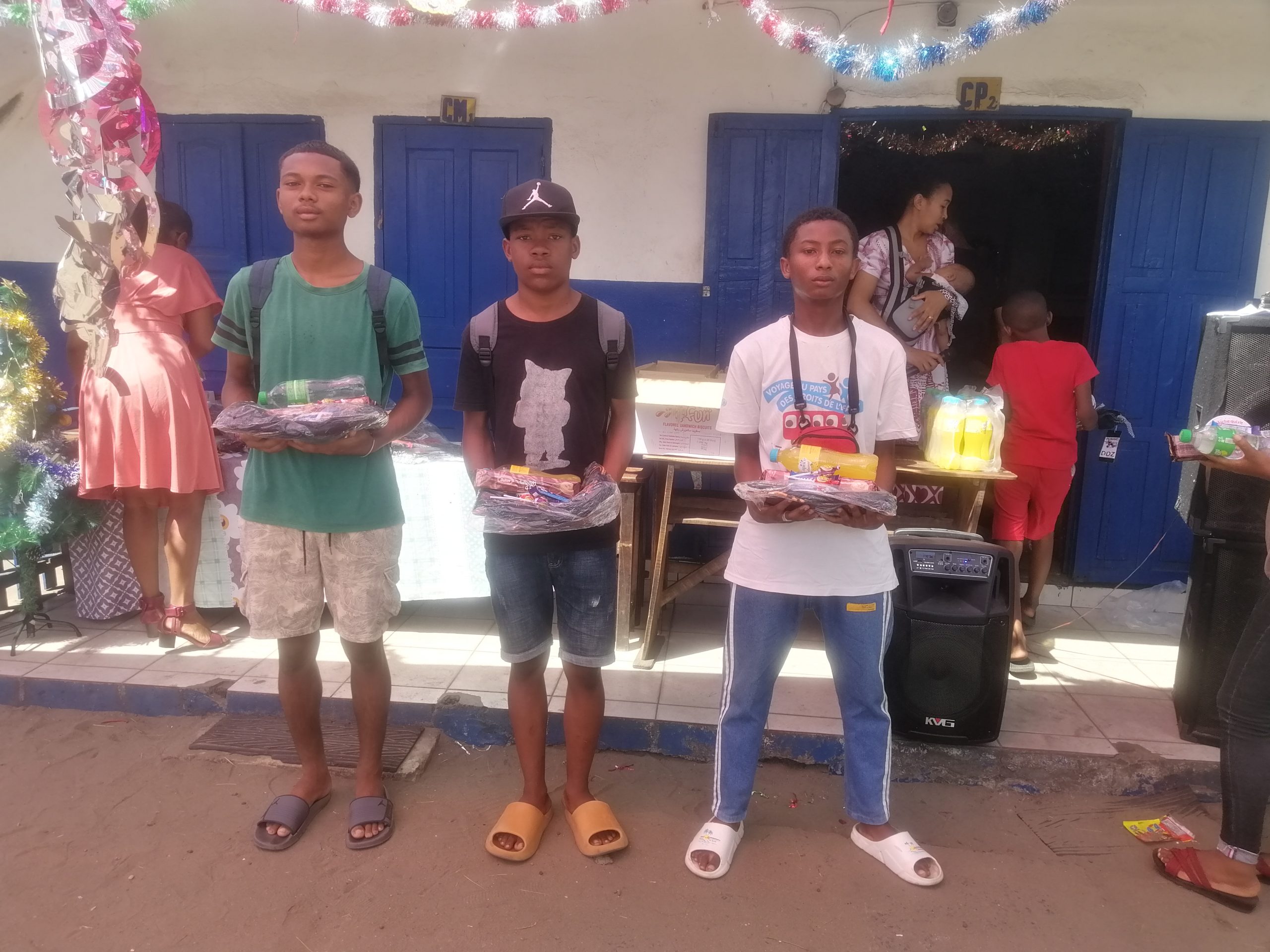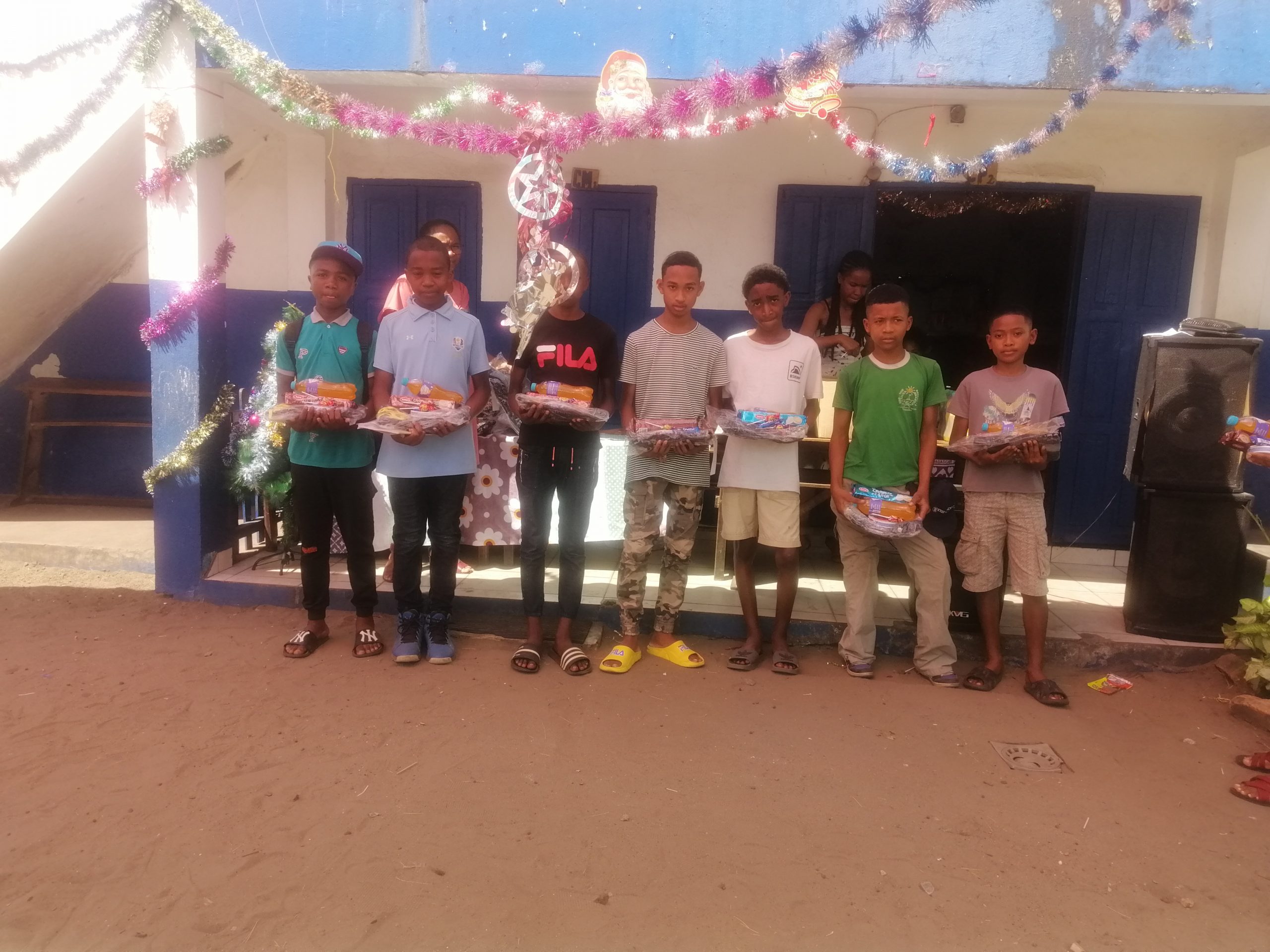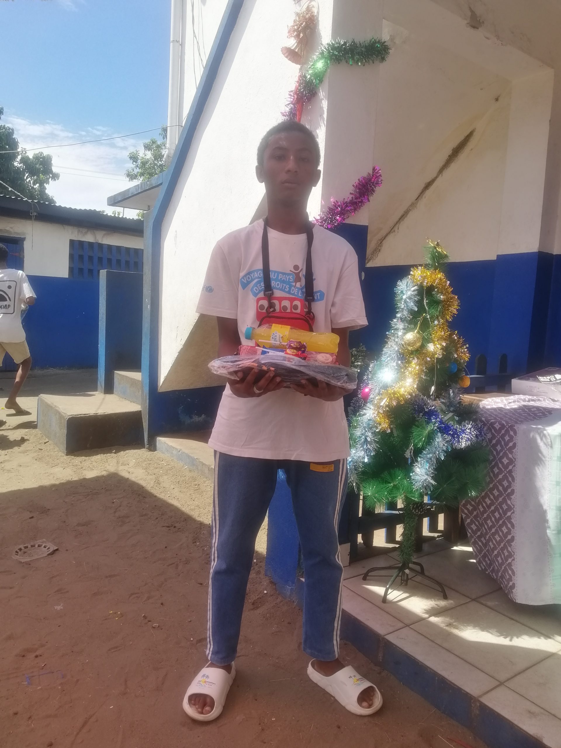 Pour les enfants en famille nous avons donné comme cadeaux : vêtement pour chacun et plus jouets pour les enfants en classe primaire. Pour les goûters : une boisson, une boîte de fromage, un biscuit GM, un chocolat et des bonbons sucettes.