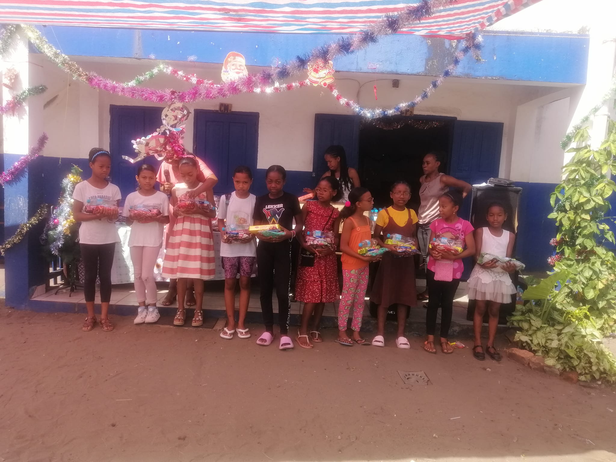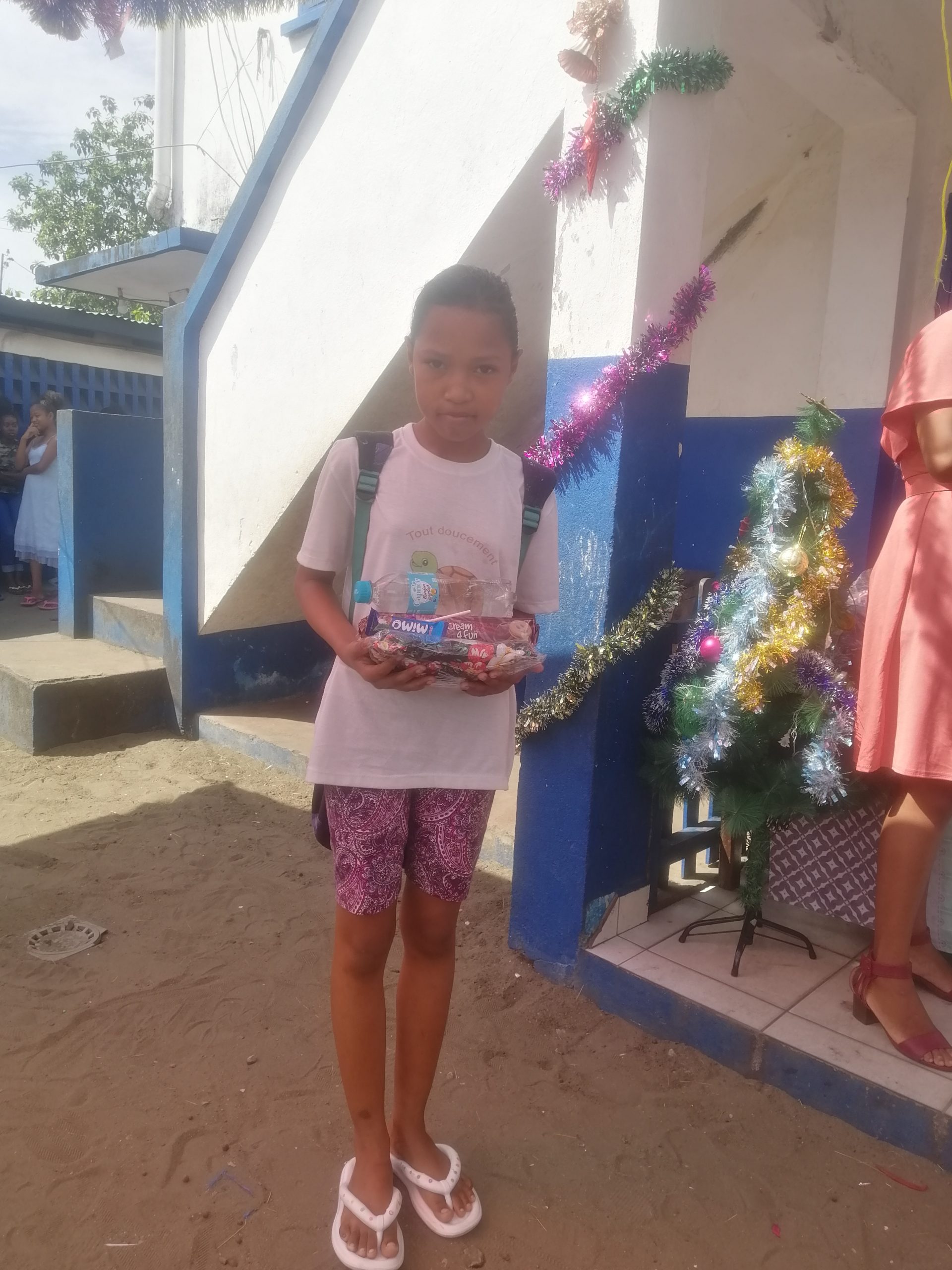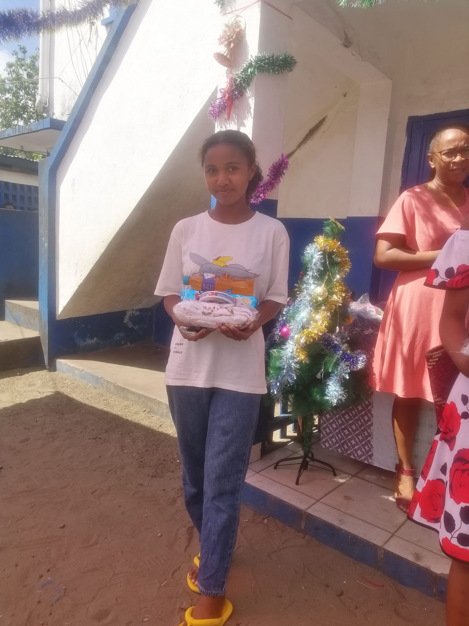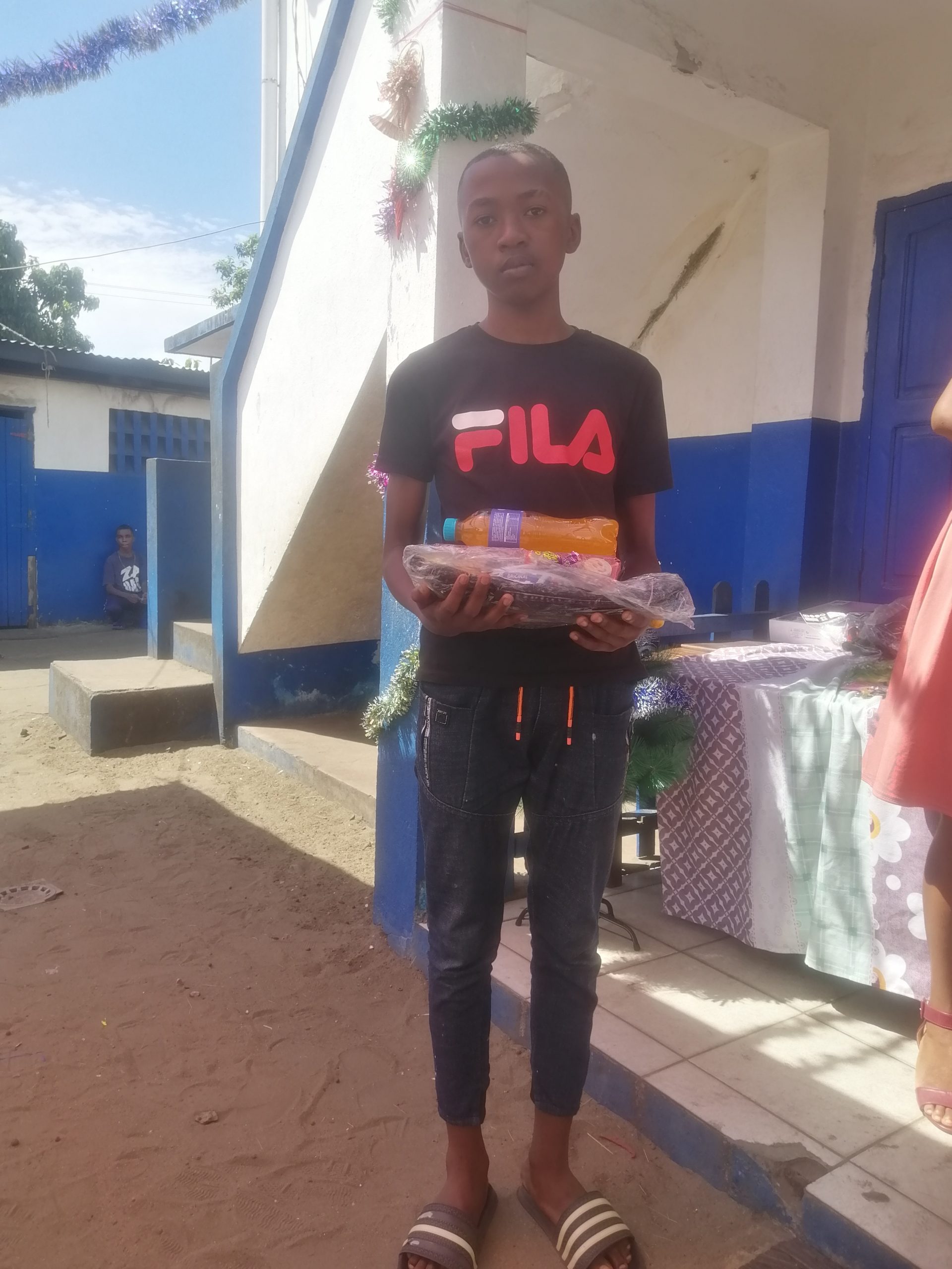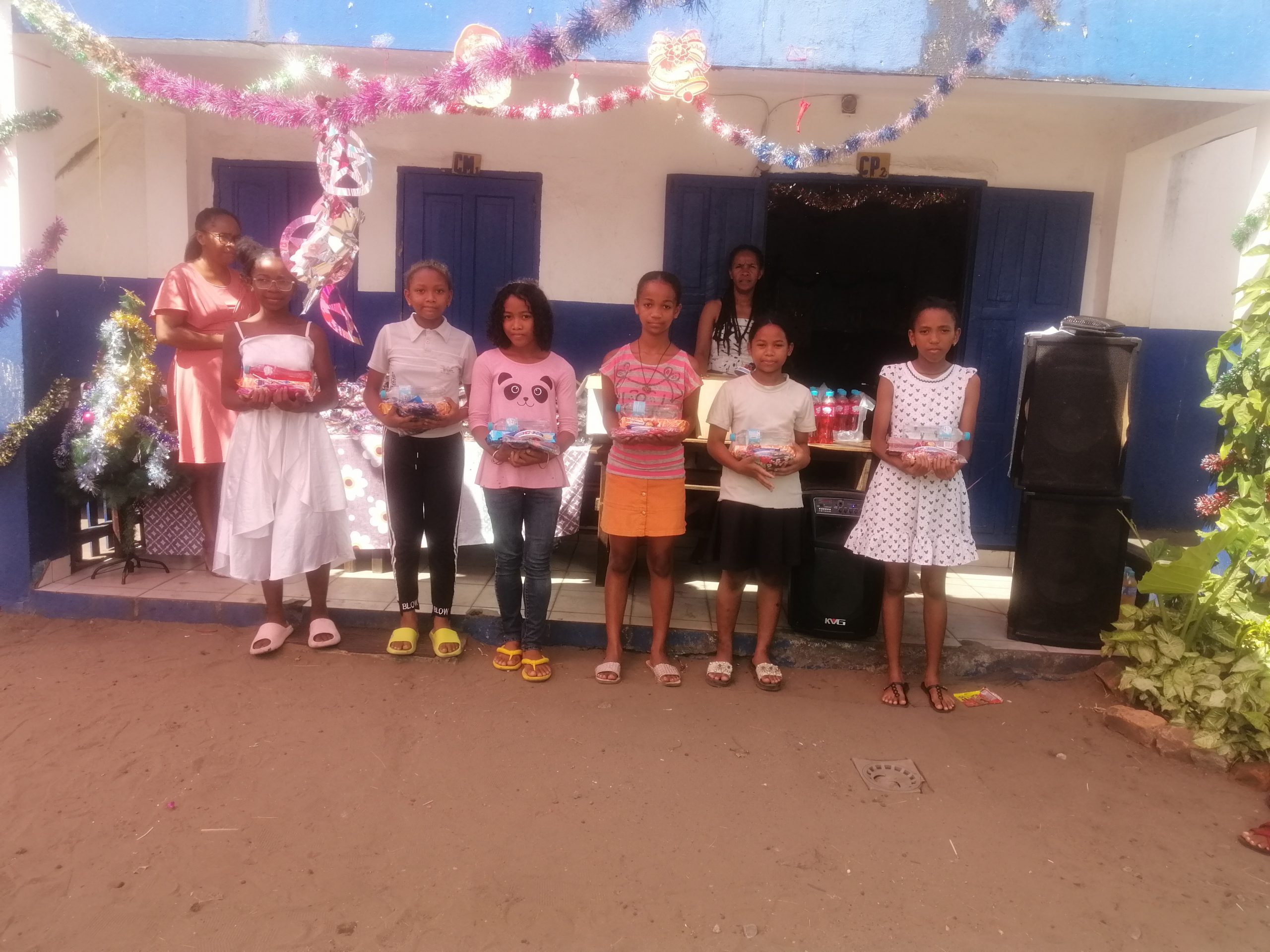 Pour les enfants en famille nous avons donné comme cadeaux : vêtement pour chacun et plus jouets pour les enfants en classe primaire. Pour les goûters : une boisson, une boîte de fromage, un biscuit GM, un chocolat et des bonbons sucettes.