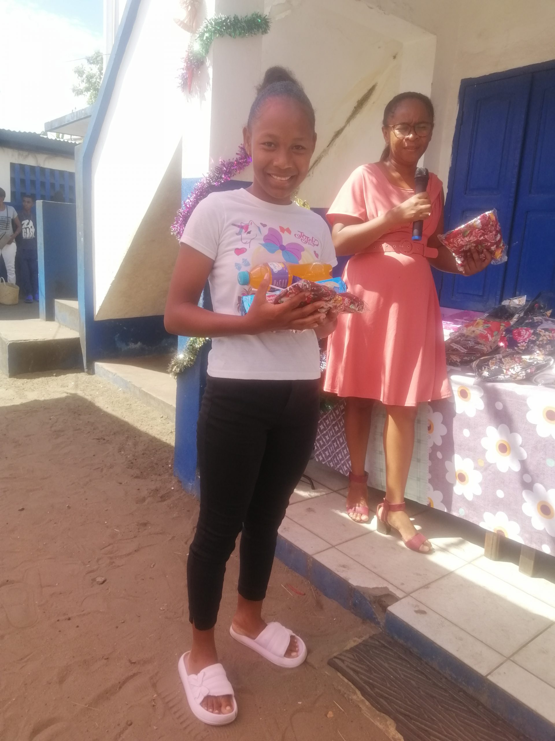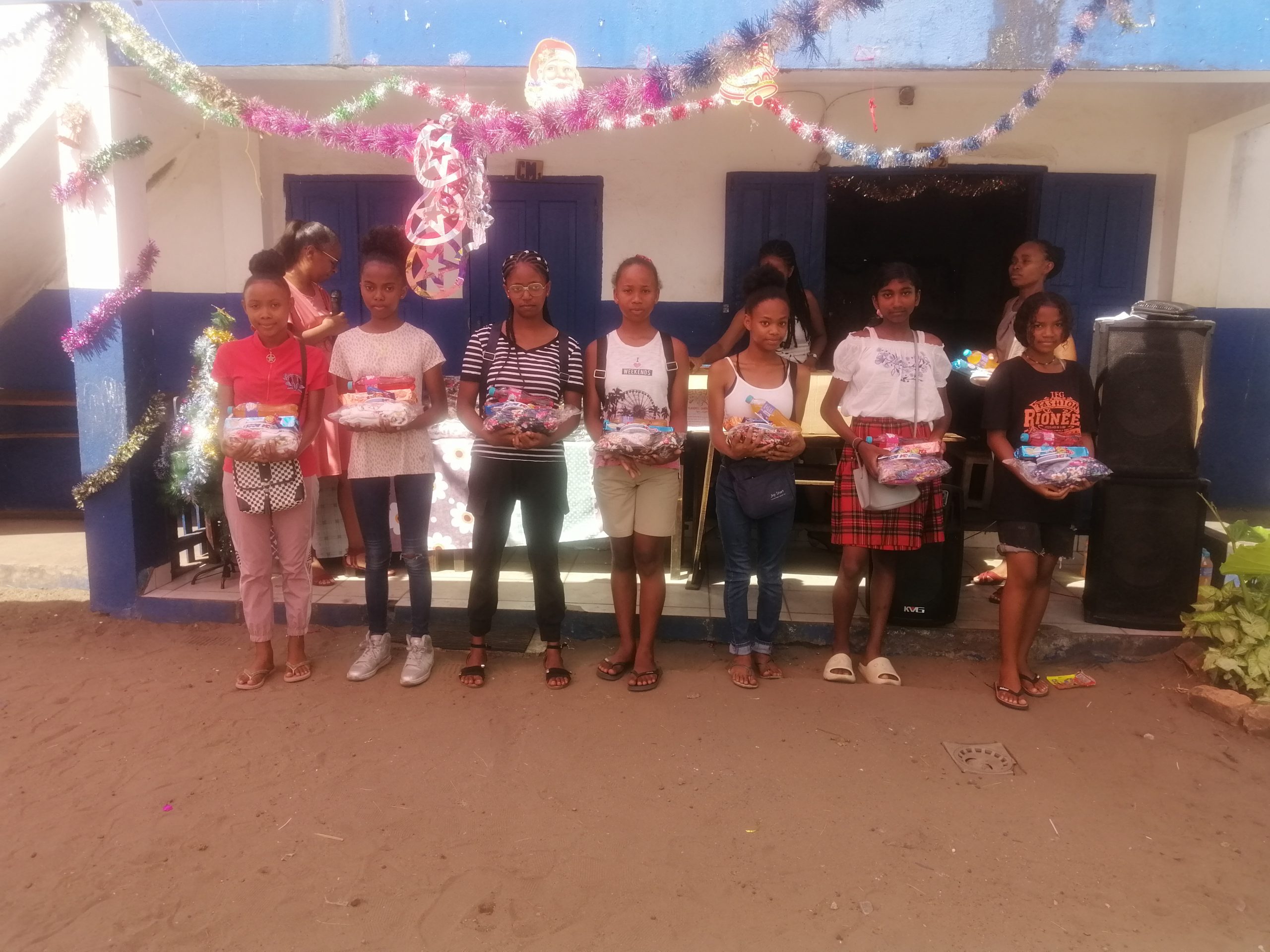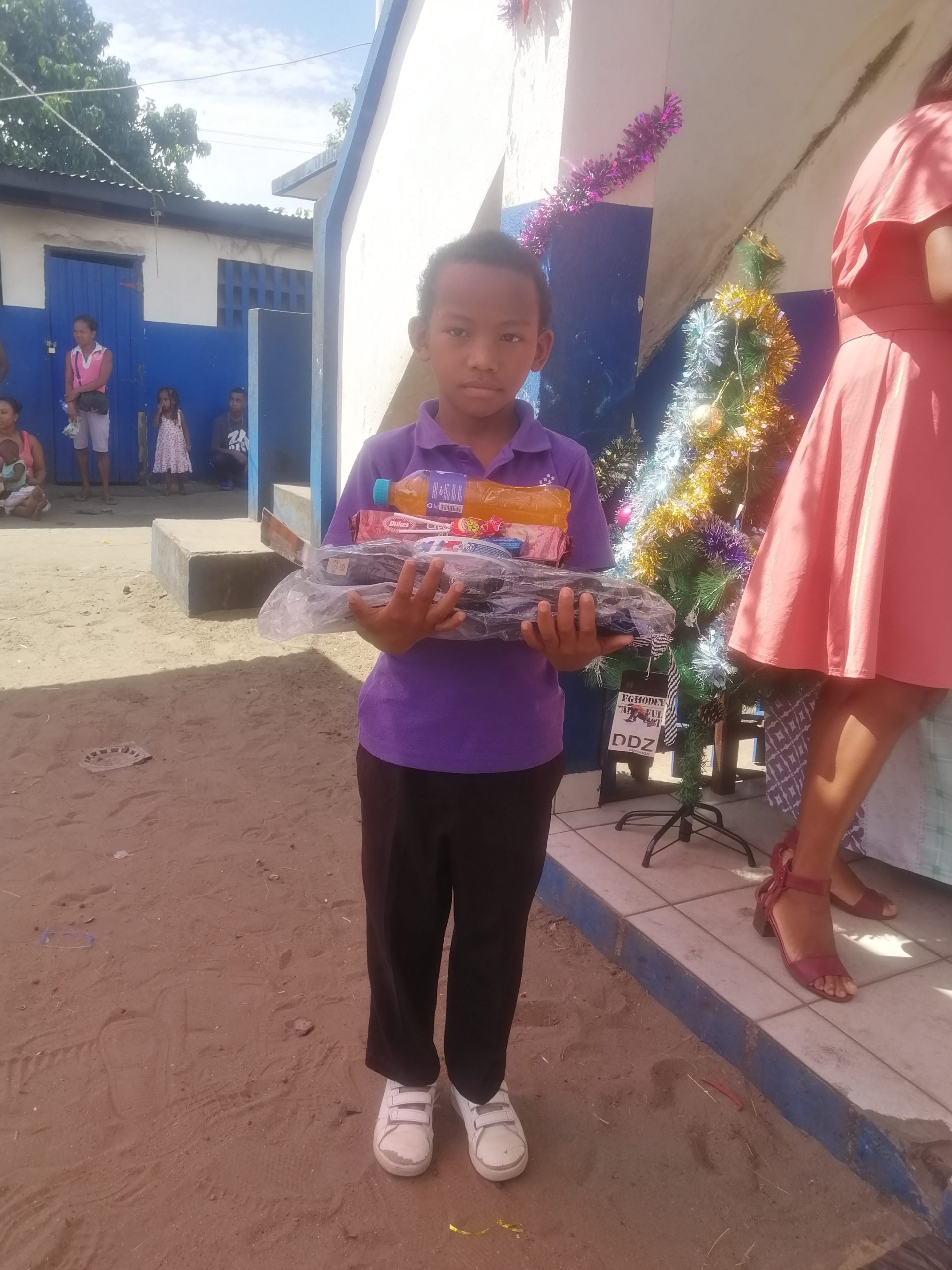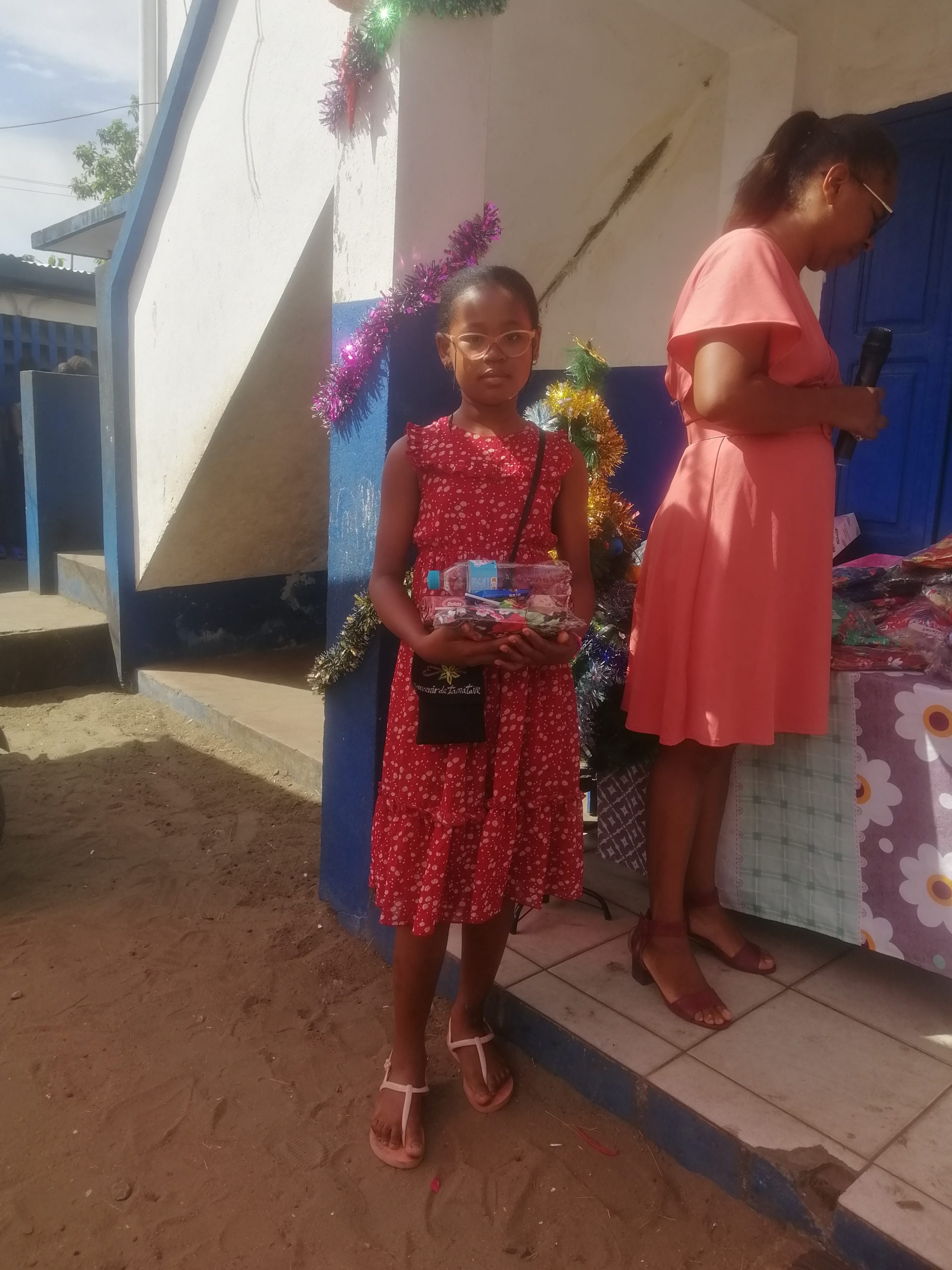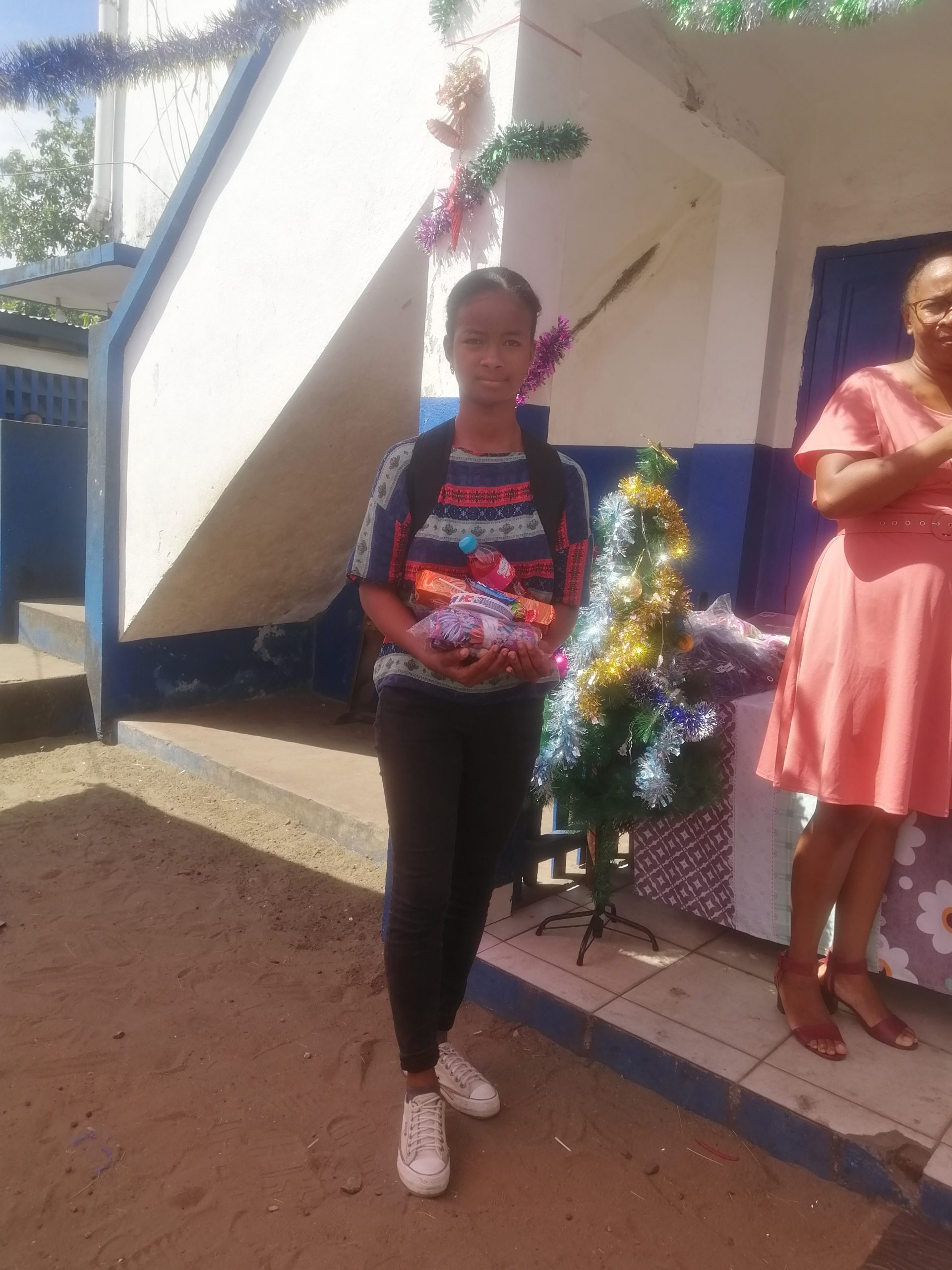 Pour les enfants en famille nous avons donné comme cadeaux : vêtement pour chacun et plus jouets pour les enfants en classe primaire. Pour les goûters : une boisson, une boîte de fromage, un biscuit GM, un chocolat et des bonbons sucettes.