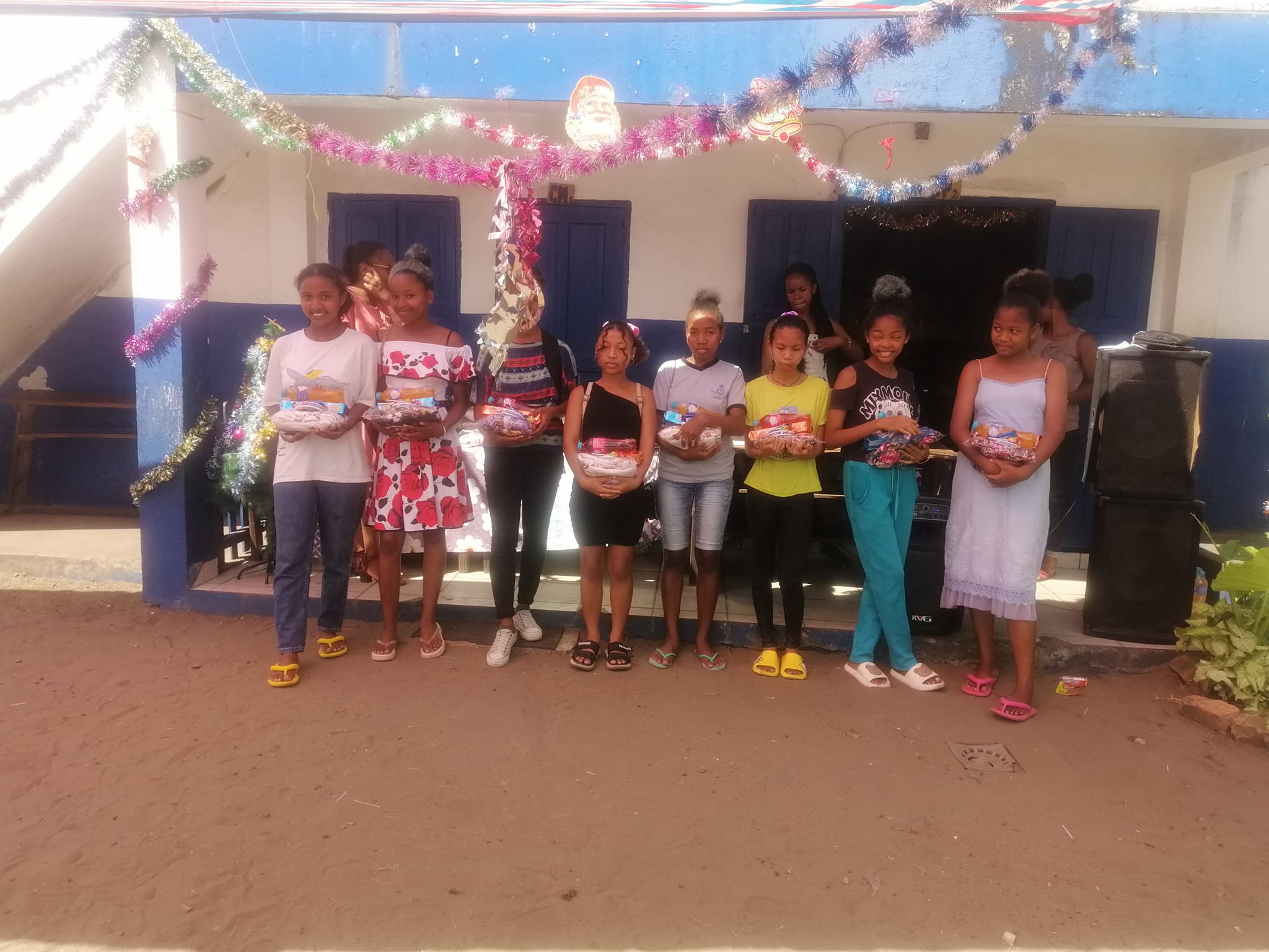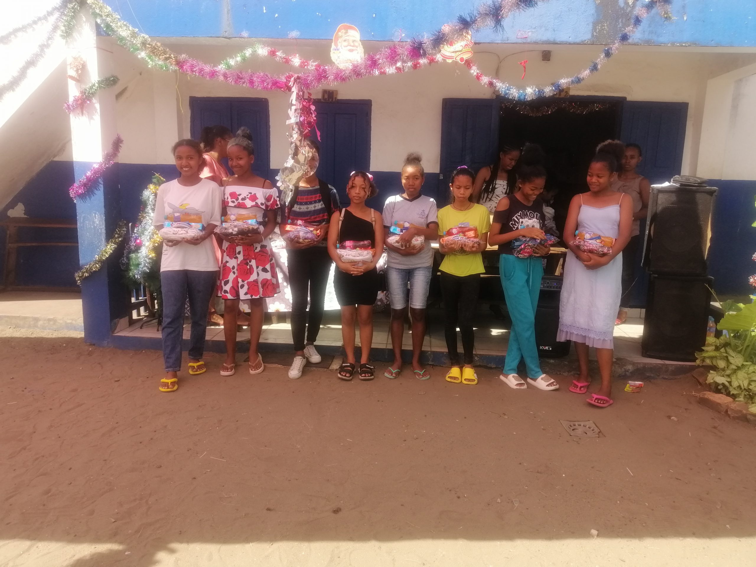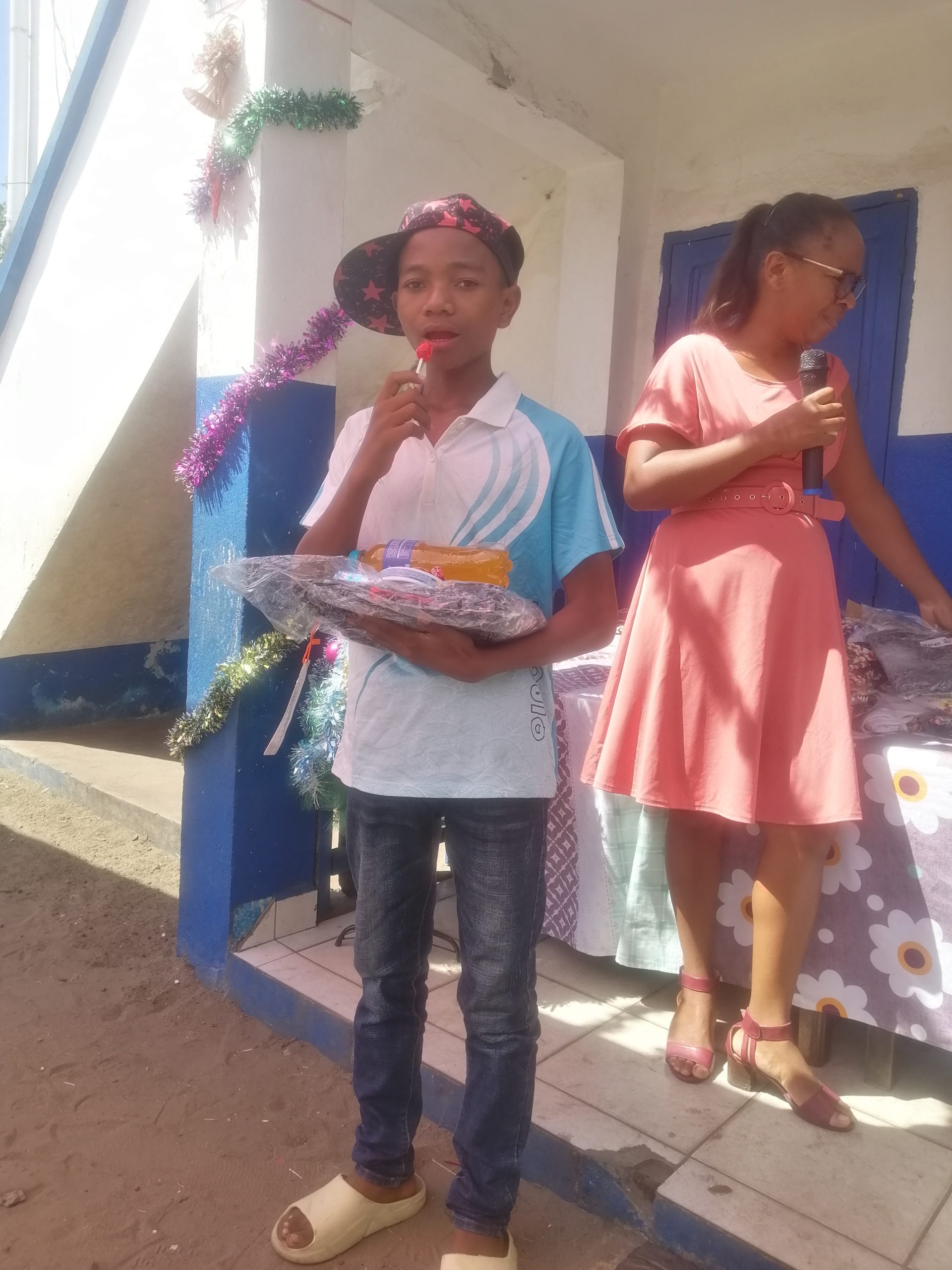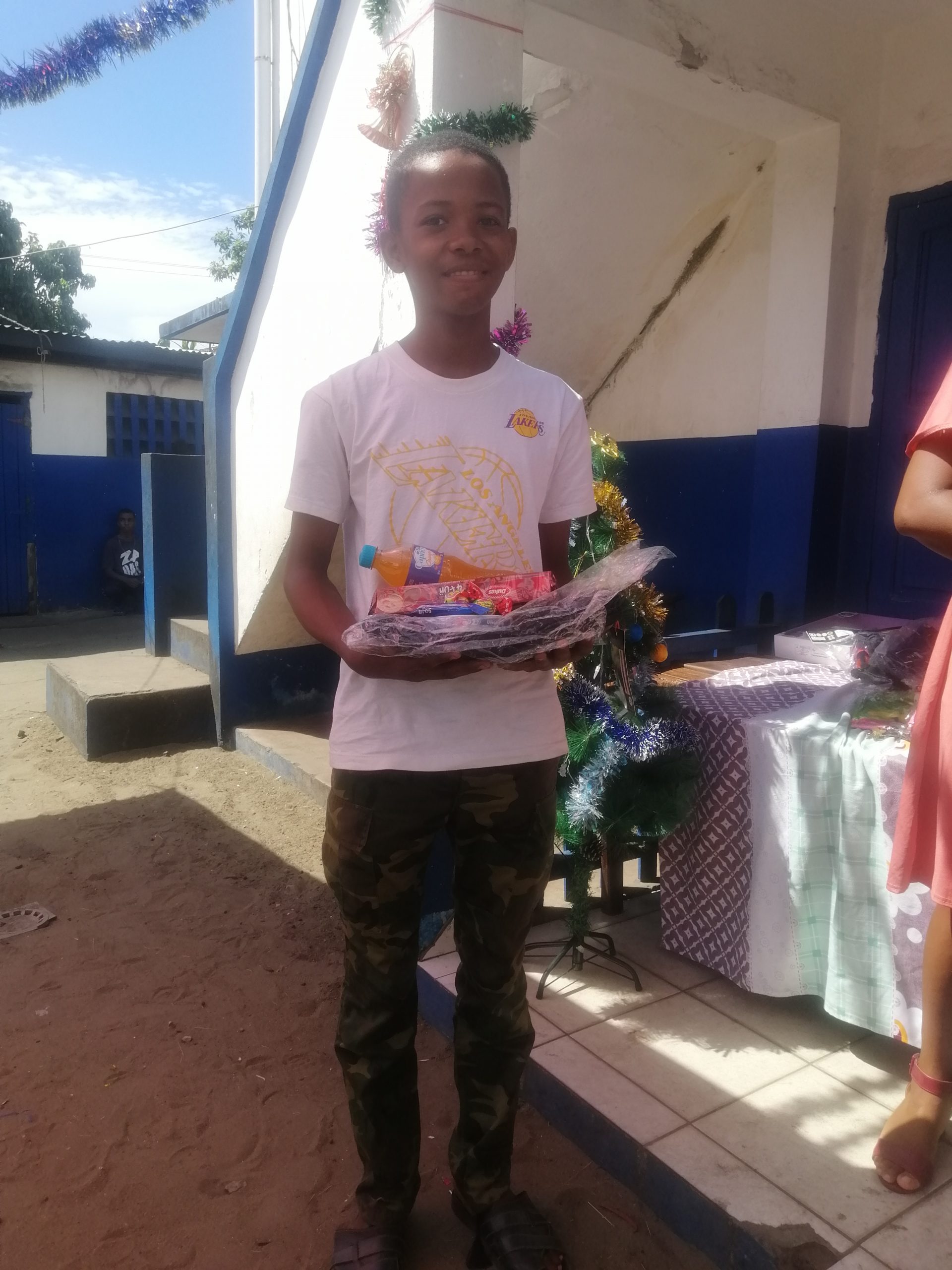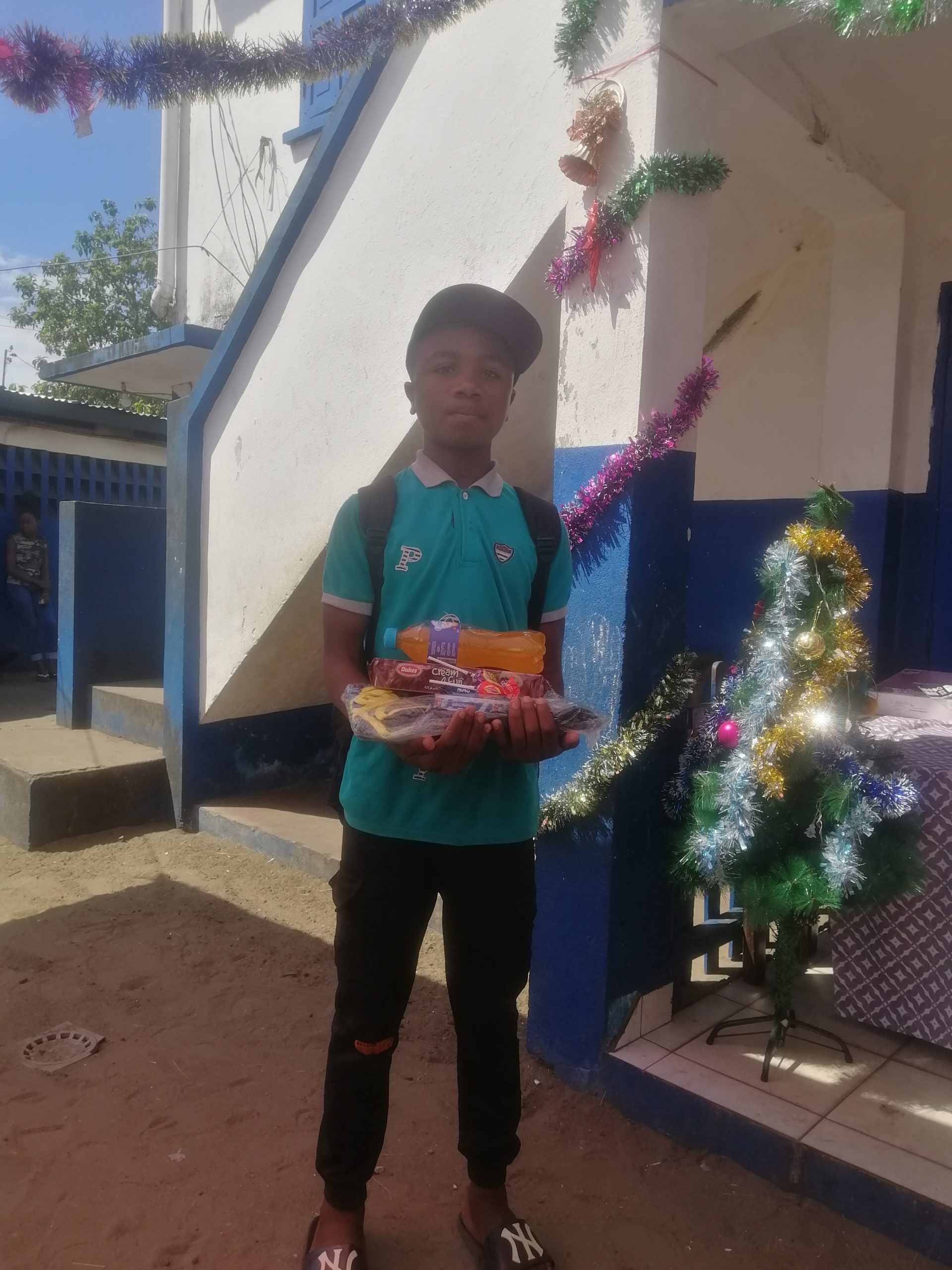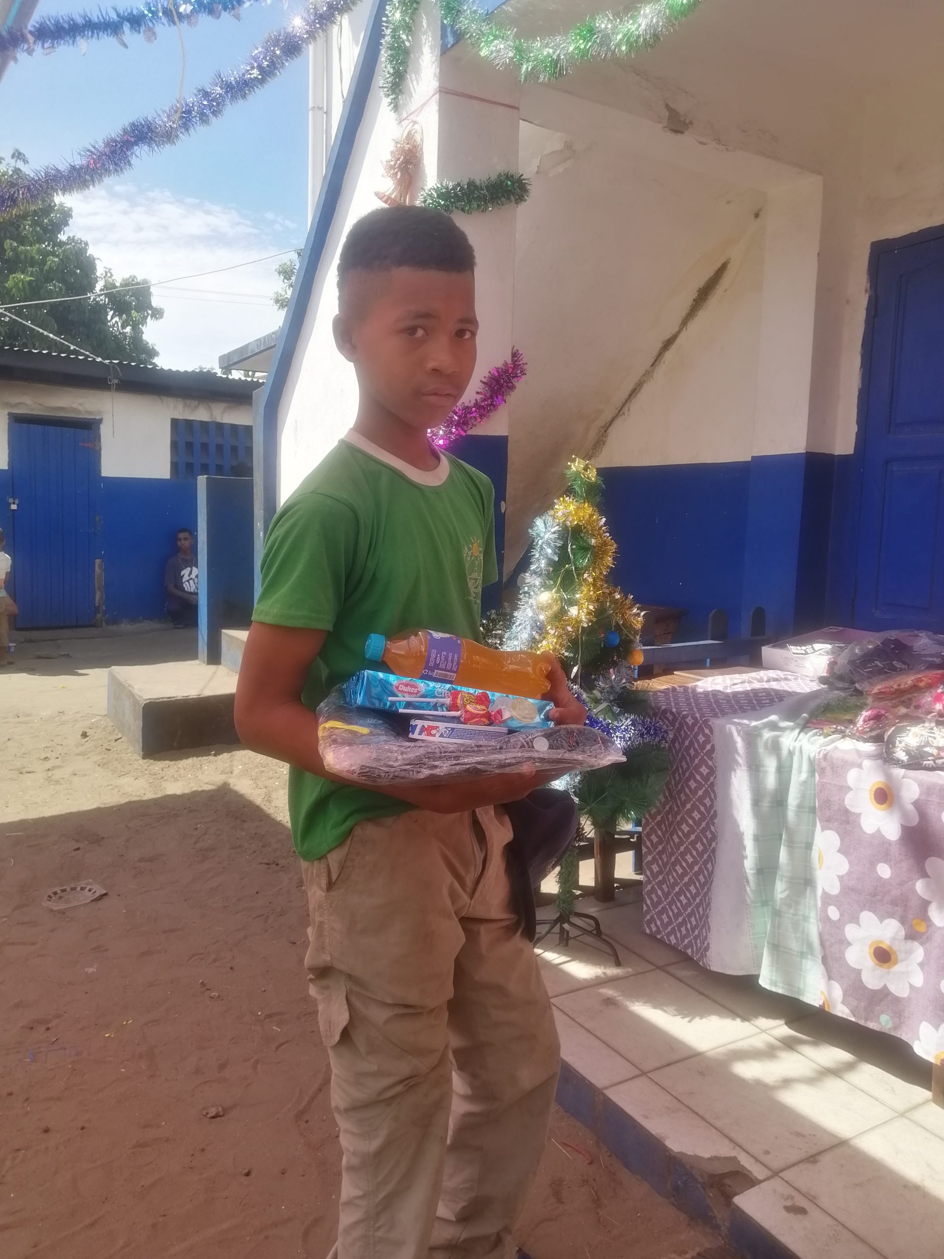 Pour les enfants en famille nous avons donné comme cadeaux : vêtement pour chacun et plus jouets pour les enfants en classe primaire. Pour les goûters : une boisson, une boîte de fromage, un biscuit GM, un chocolat et des bonbons sucettes.