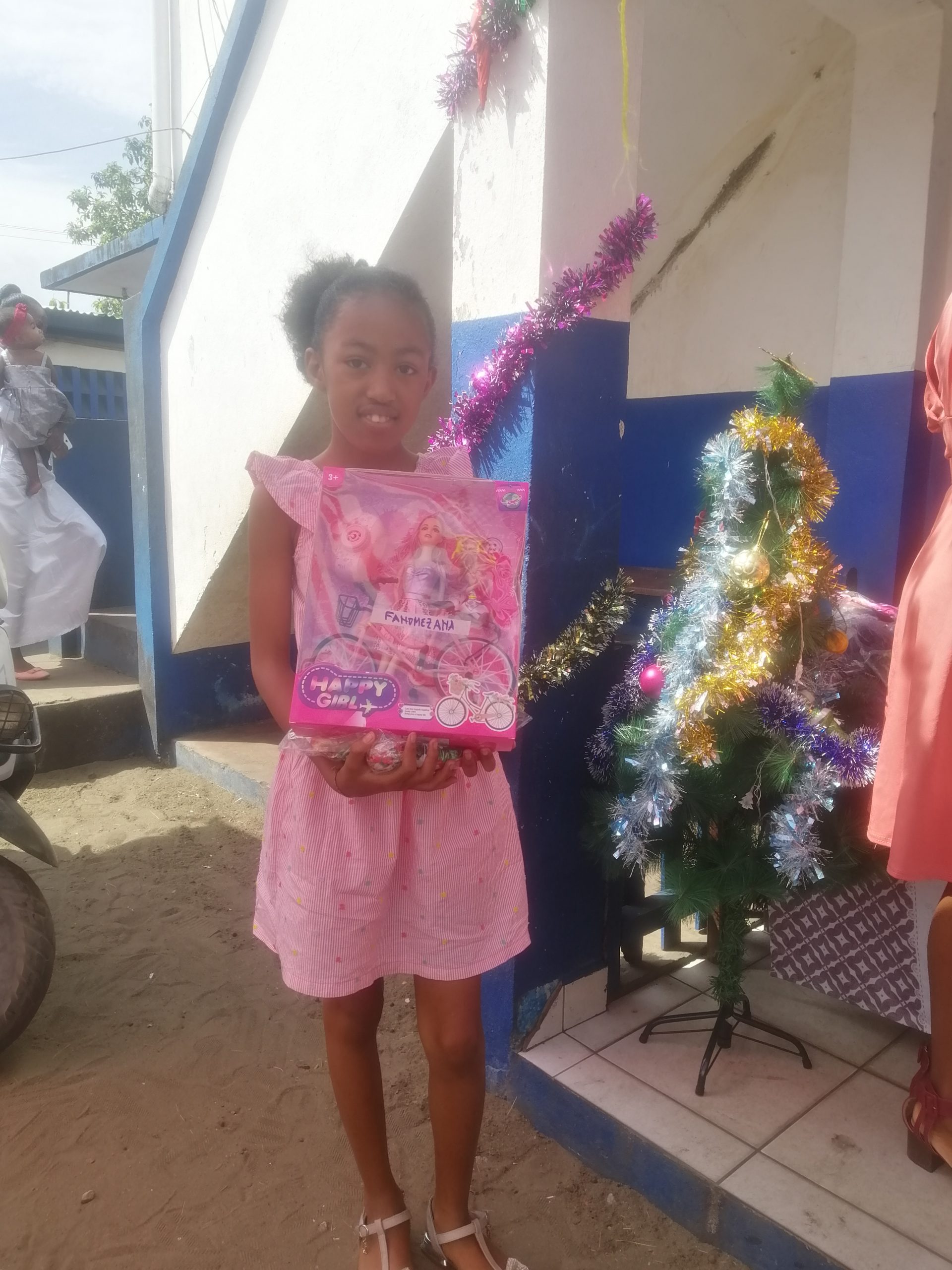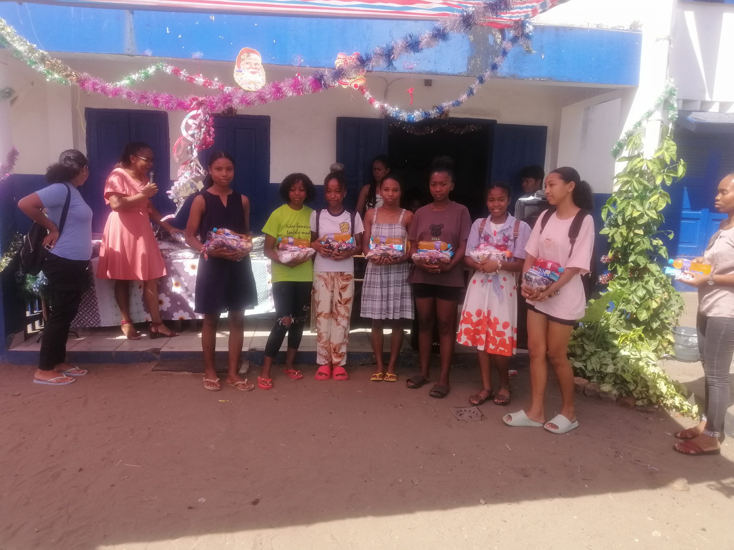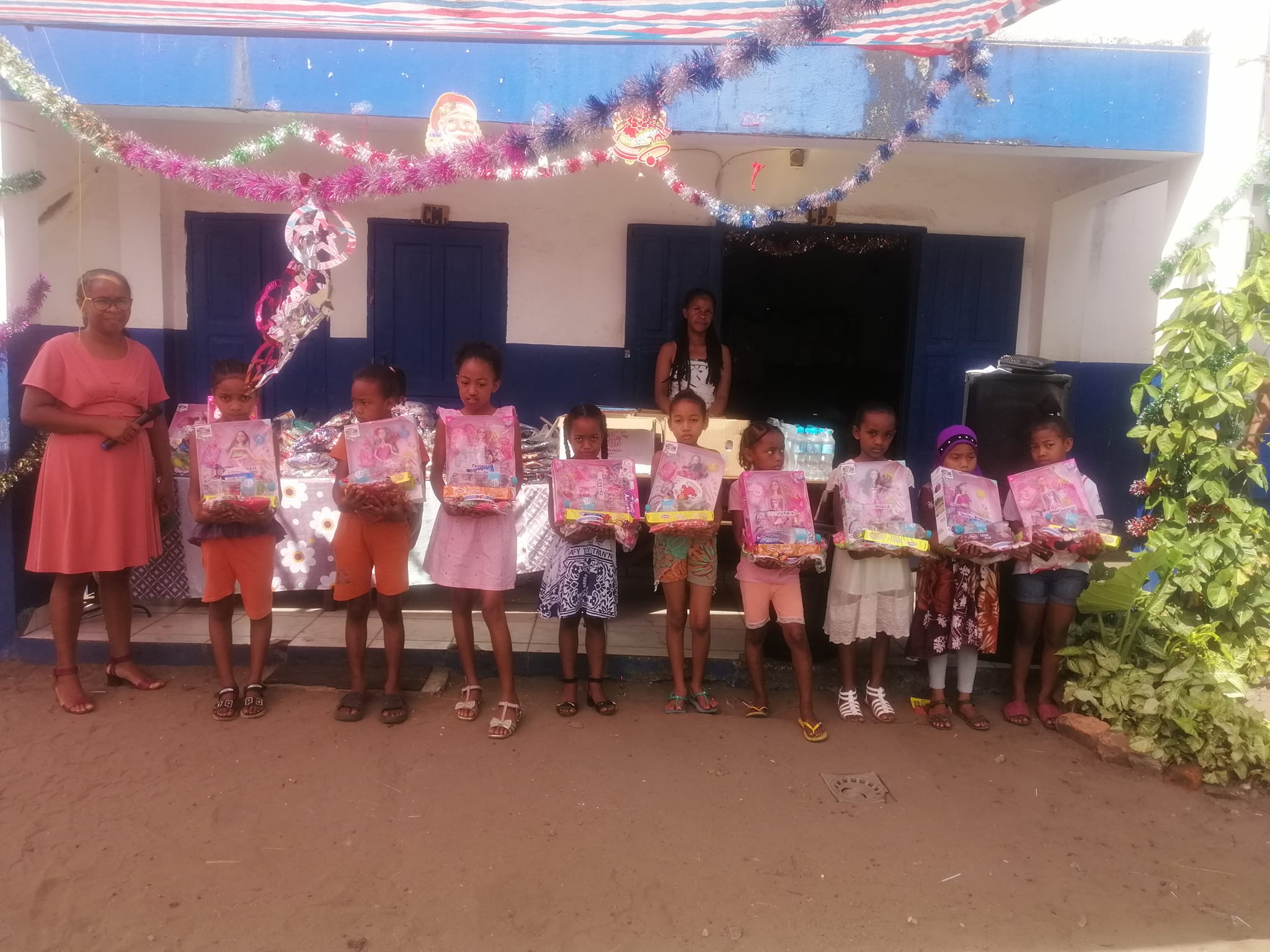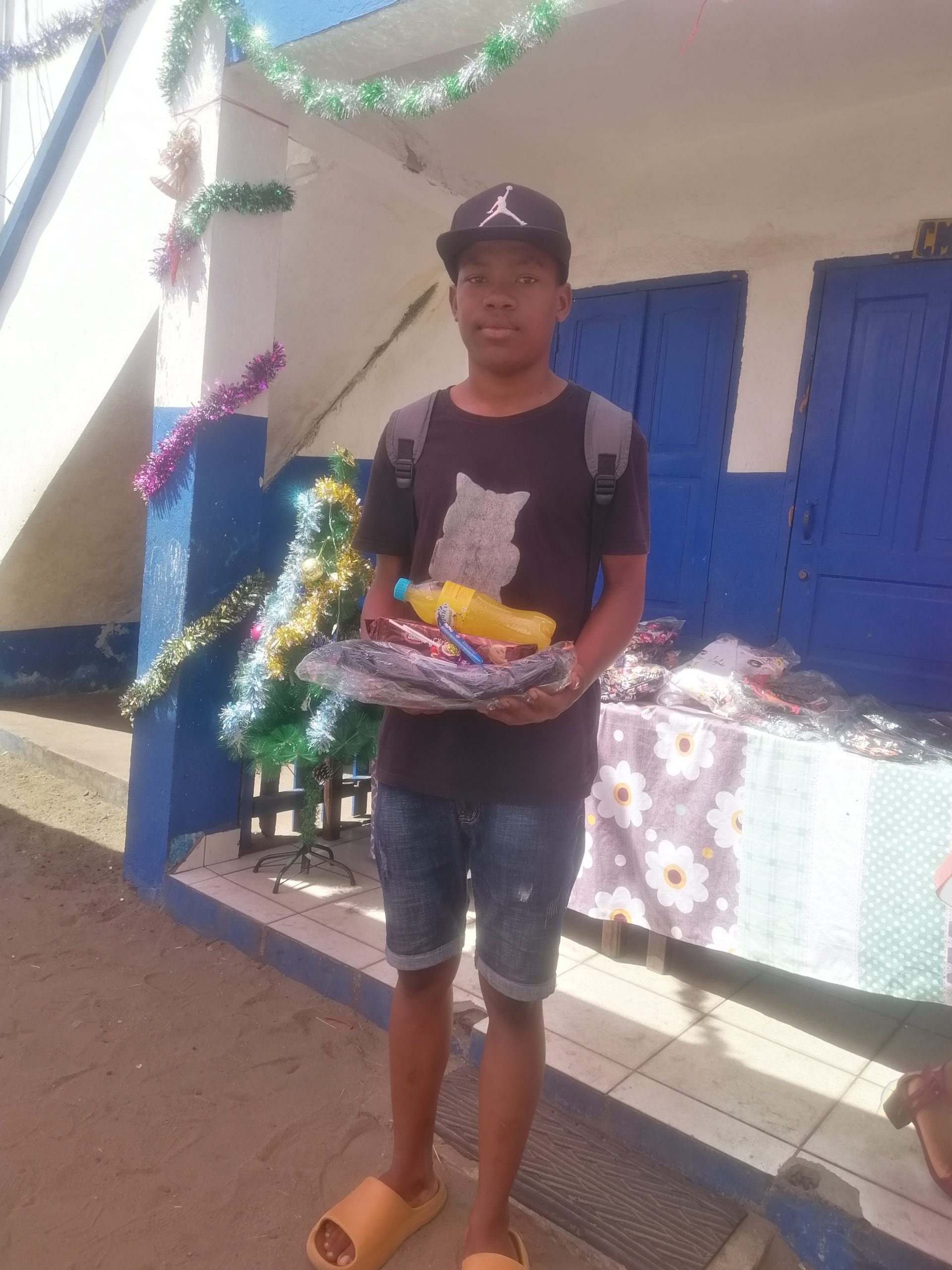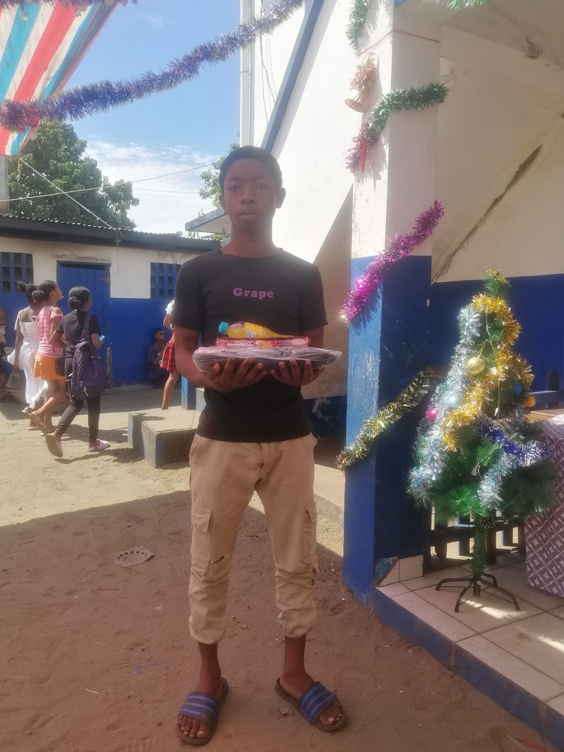 Pour les enfants en famille nous avons donné comme cadeaux : vêtement pour chacun et plus jouets pour les enfants en classe primaire. Pour les goûters : une boisson, une boîte de fromage, un biscuit GM, un chocolat et des bonbons sucettes.