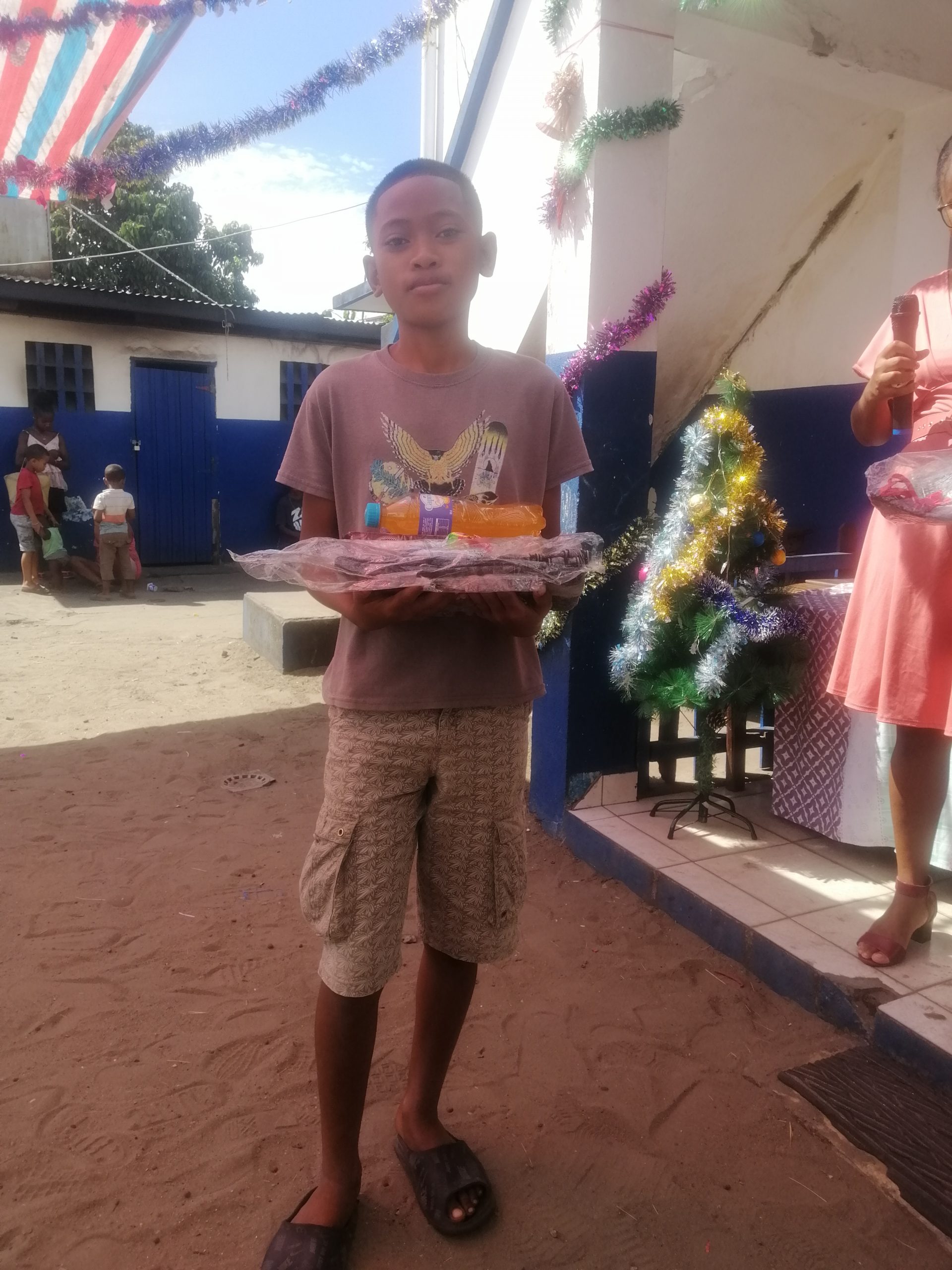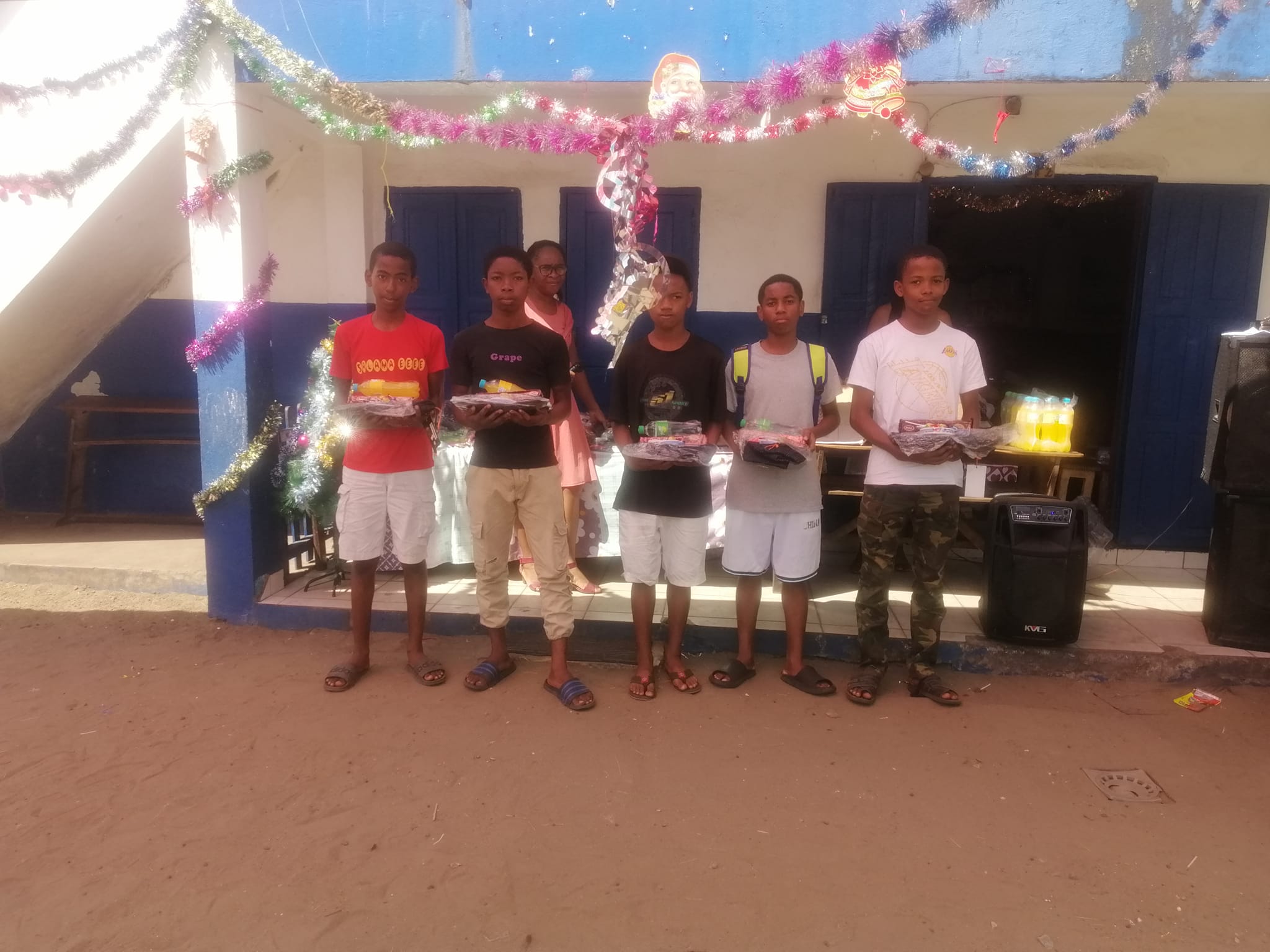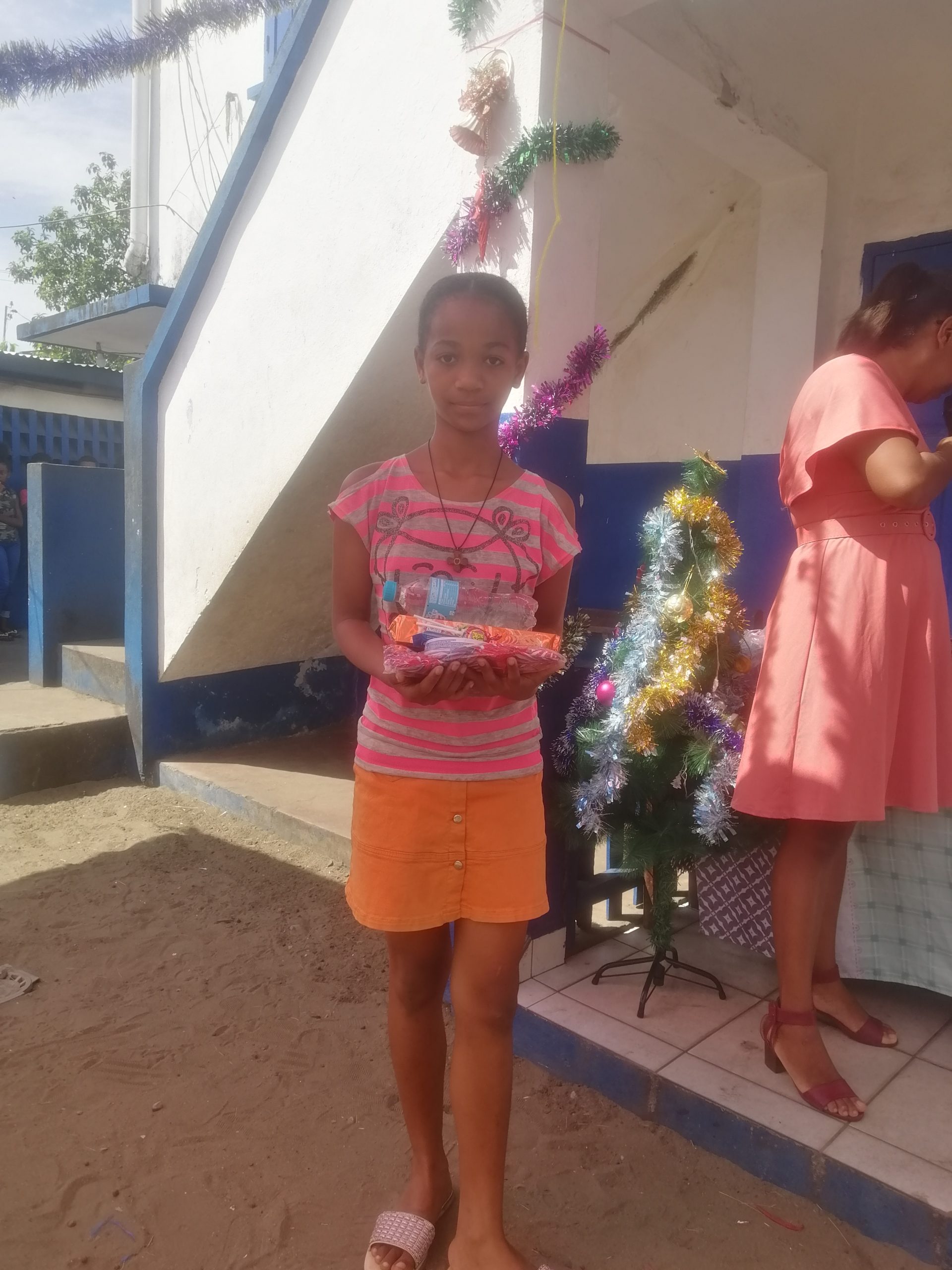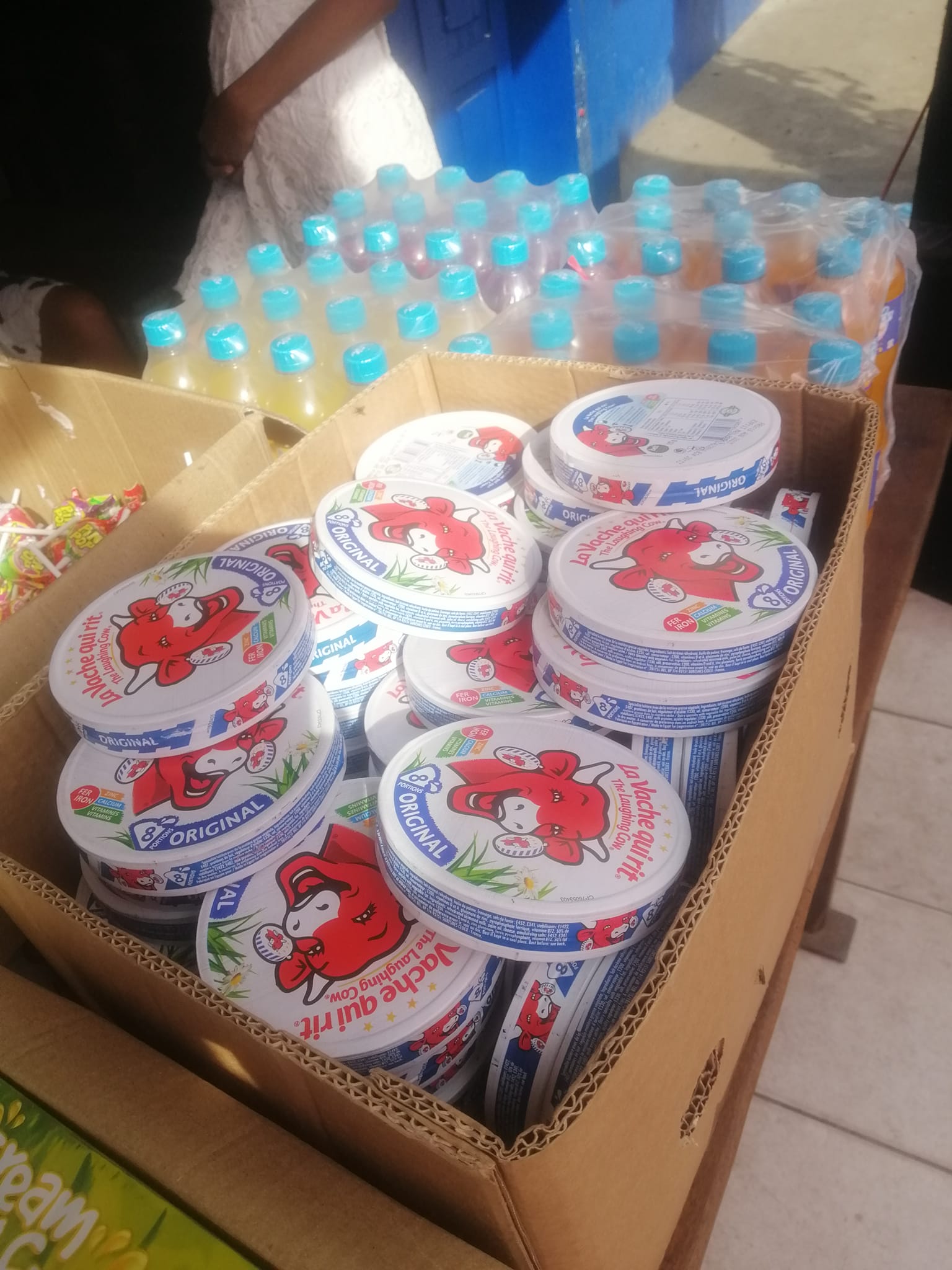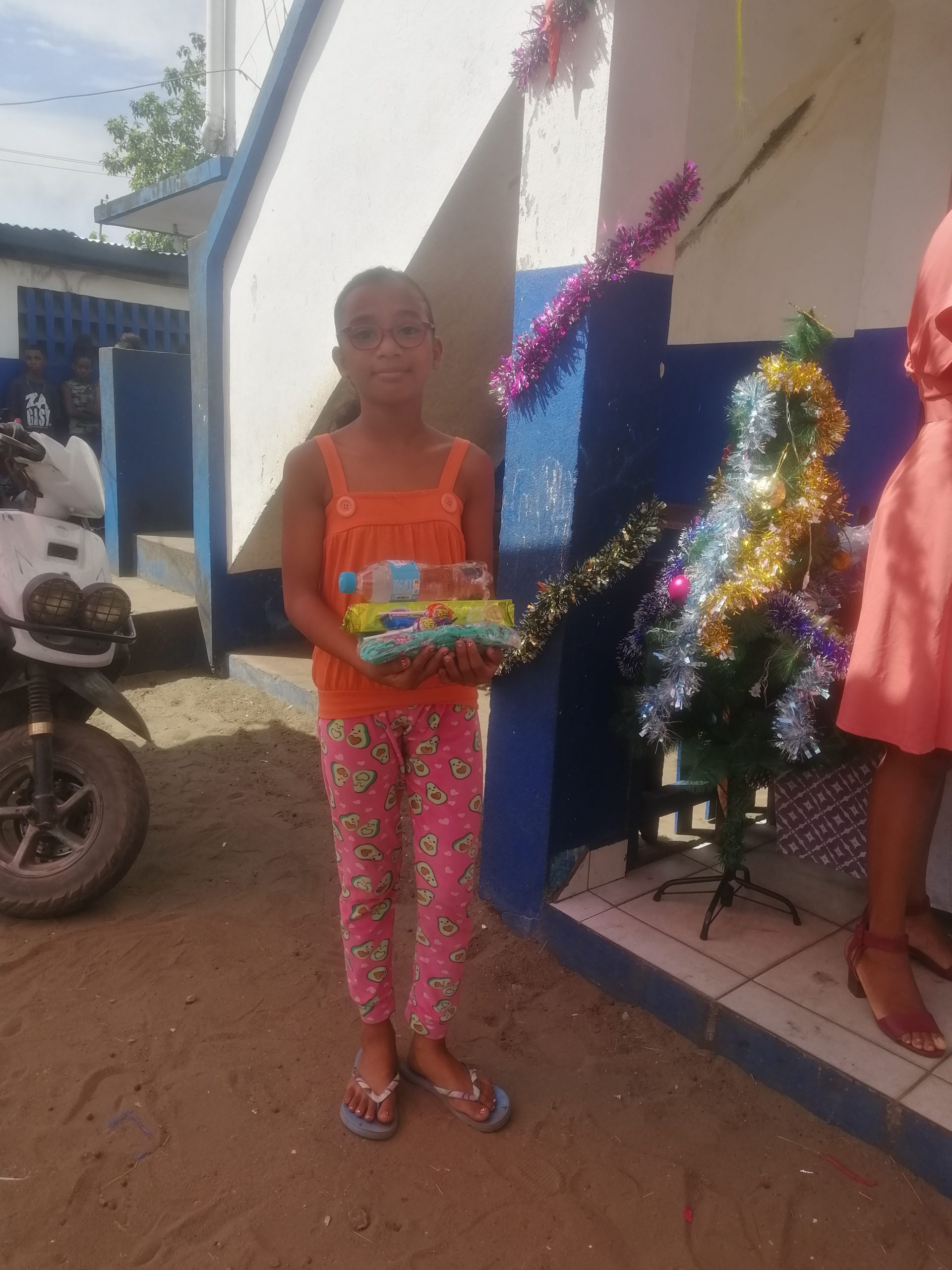 Pour les enfants en famille nous avons donné comme cadeaux : vêtement pour chacun et plus jouets pour les enfants en classe primaire. Pour les goûters : une boisson, une boîte de fromage, un biscuit GM, un chocolat et des bonbons sucettes.