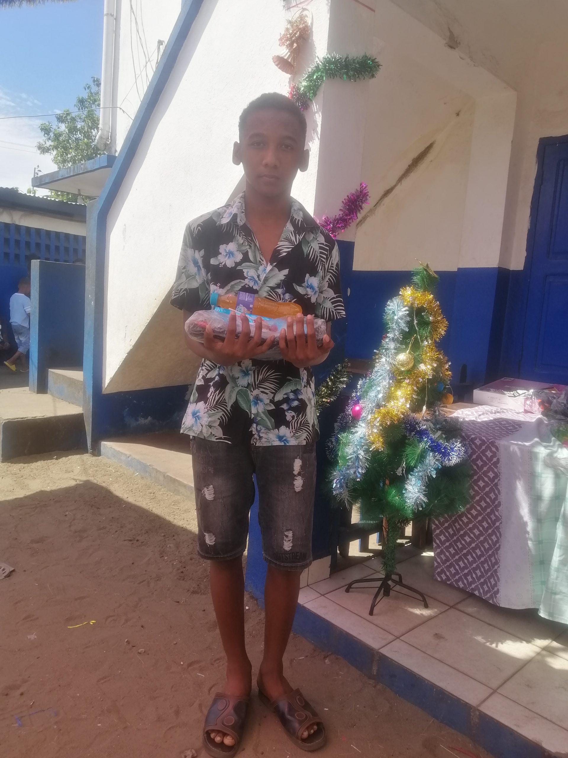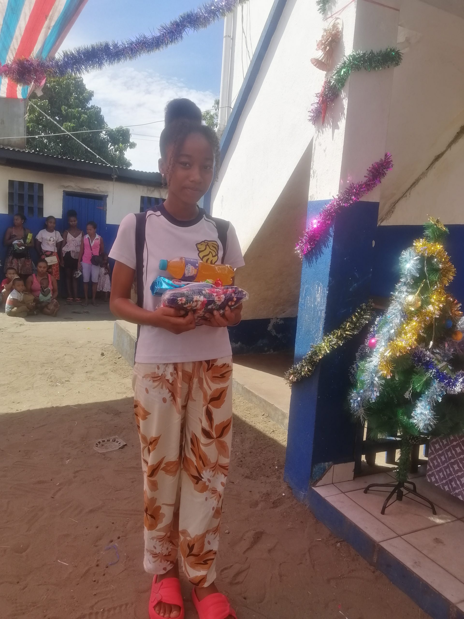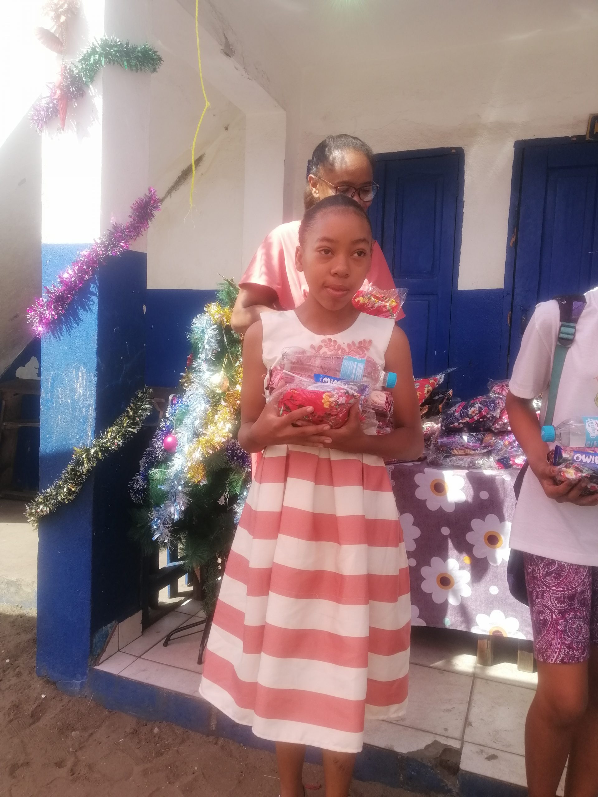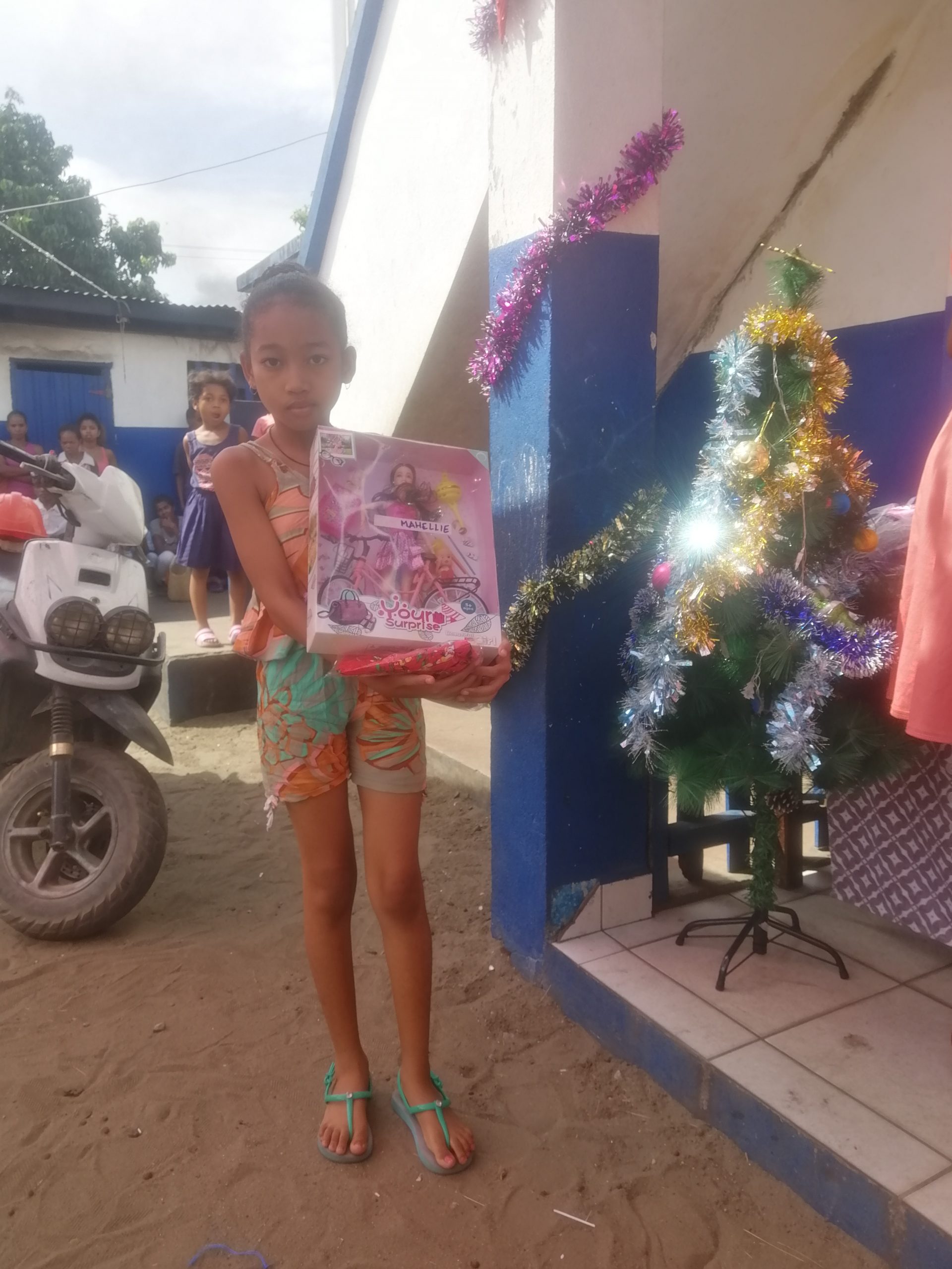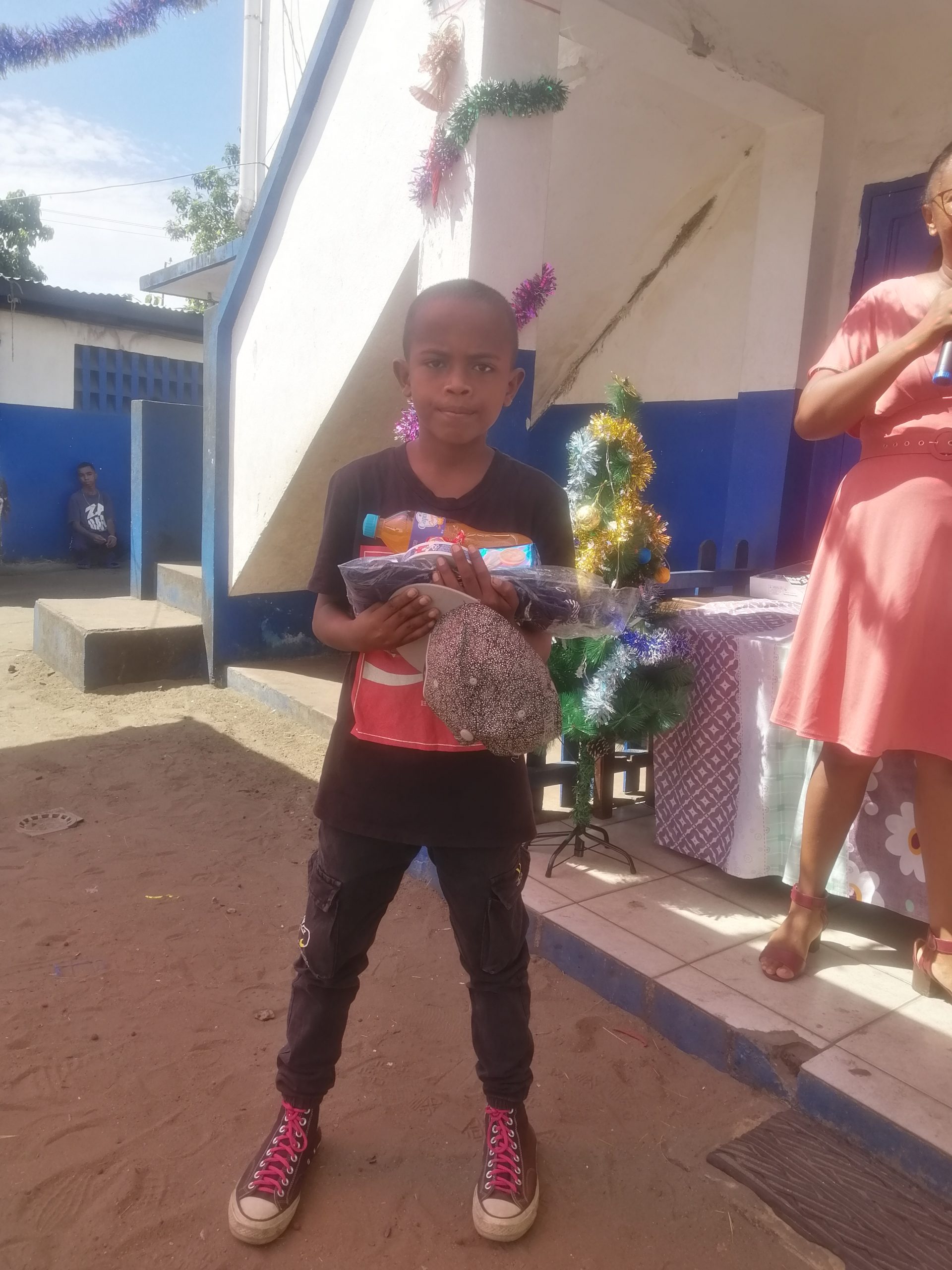 Pour les enfants en famille nous avons donné comme cadeaux : vêtement pour chacun et plus jouets pour les enfants en classe primaire. Pour les goûters : une boisson, une boîte de fromage, un biscuit GM, un chocolat et des bonbons sucettes.