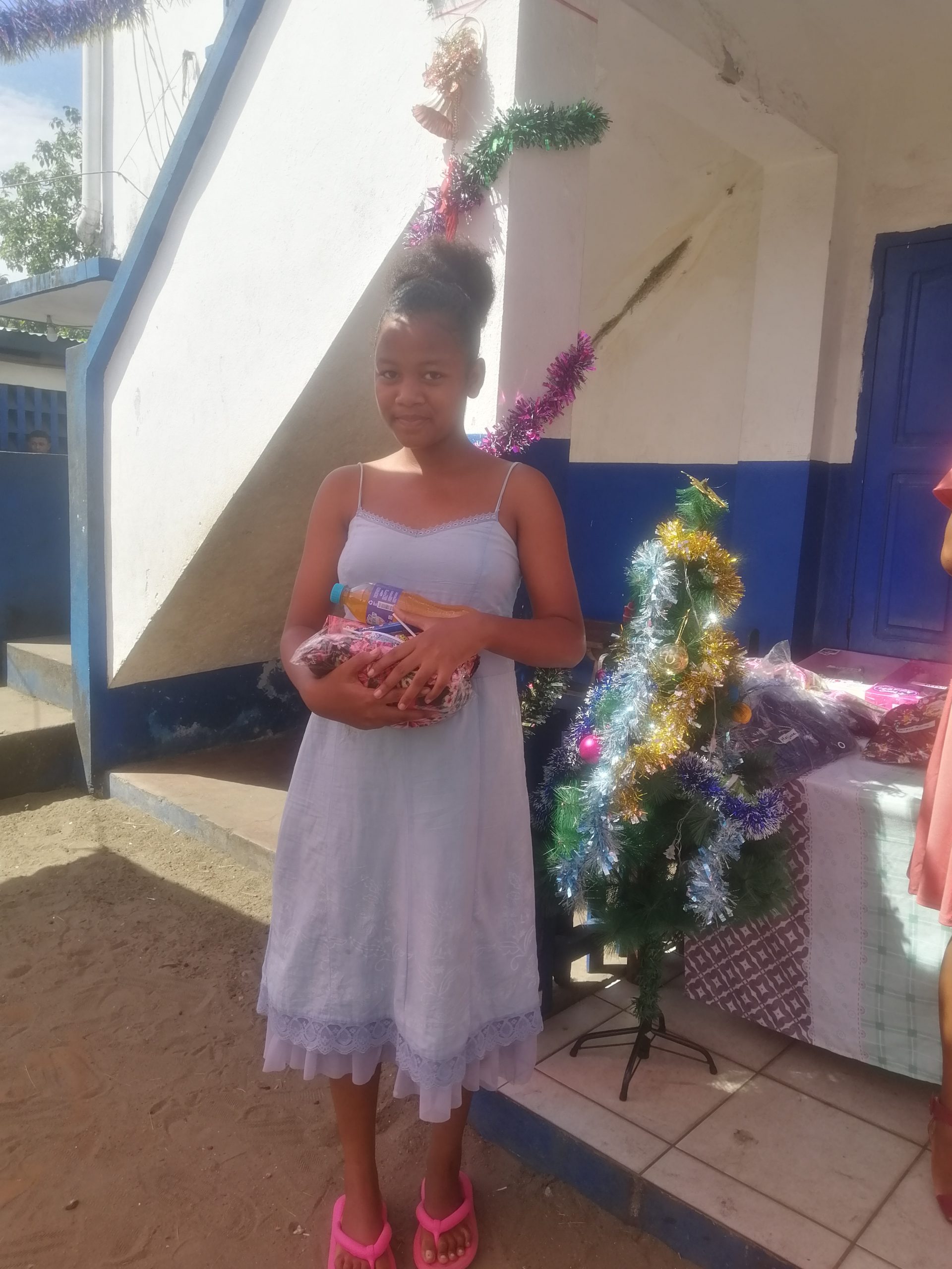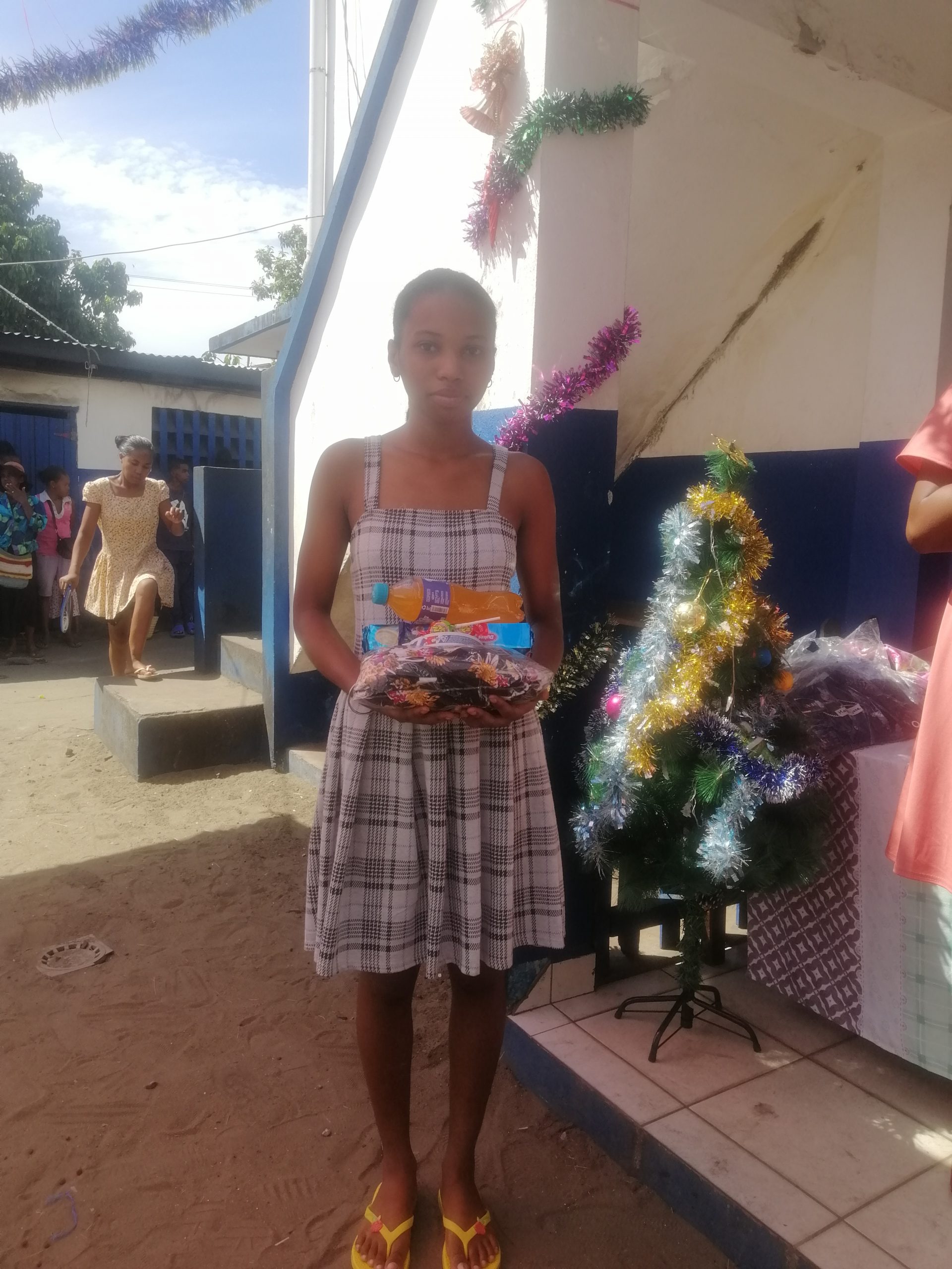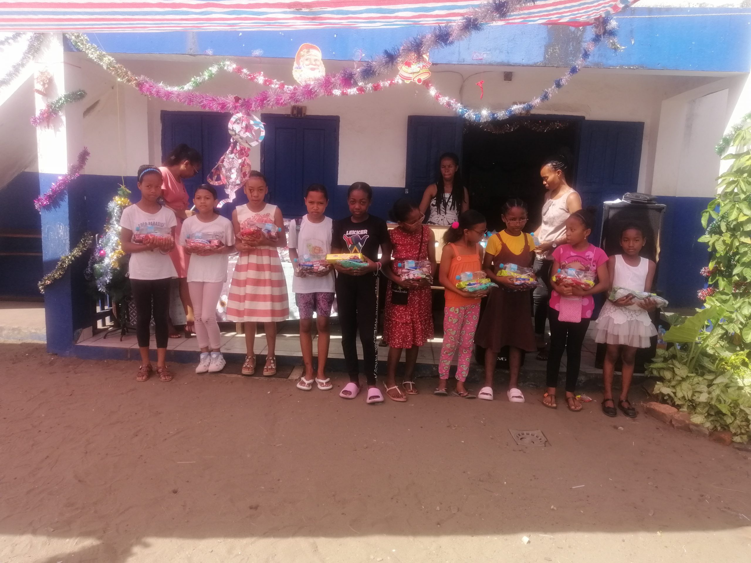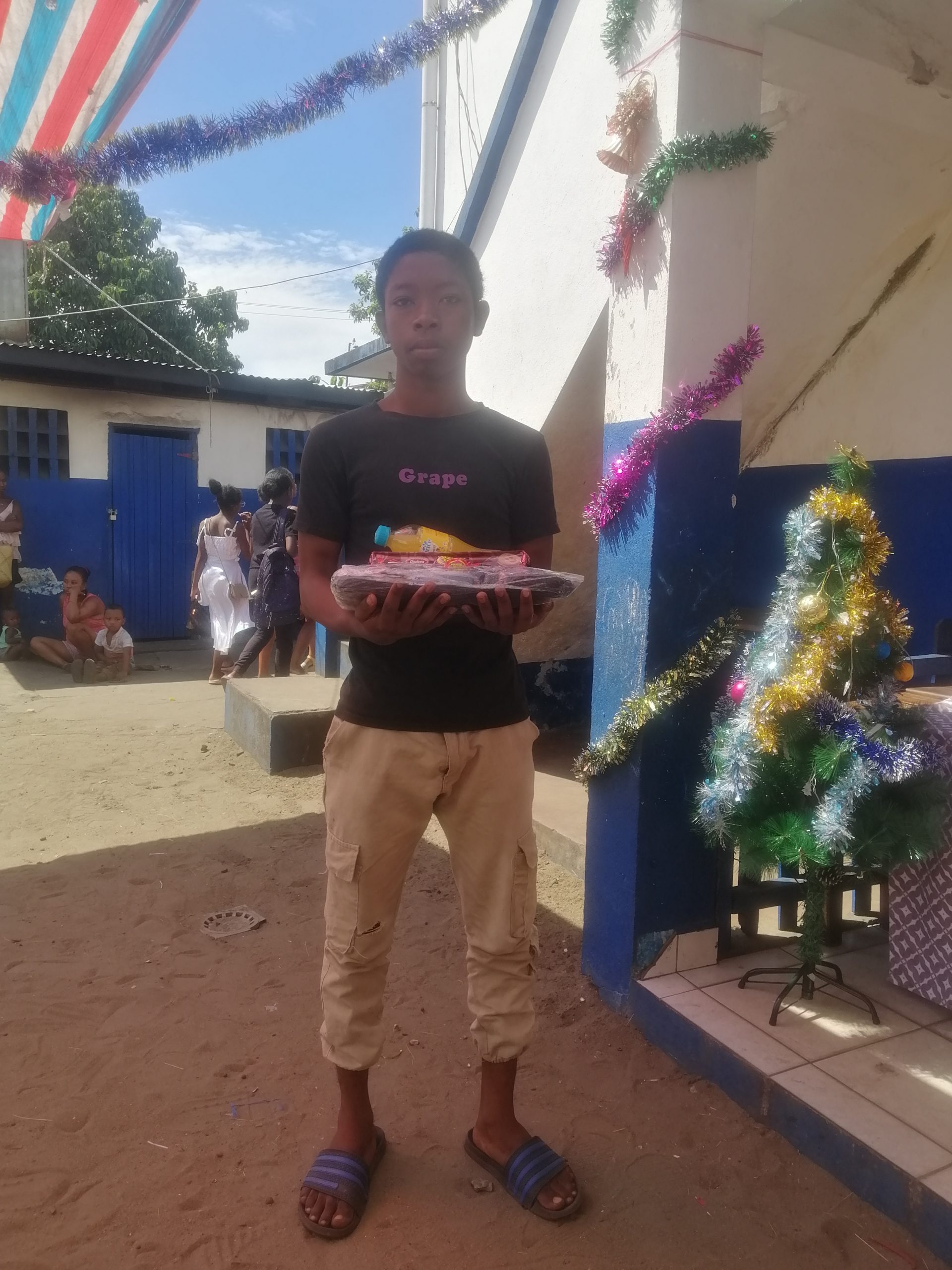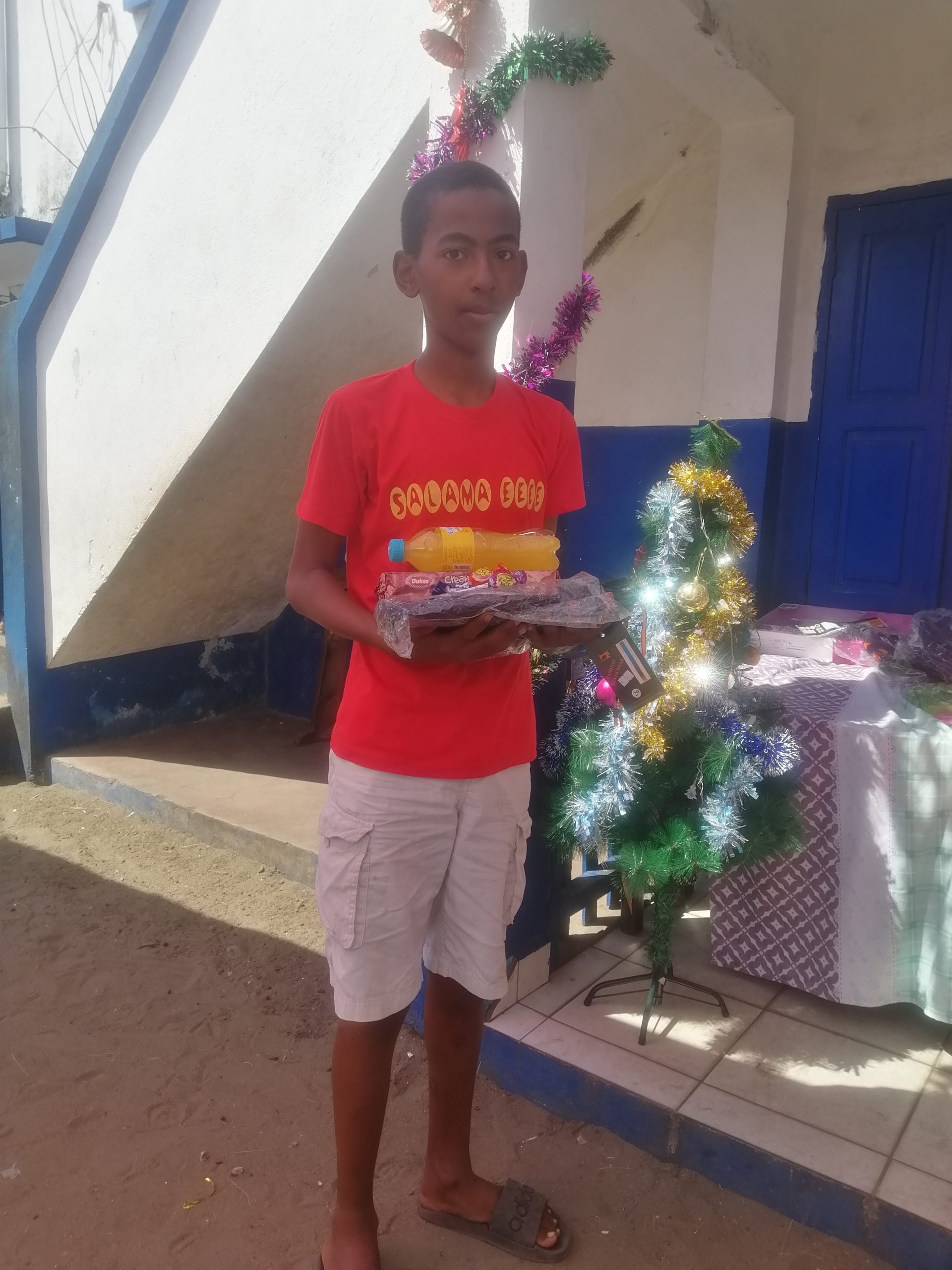 Pour les enfants en famille nous avons donné comme cadeaux : vêtement pour chacun et plus jouets pour les enfants en classe primaire. Pour les goûters : une boisson, une boîte de fromage, un biscuit GM, un chocolat et des bonbons sucettes.