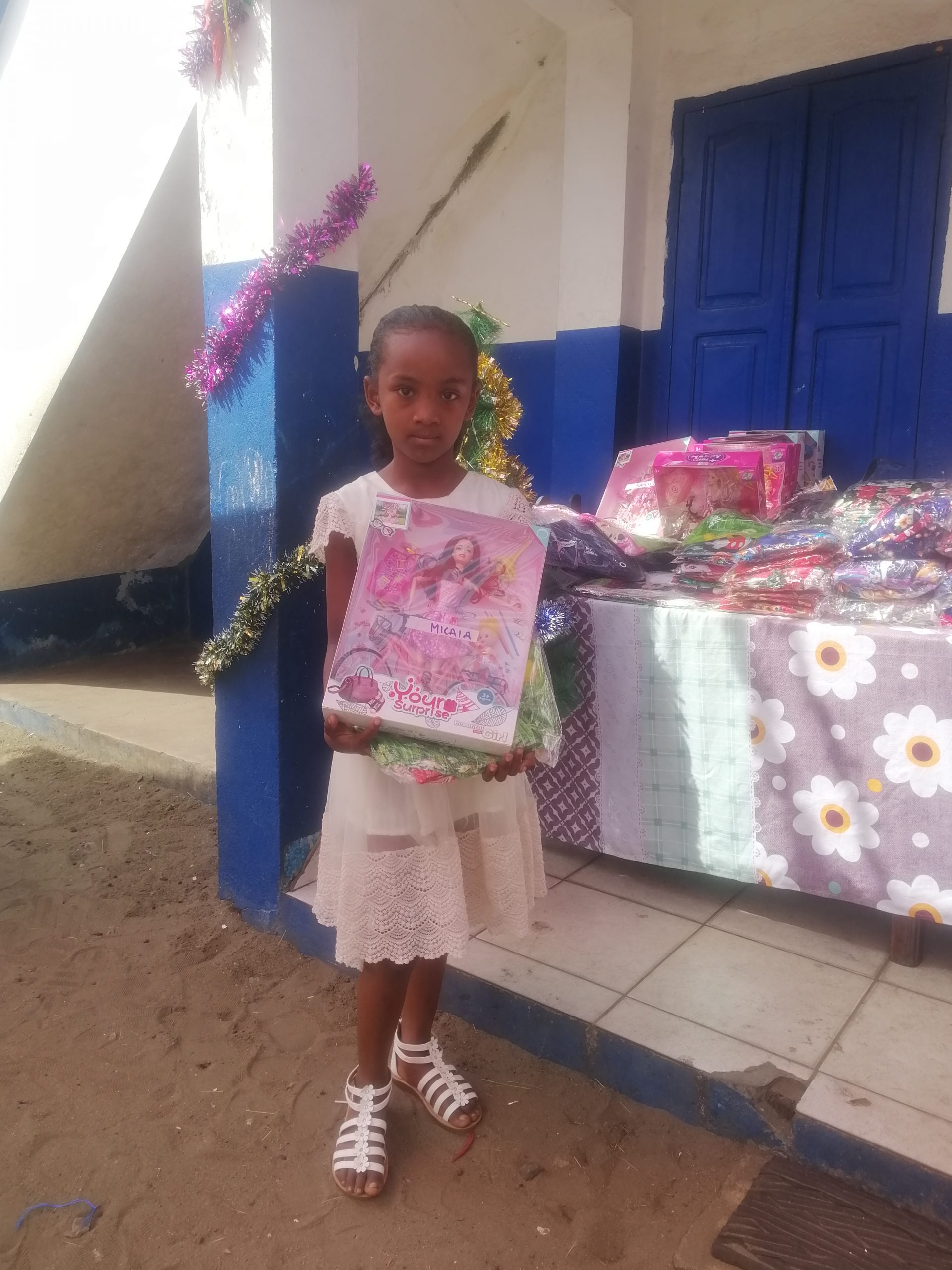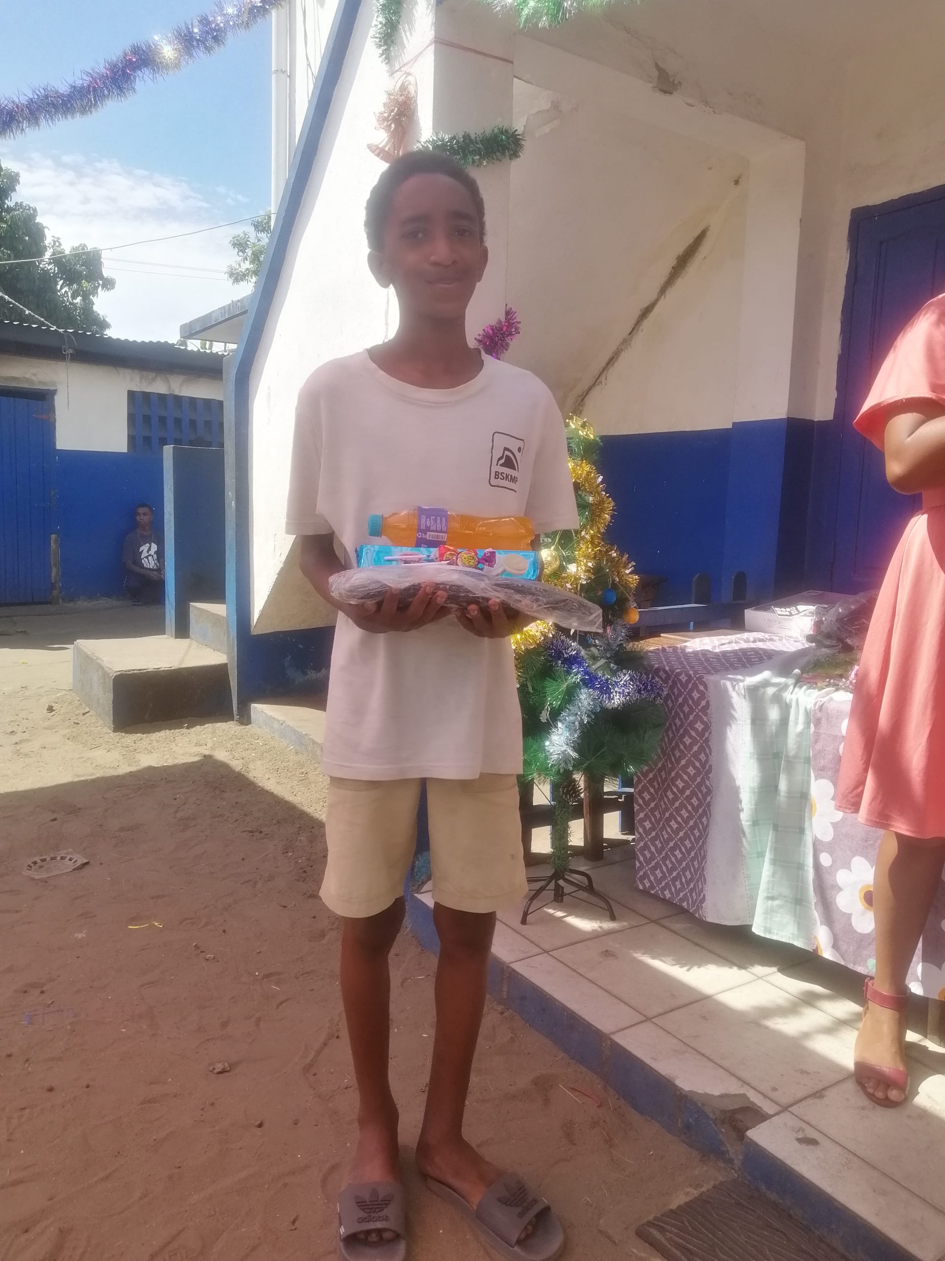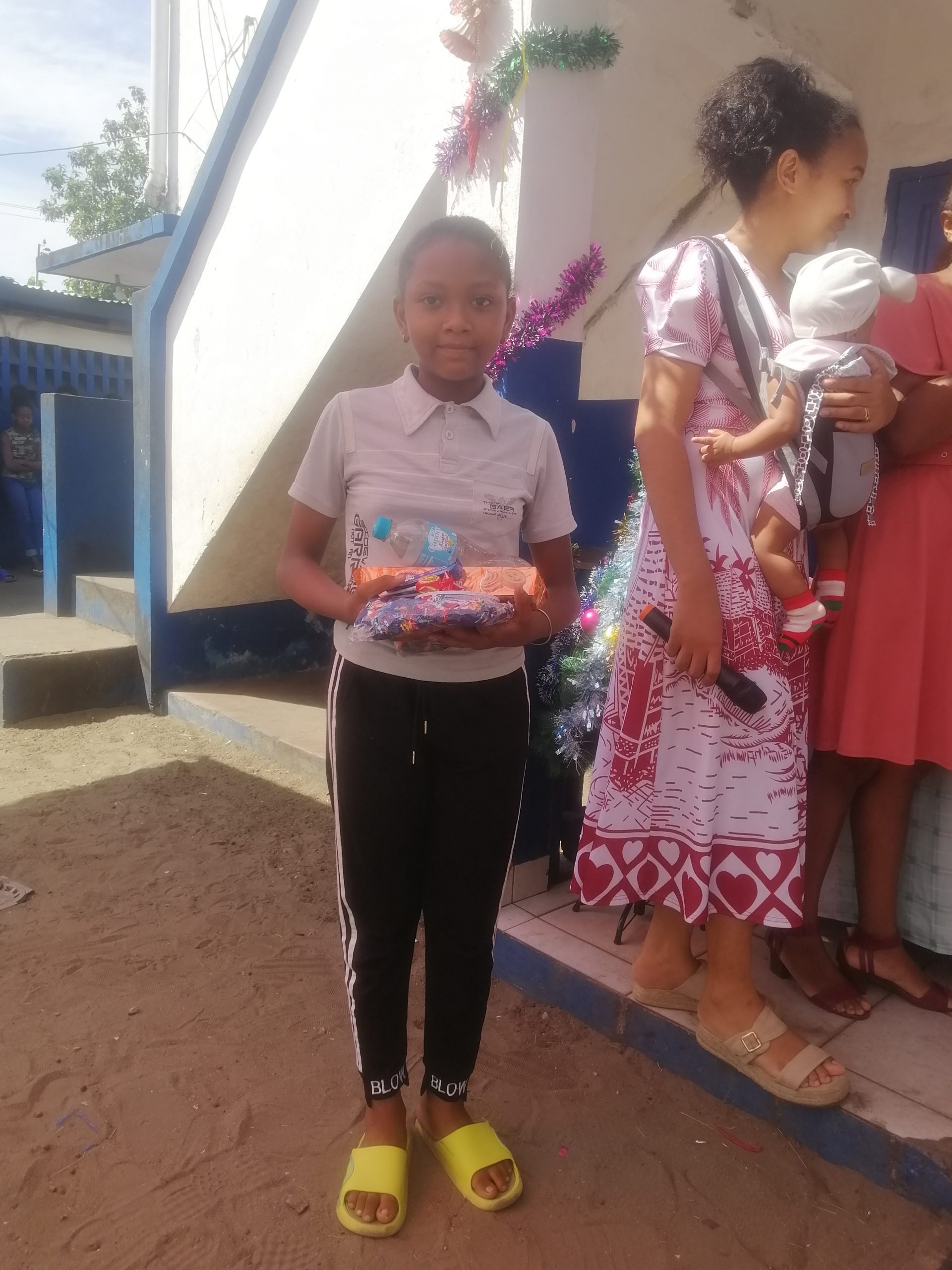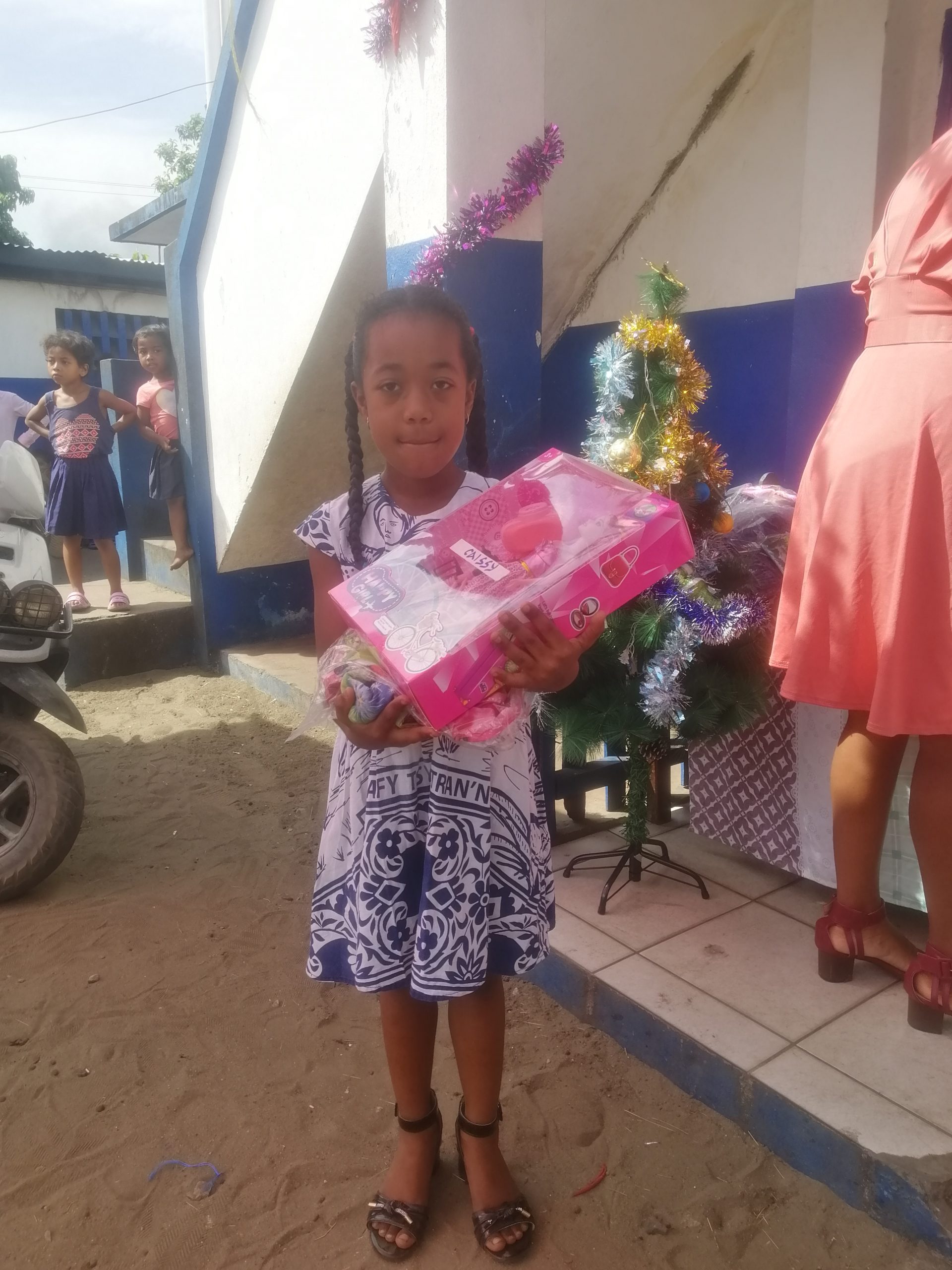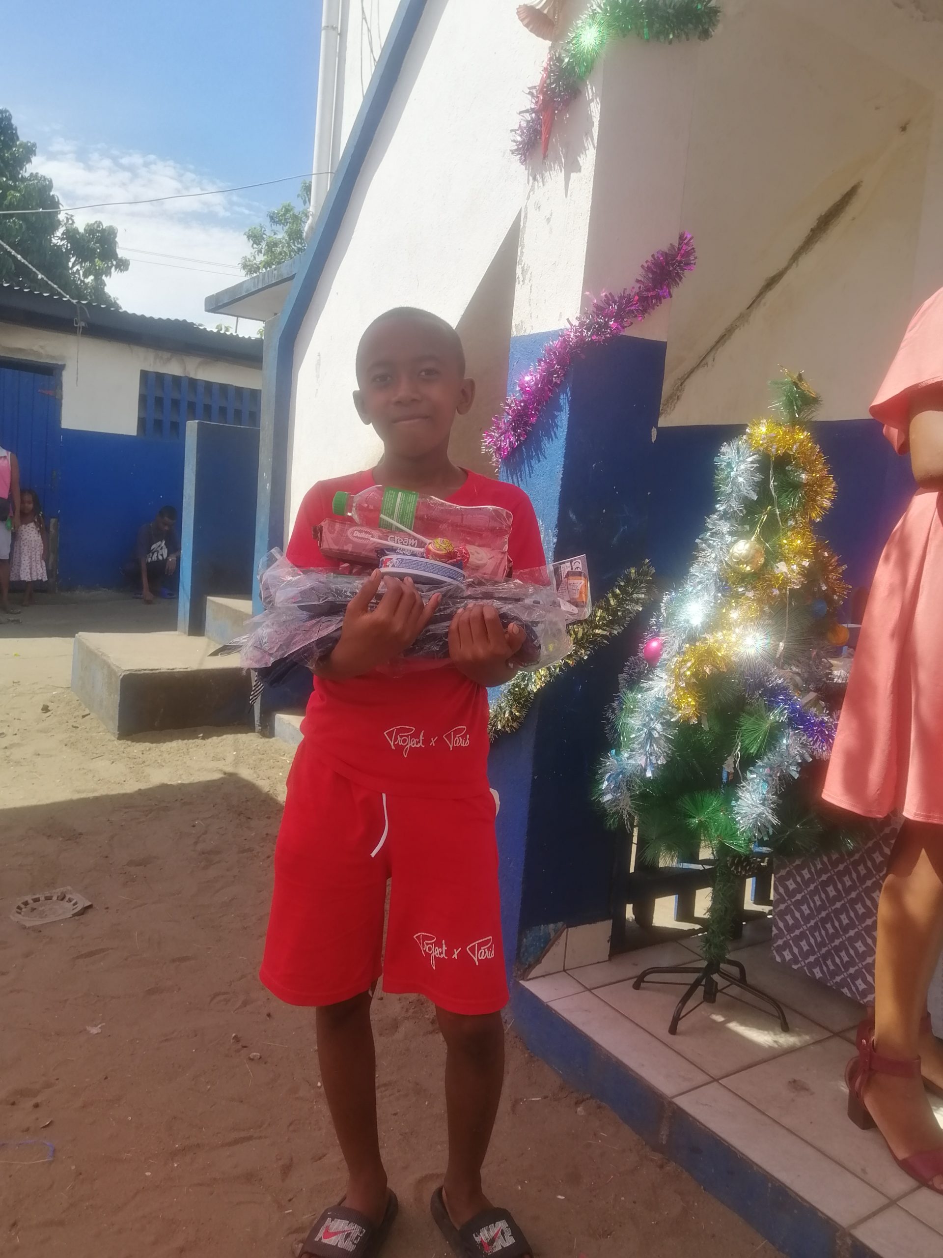 Pour les enfants en famille nous avons donné comme cadeaux : vêtement pour chacun et plus jouets pour les enfants en classe primaire. Pour les goûters : une boisson, une boîte de fromage, un biscuit GM, un chocolat et des bonbons sucettes.