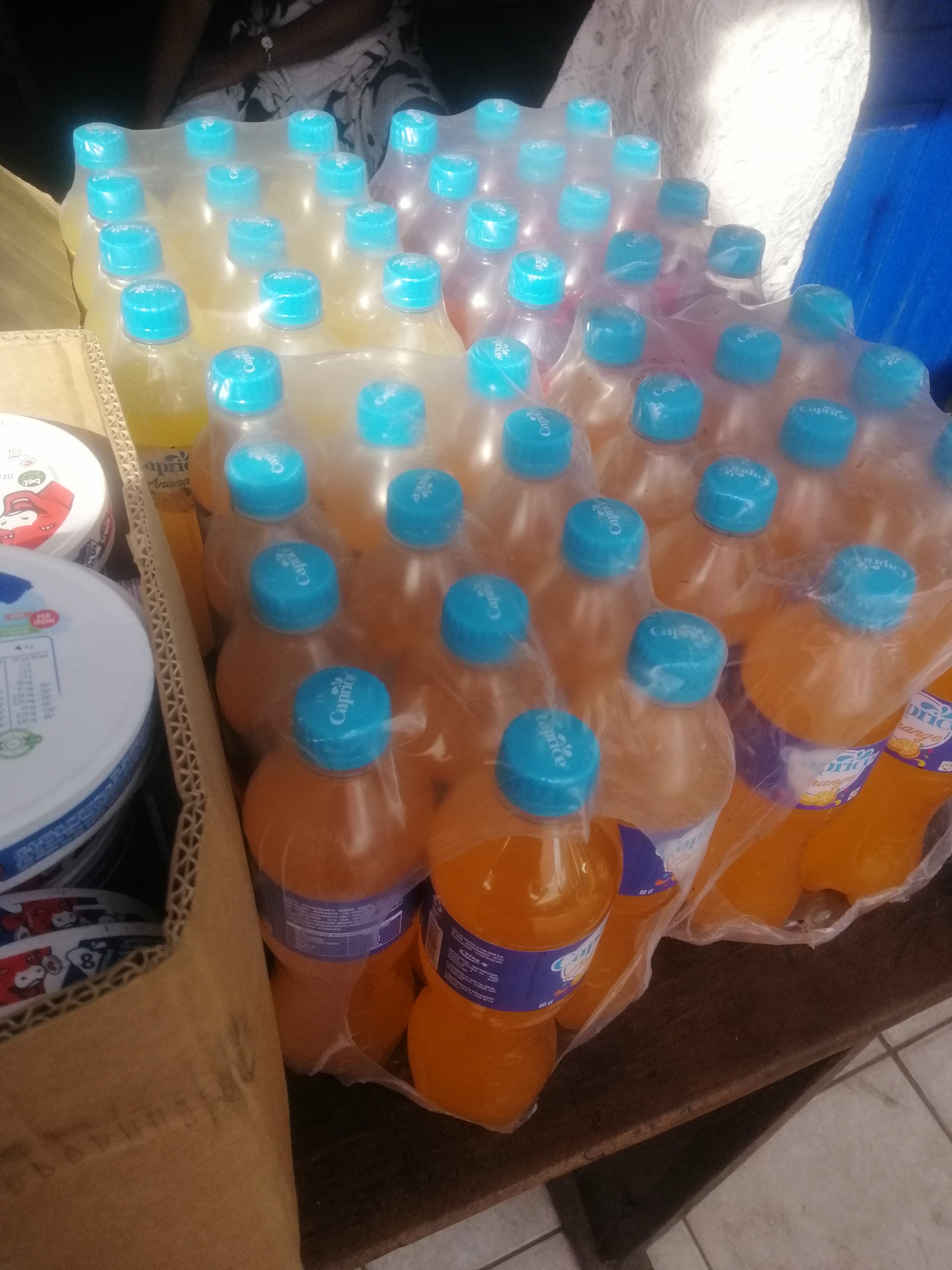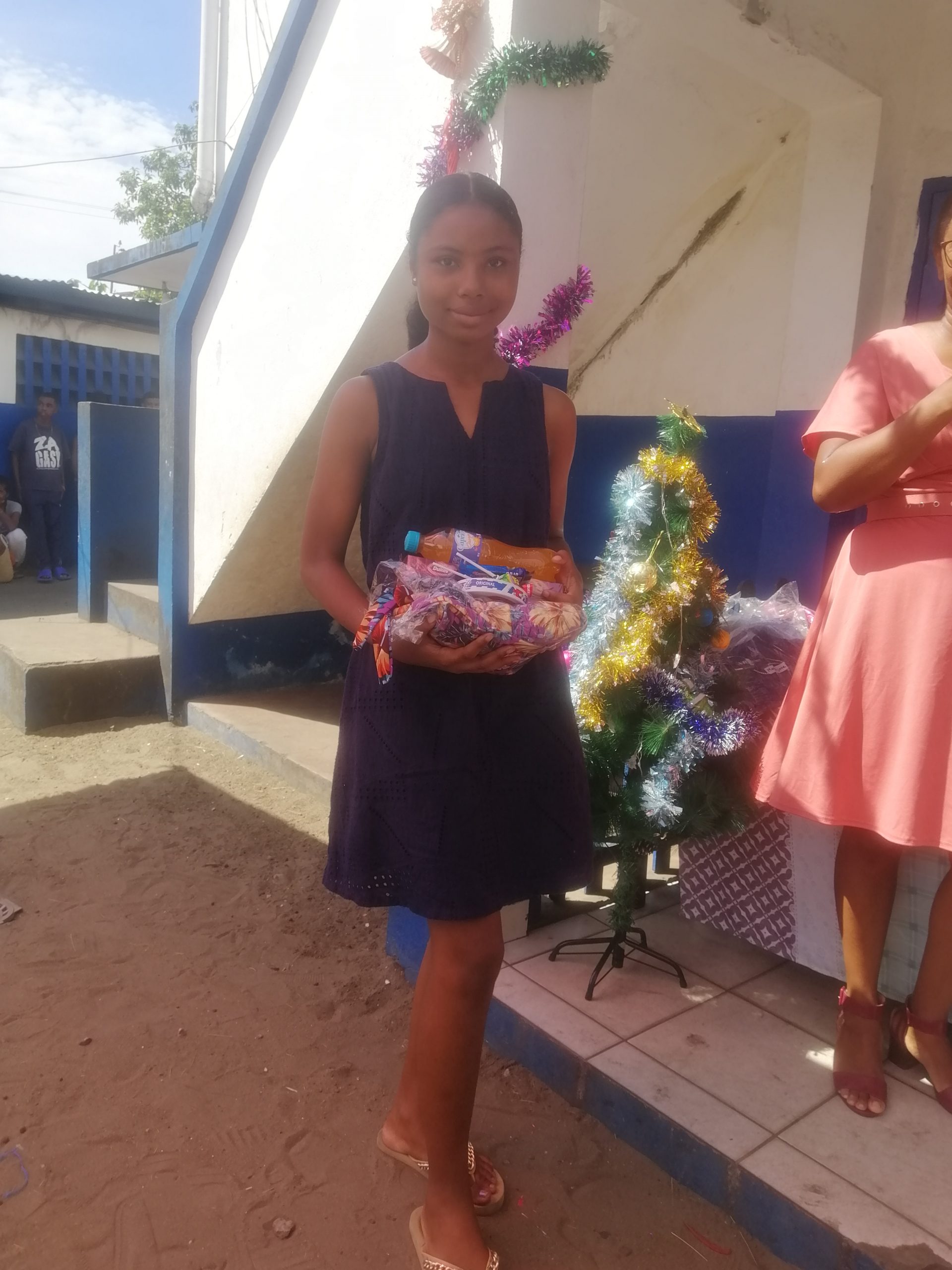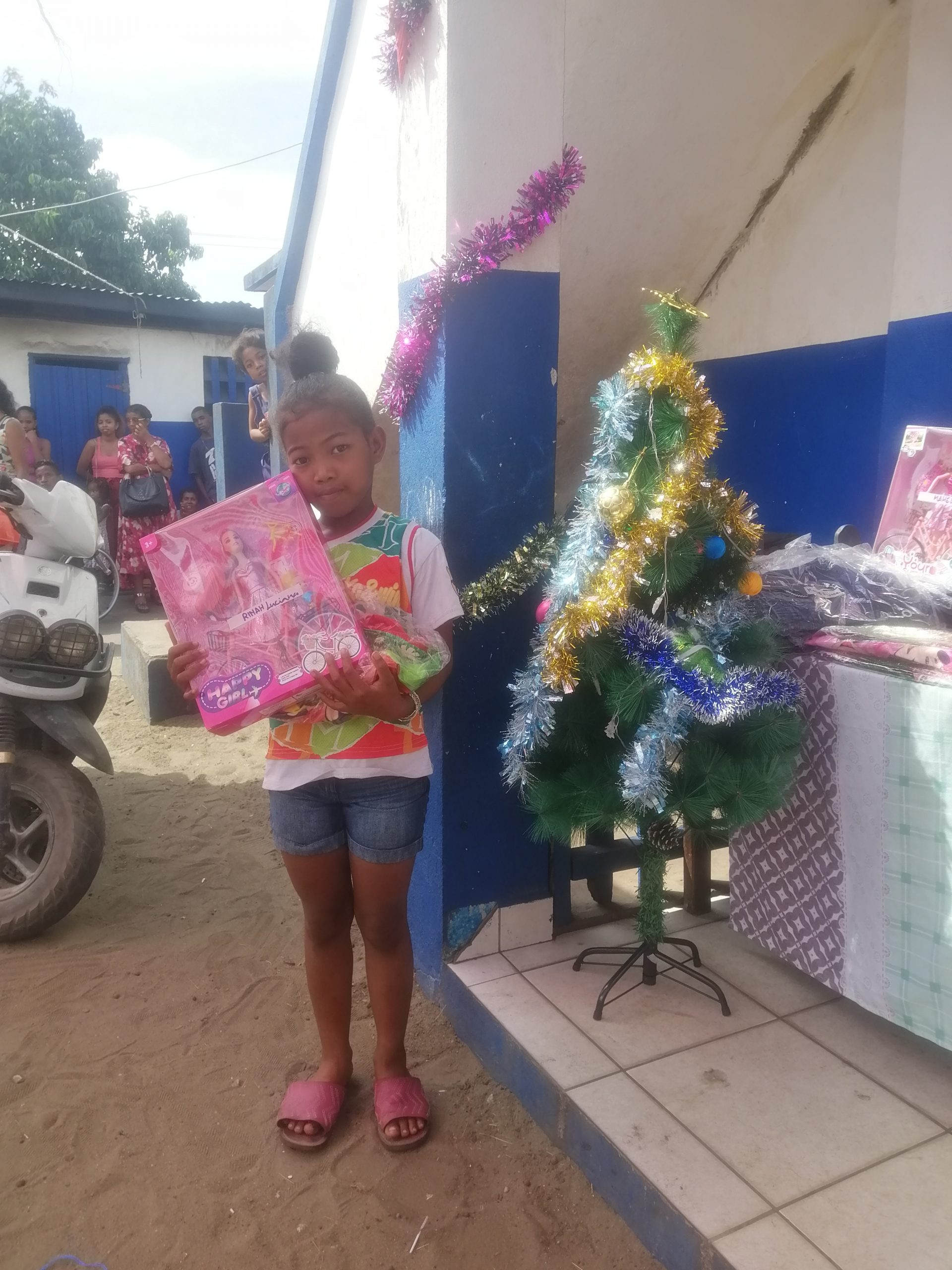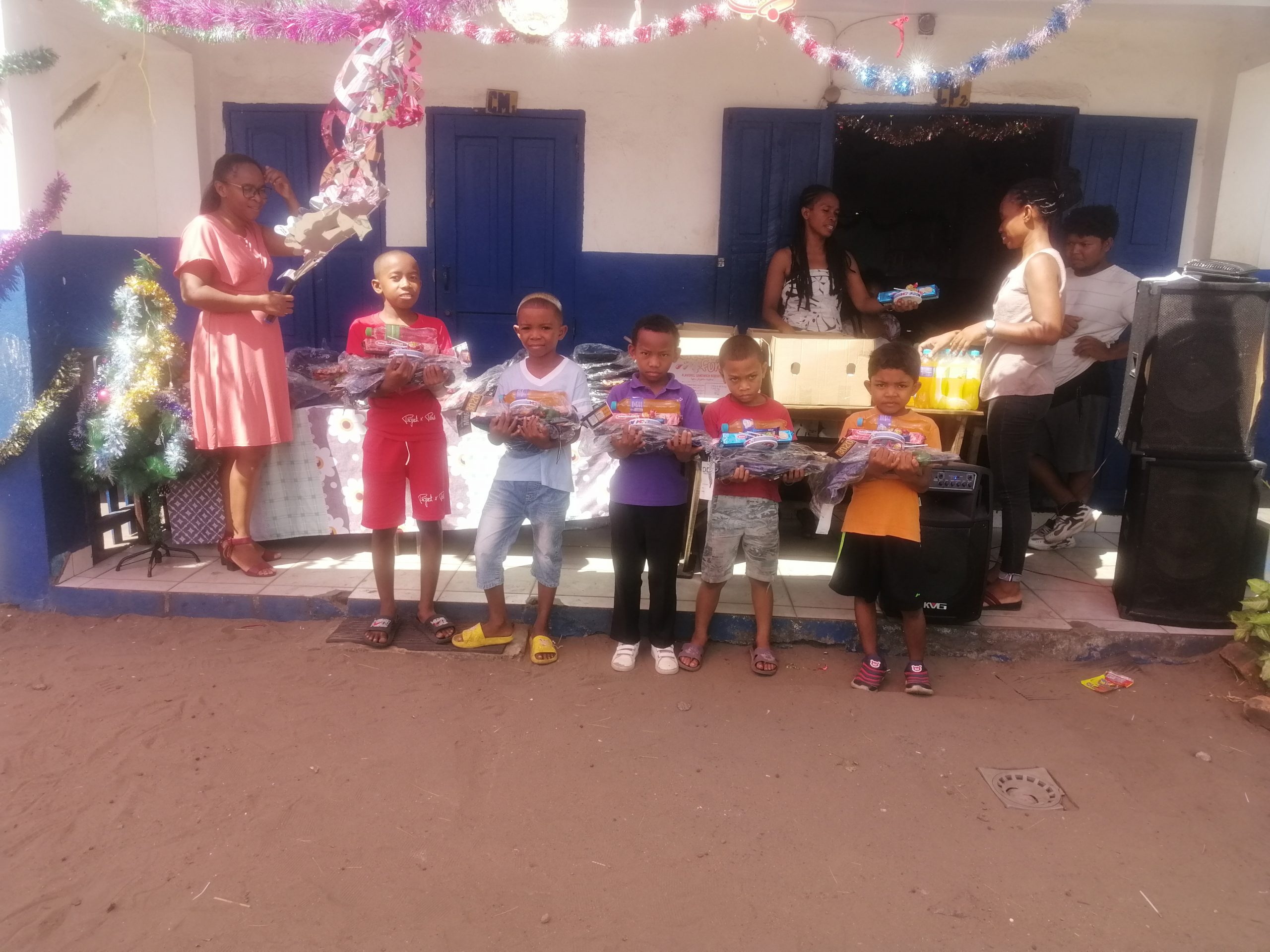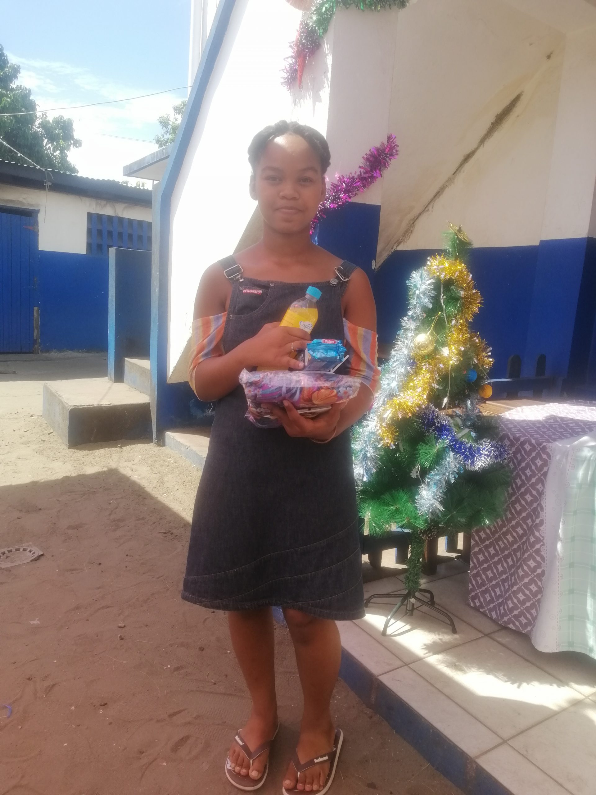 Pour les enfants en famille nous avons donné comme cadeaux : vêtement pour chacun et plus jouets pour les enfants en classe primaire. Pour les goûters : une boisson, une boîte de fromage, un biscuit GM, un chocolat et des bonbons sucettes.