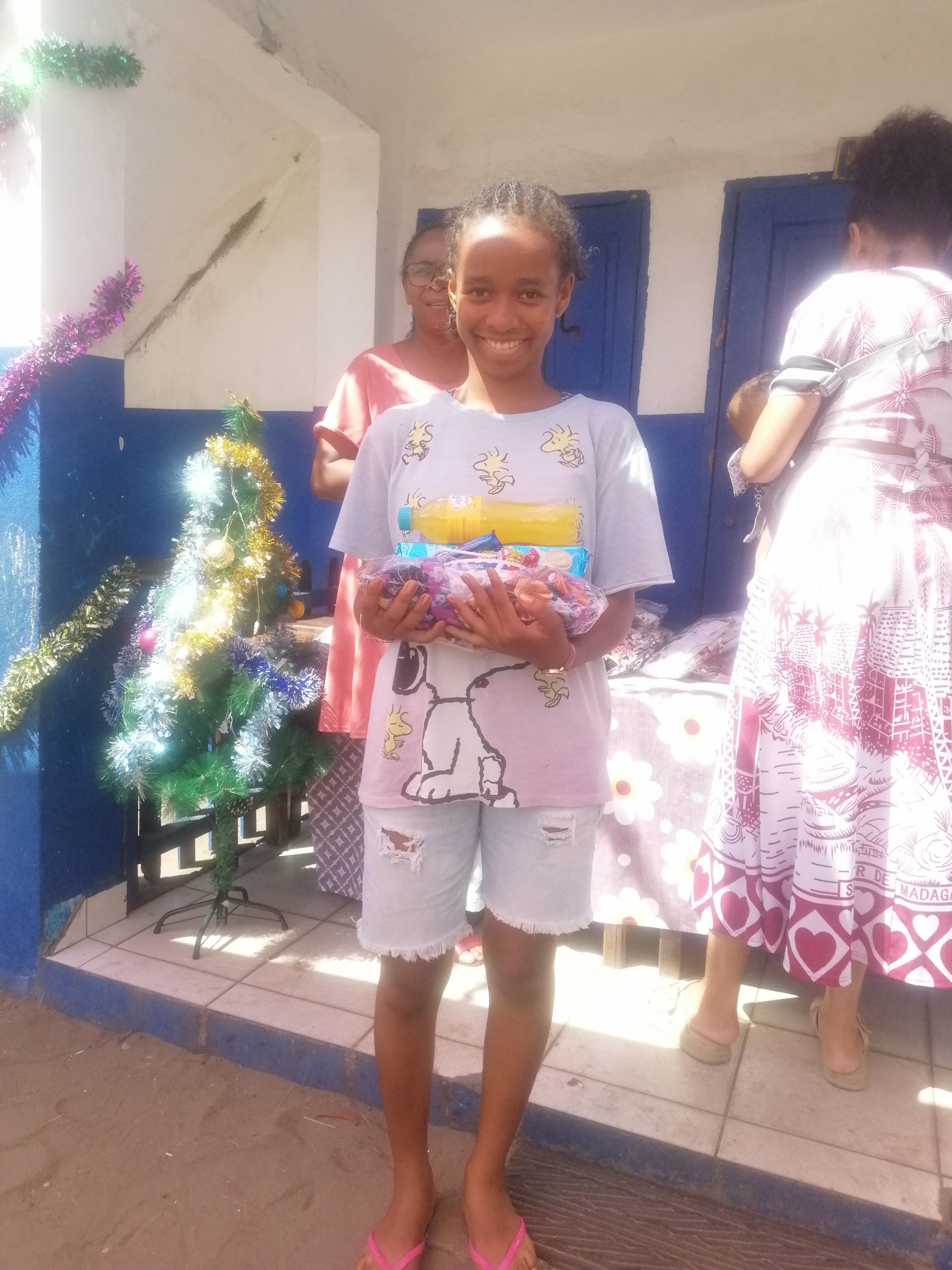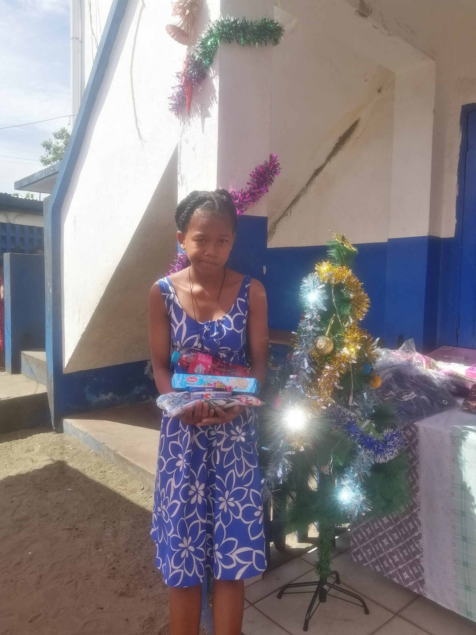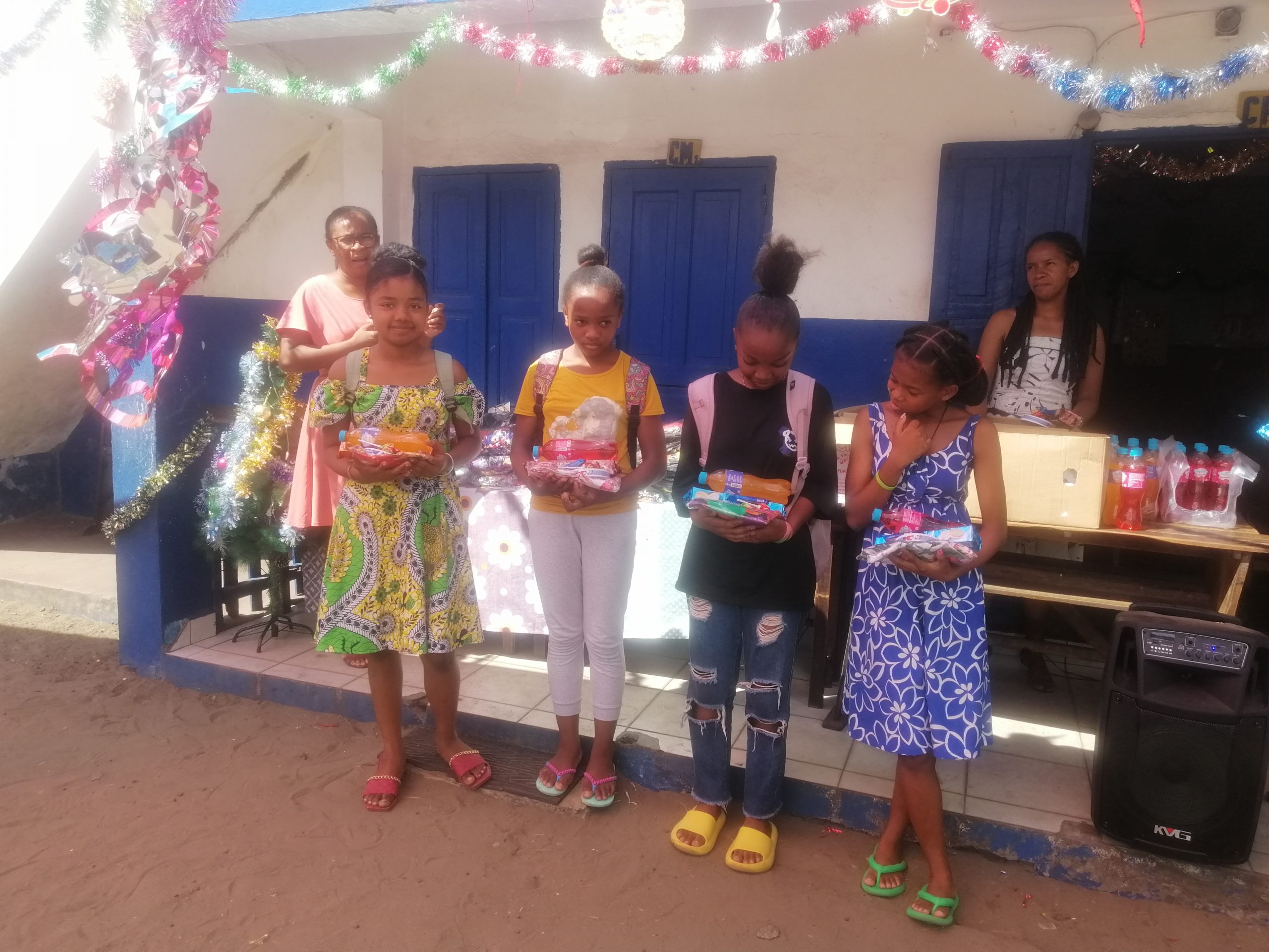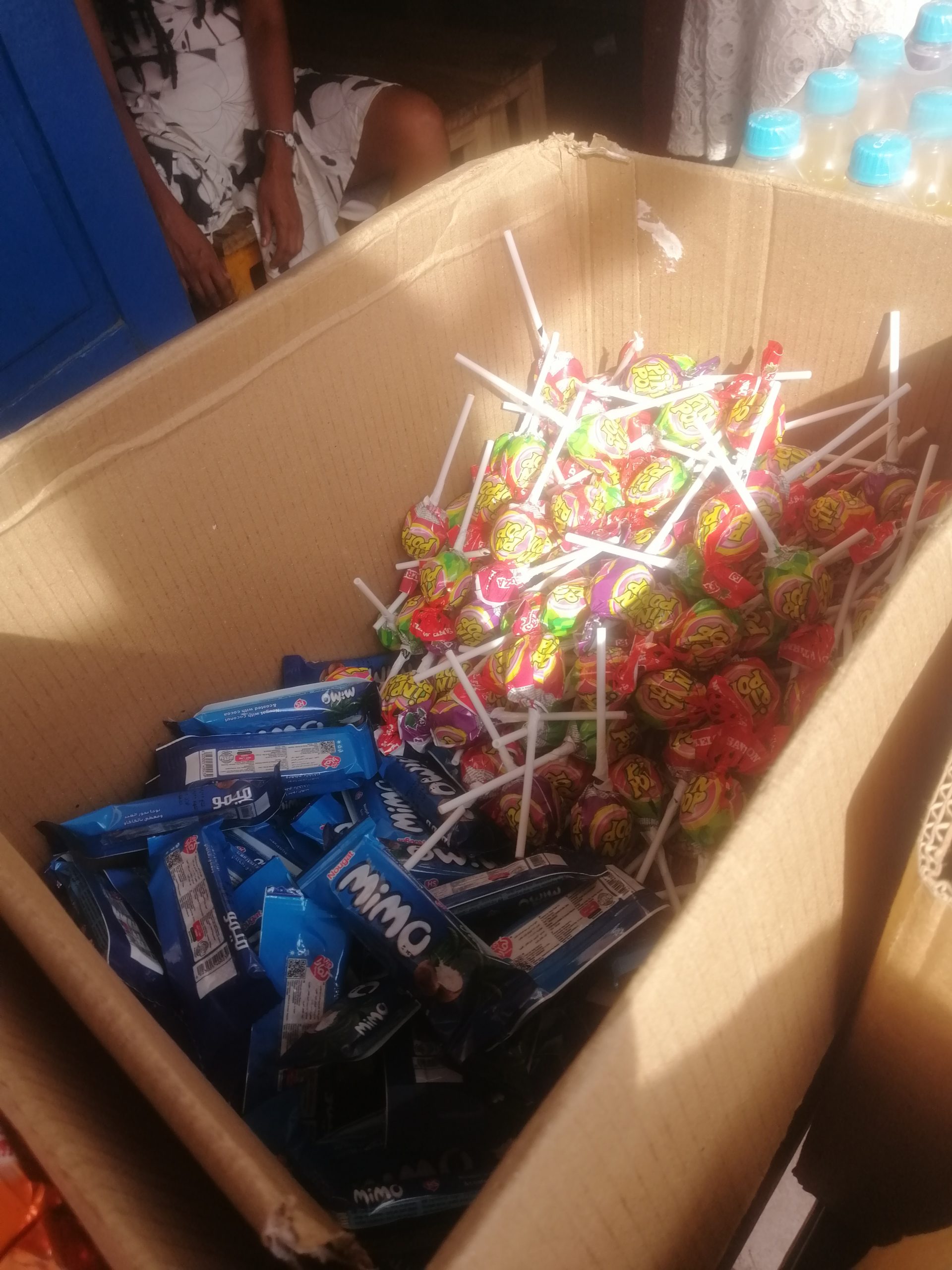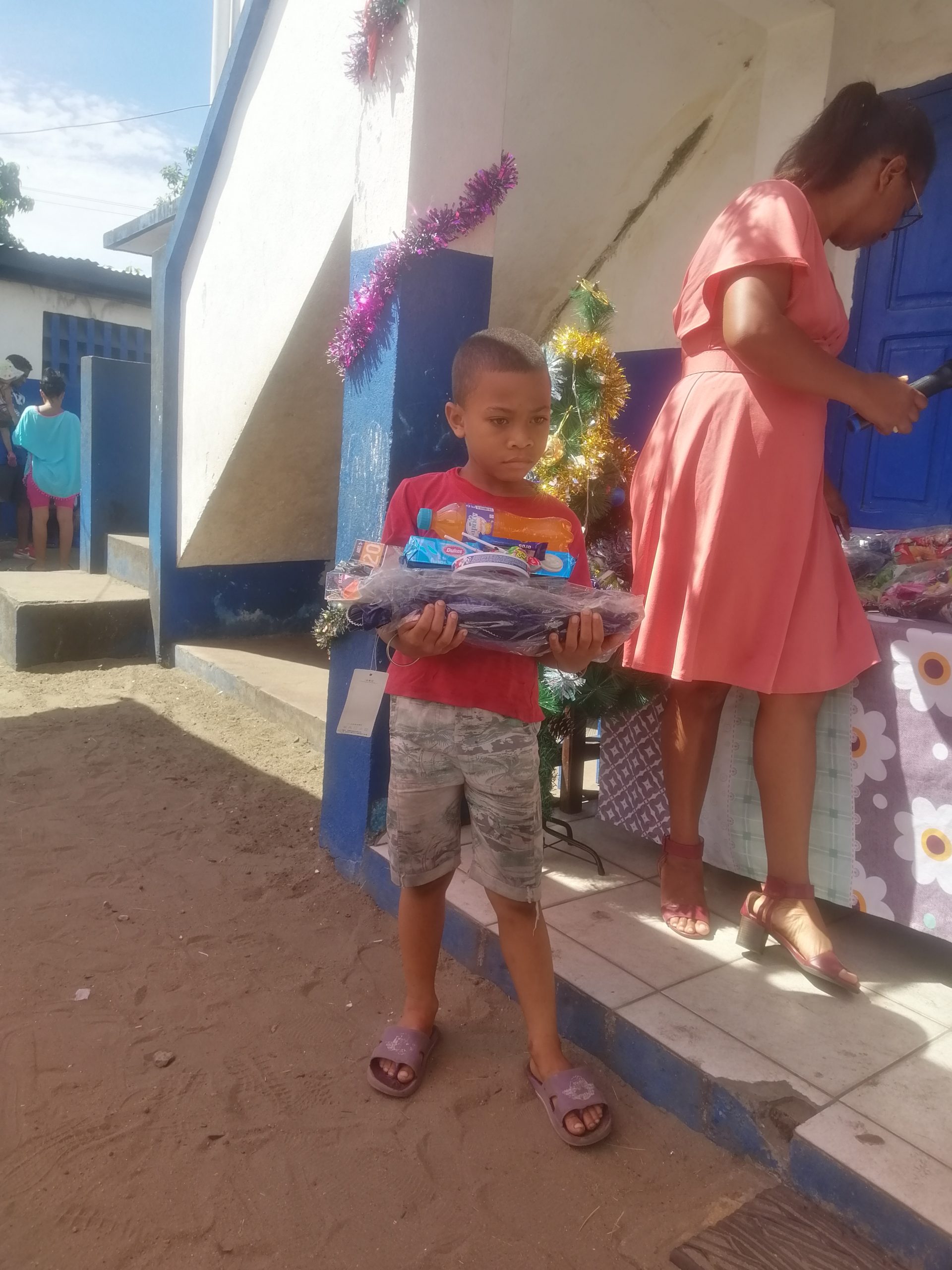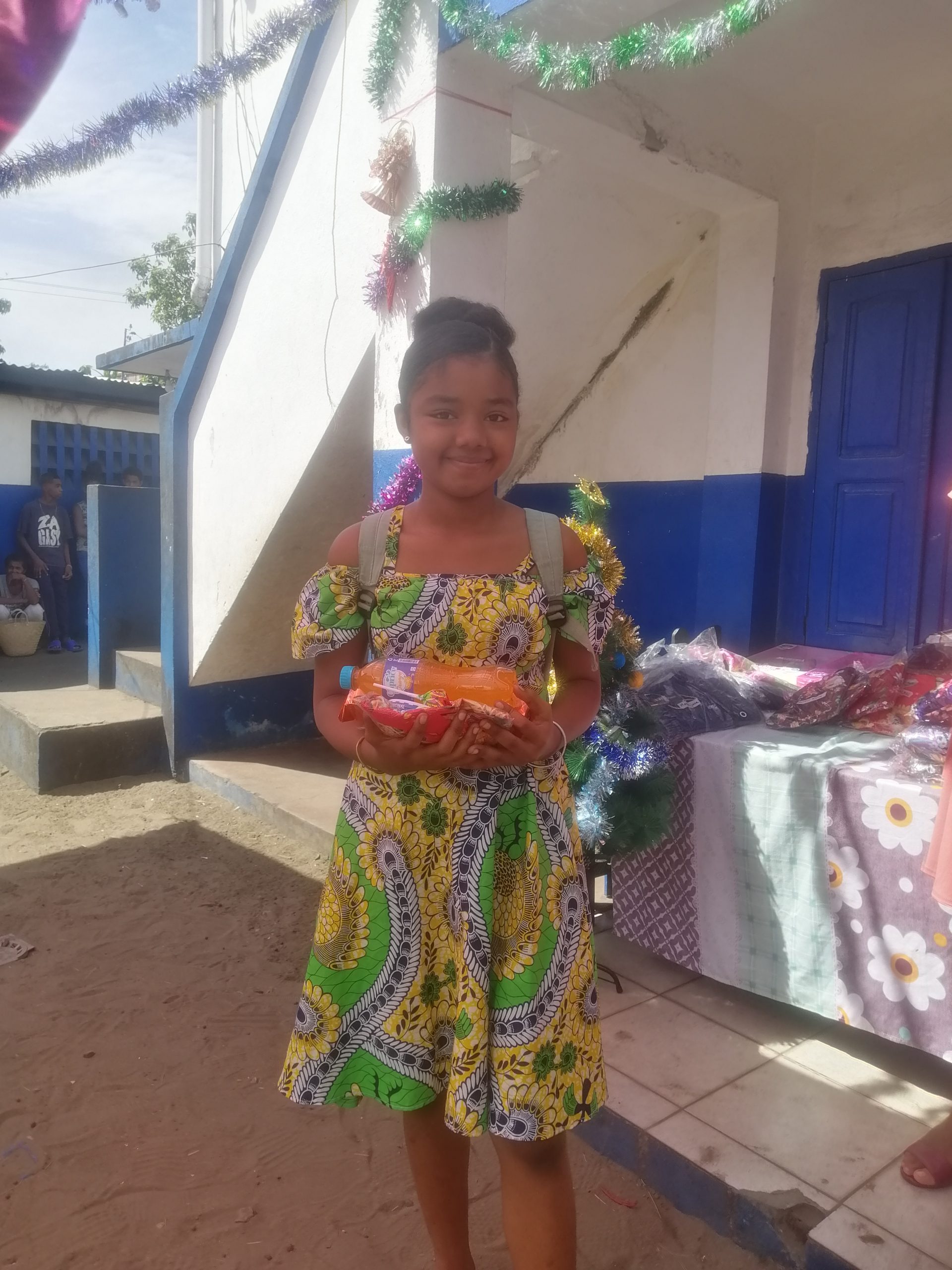 Pour les enfants en famille nous avons donné comme cadeaux : vêtement pour chacun et plus jouets pour les enfants en classe primaire. Pour les goûters : une boisson, une boîte de fromage, un biscuit GM, un chocolat et des bonbons sucettes.