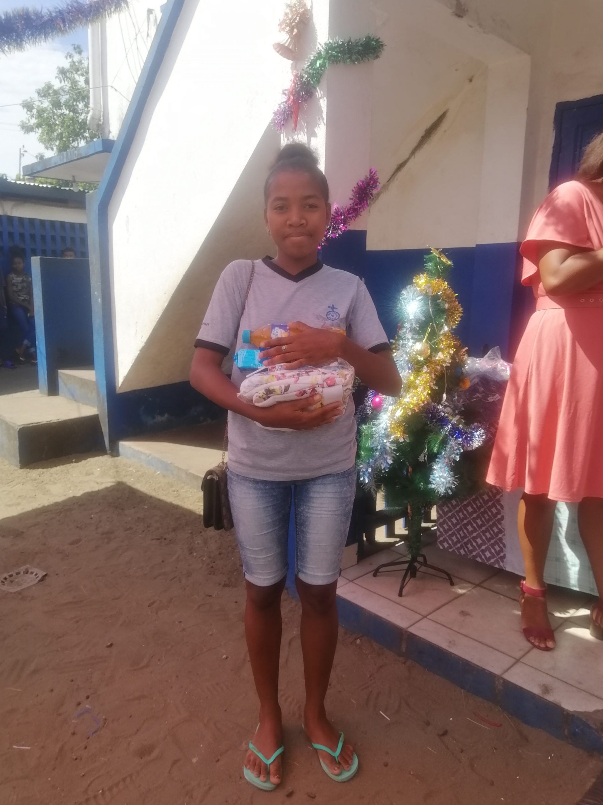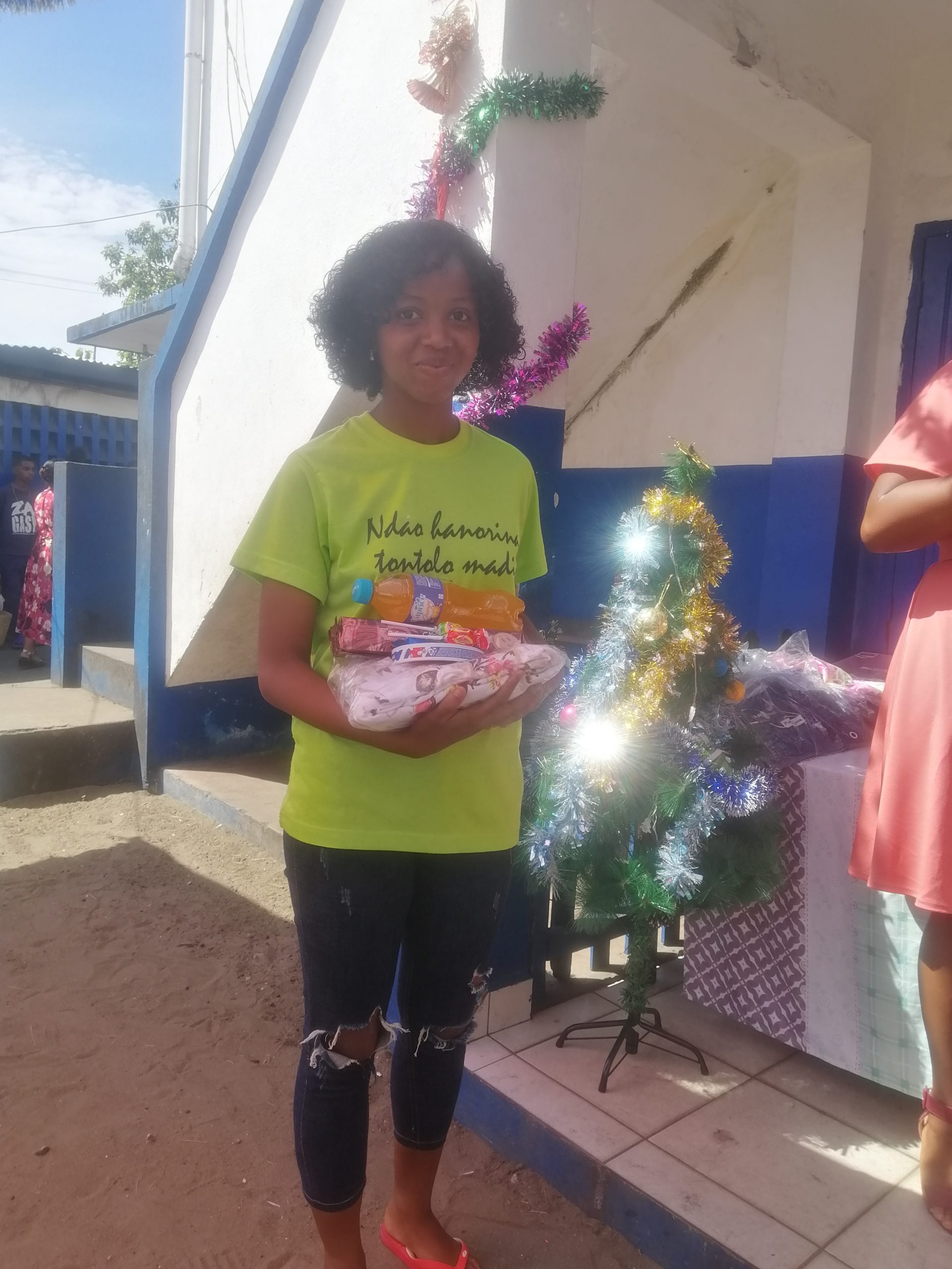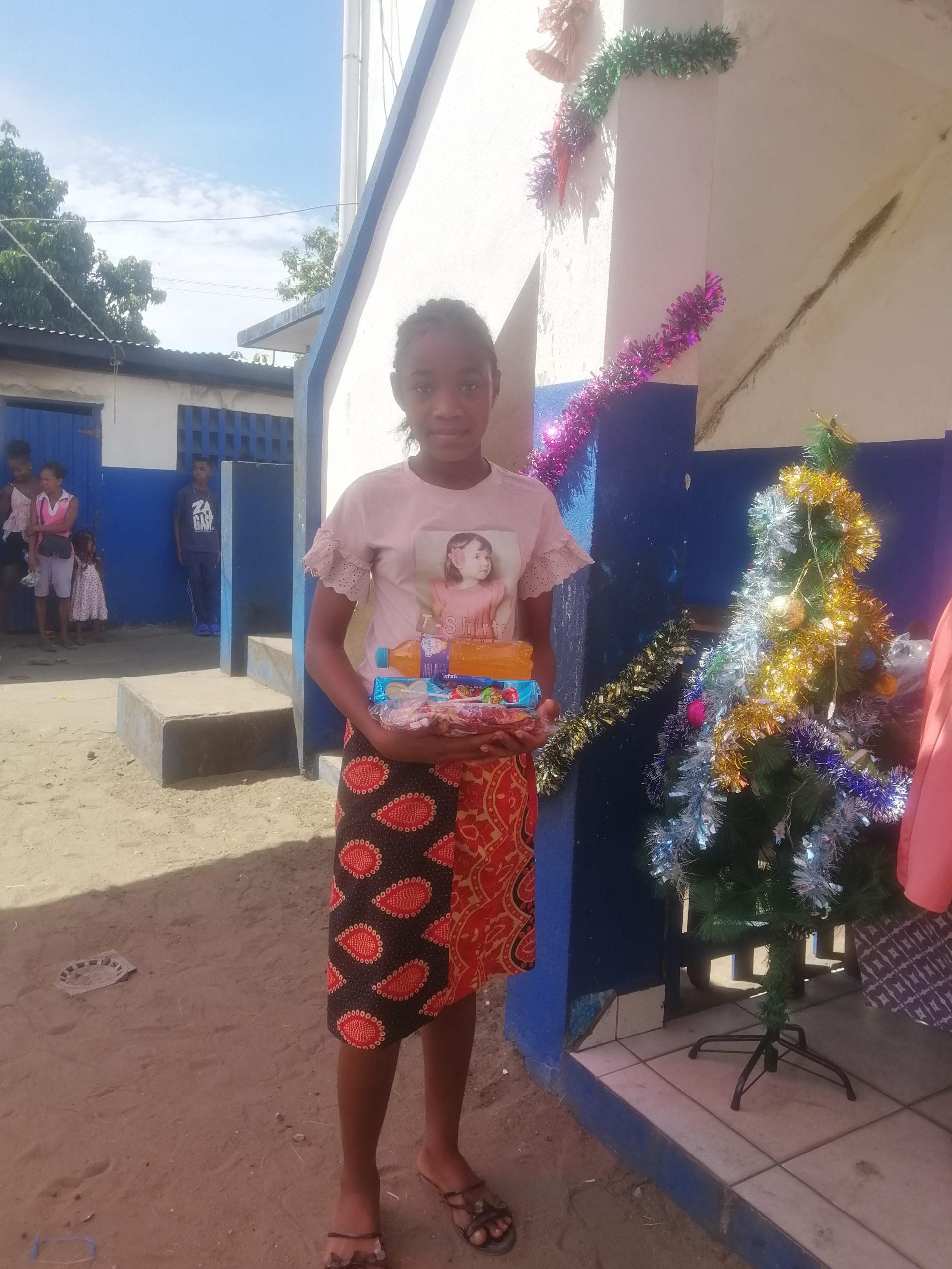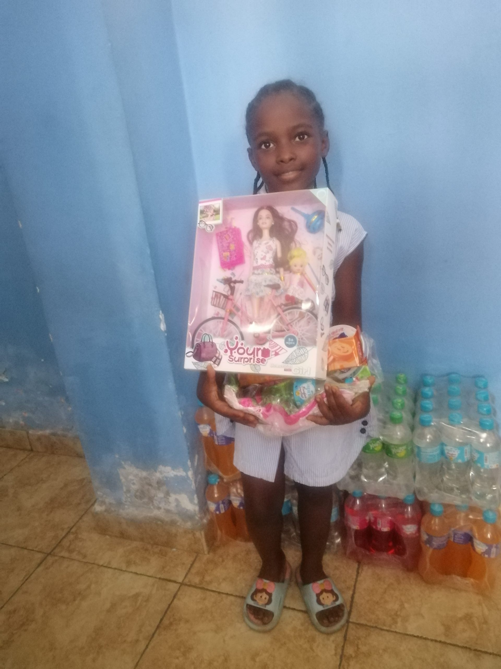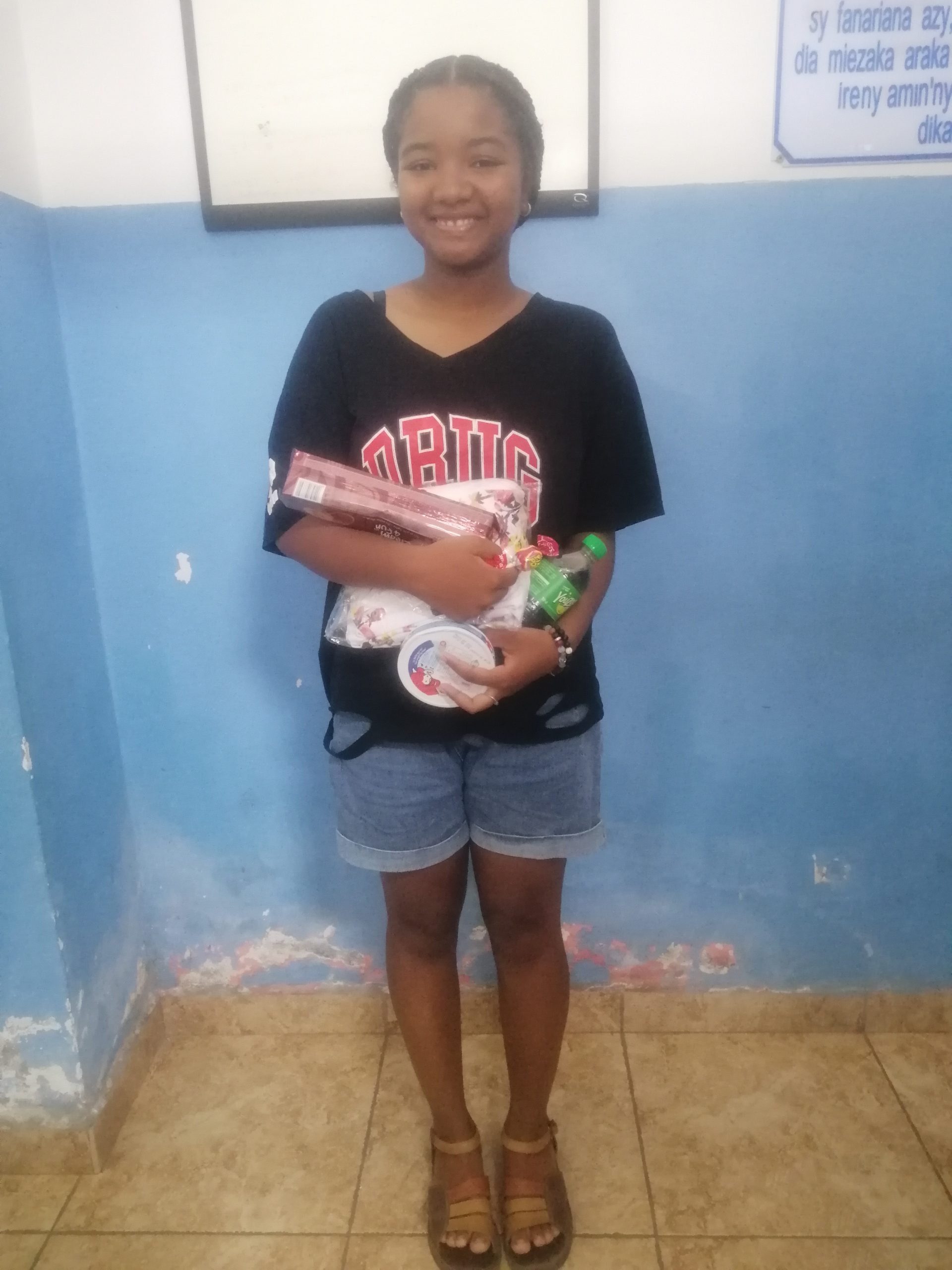 Pour les enfants en famille nous avons donné comme cadeaux : vêtement pour chacun et plus jouets pour les enfants en classe primaire. Pour les goûters : une boisson, une boîte de fromage, un biscuit GM, un chocolat et des bonbons sucettes.