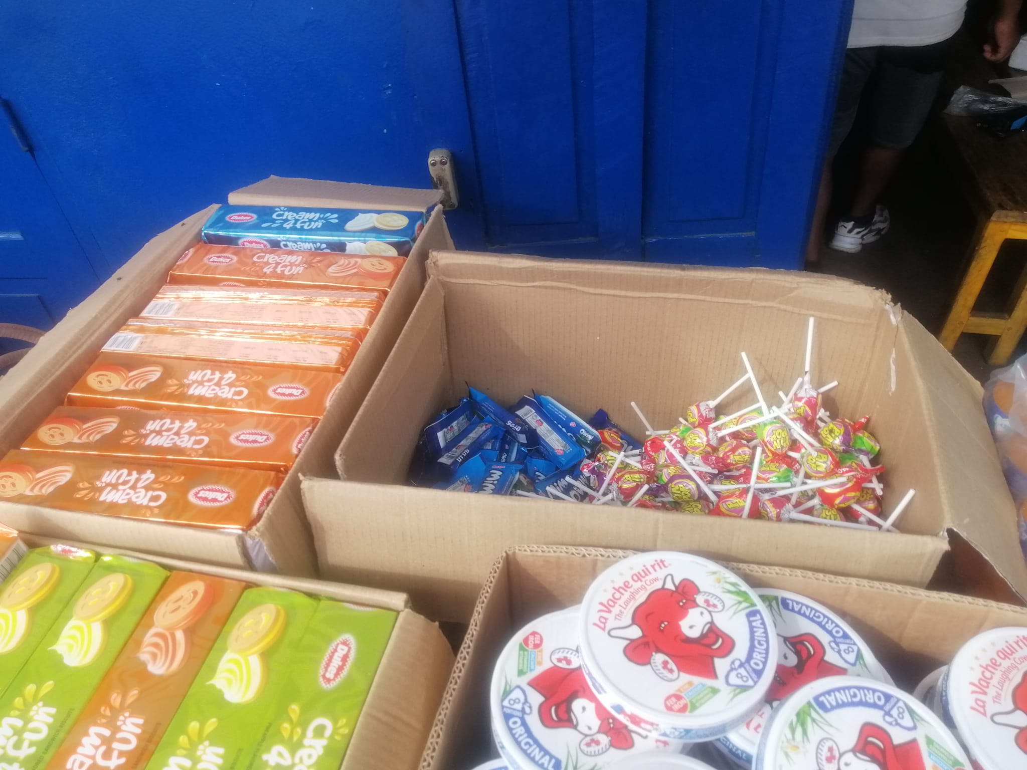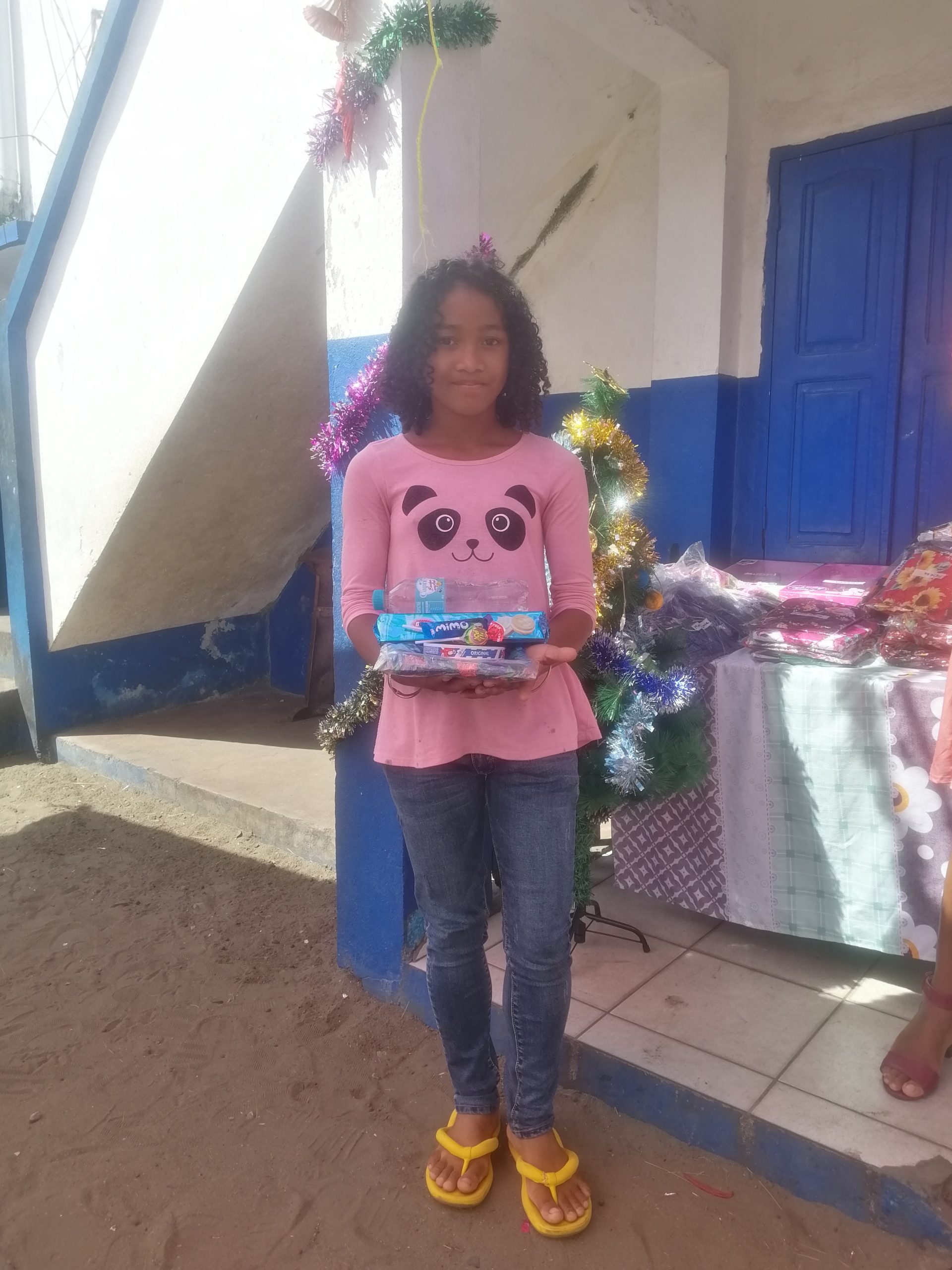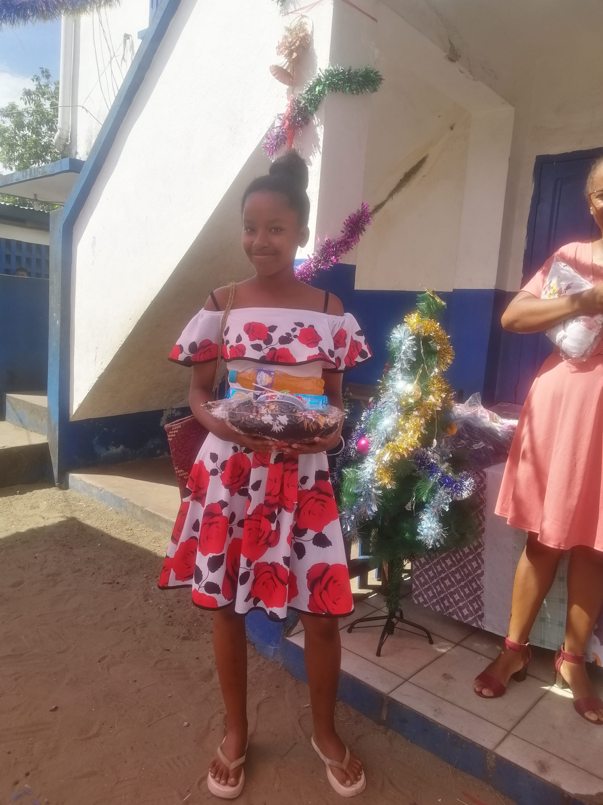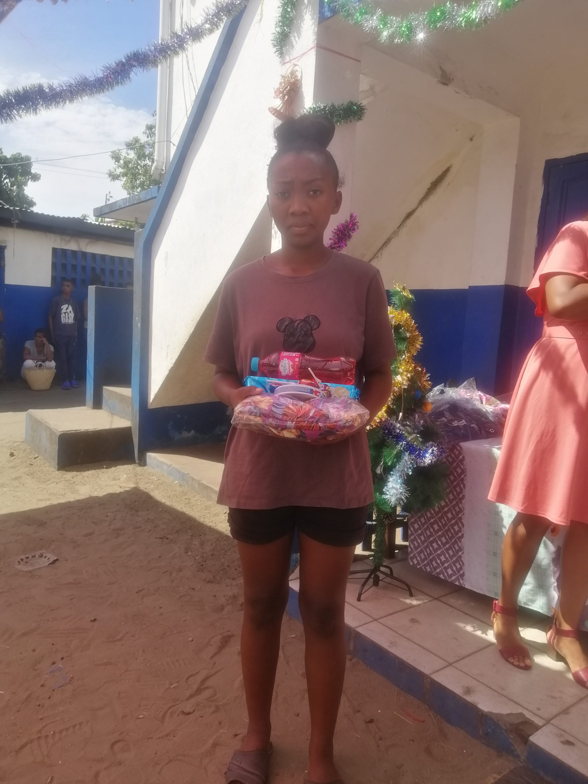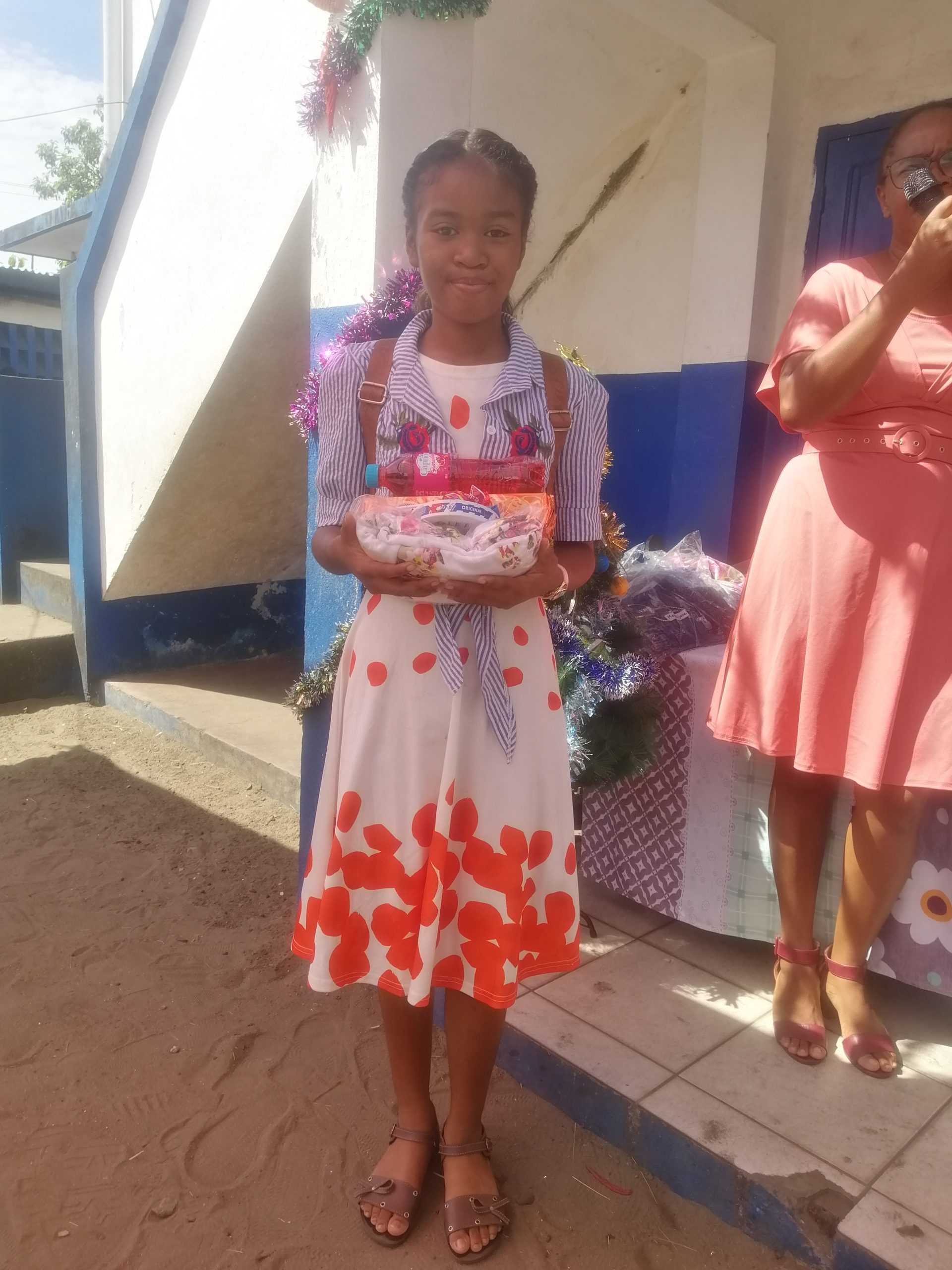 Pour les enfants en famille nous avons donné comme cadeaux : vêtement pour chacun et plus jouets pour les enfants en classe primaire. Pour les goûters : une boisson, une boîte de fromage, un biscuit GM, un chocolat et des bonbons sucettes.