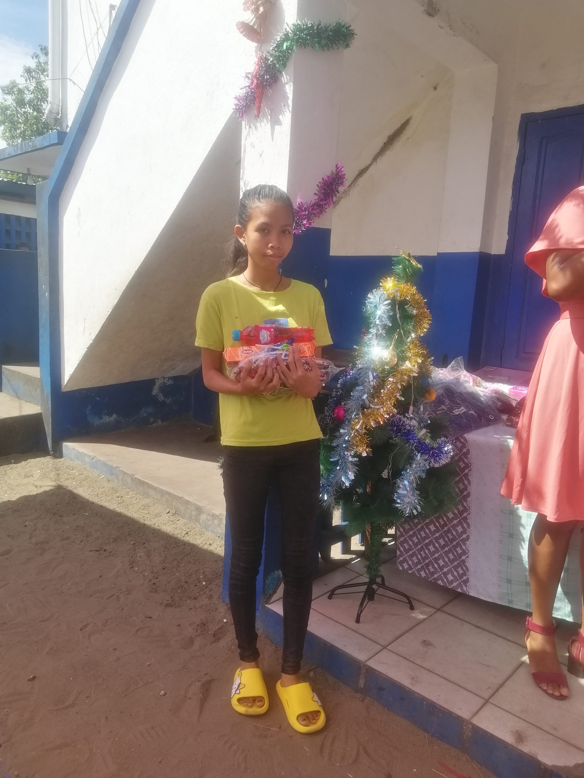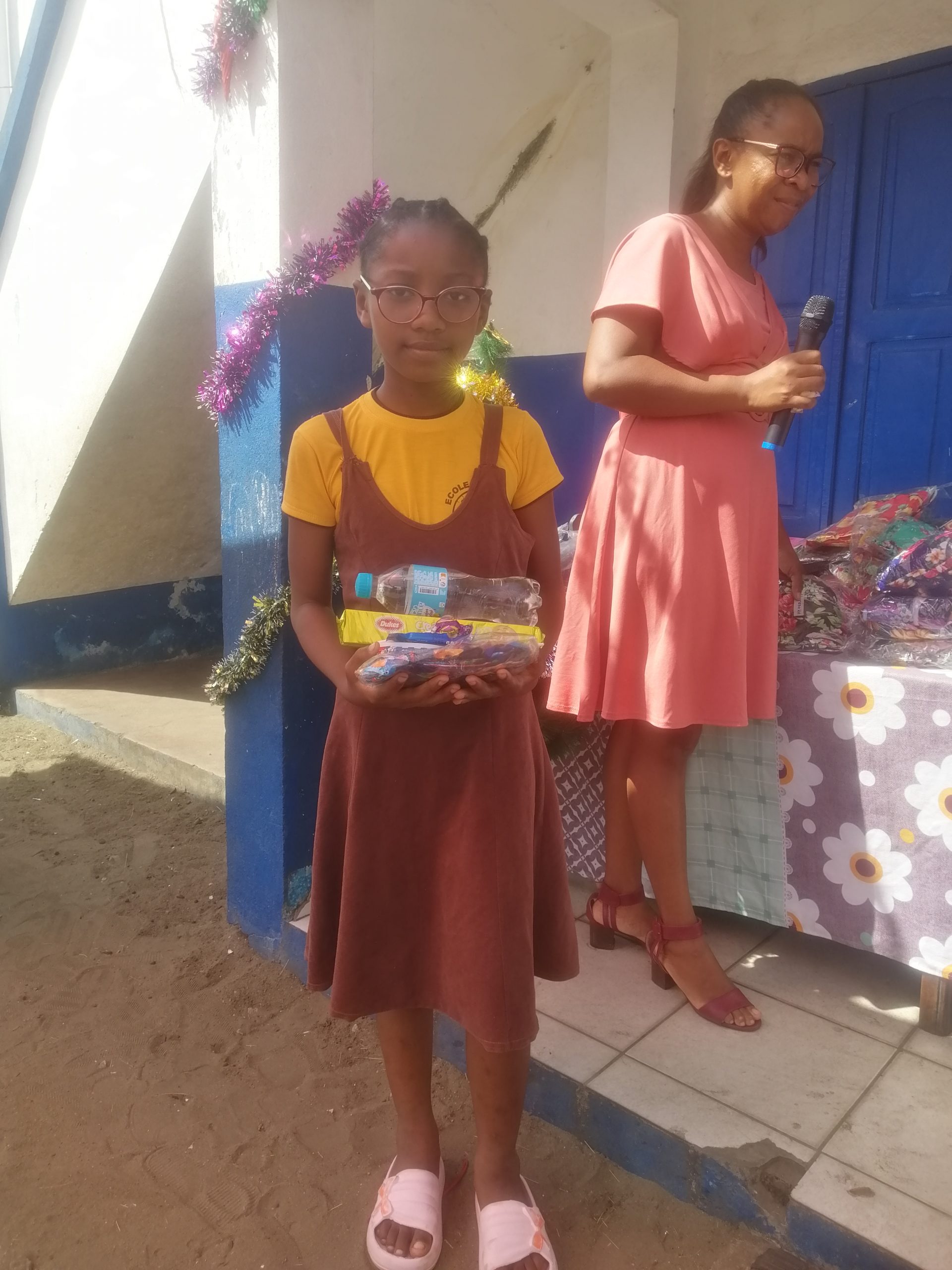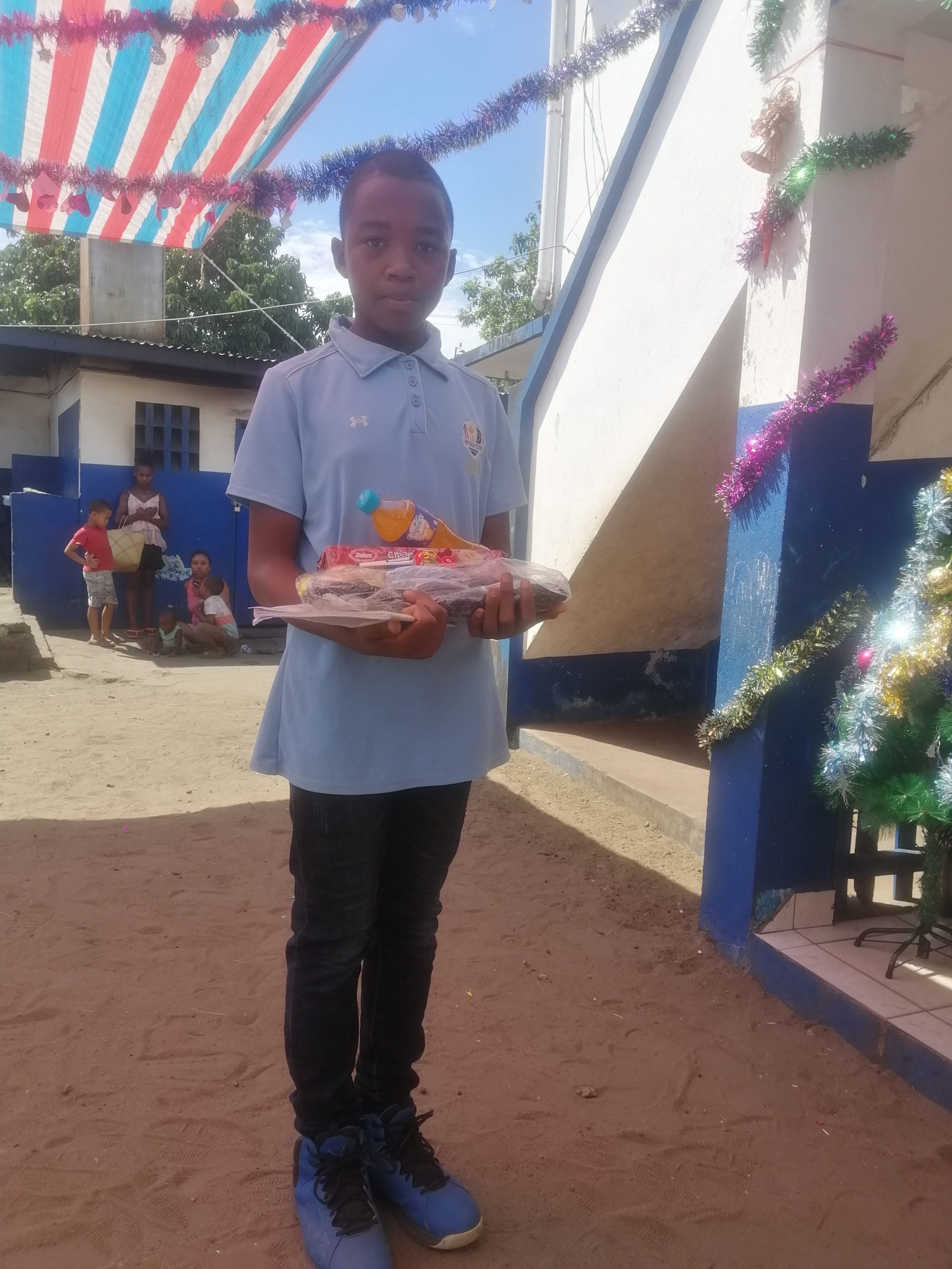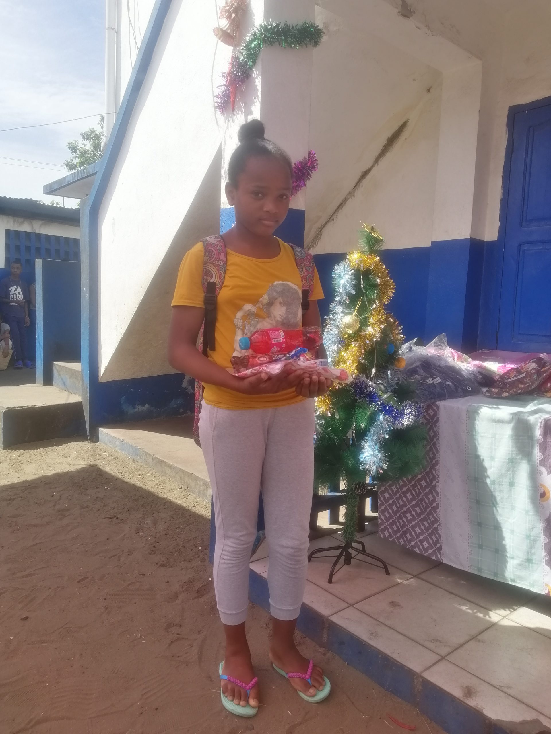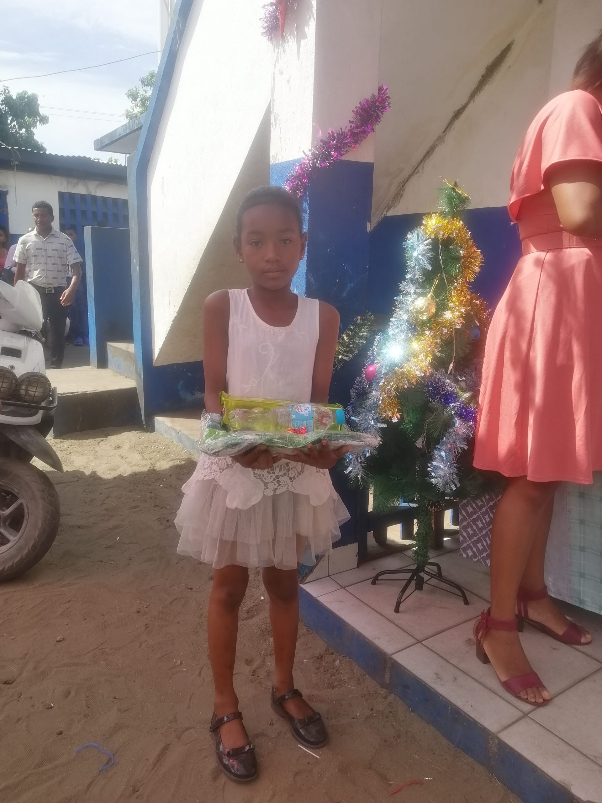 Pour les enfants en famille nous avons donné comme cadeaux : vêtement pour chacun et plus jouets pour les enfants en classe primaire. Pour les goûters : une boisson, une boîte de fromage, un biscuit GM, un chocolat et des bonbons sucettes.