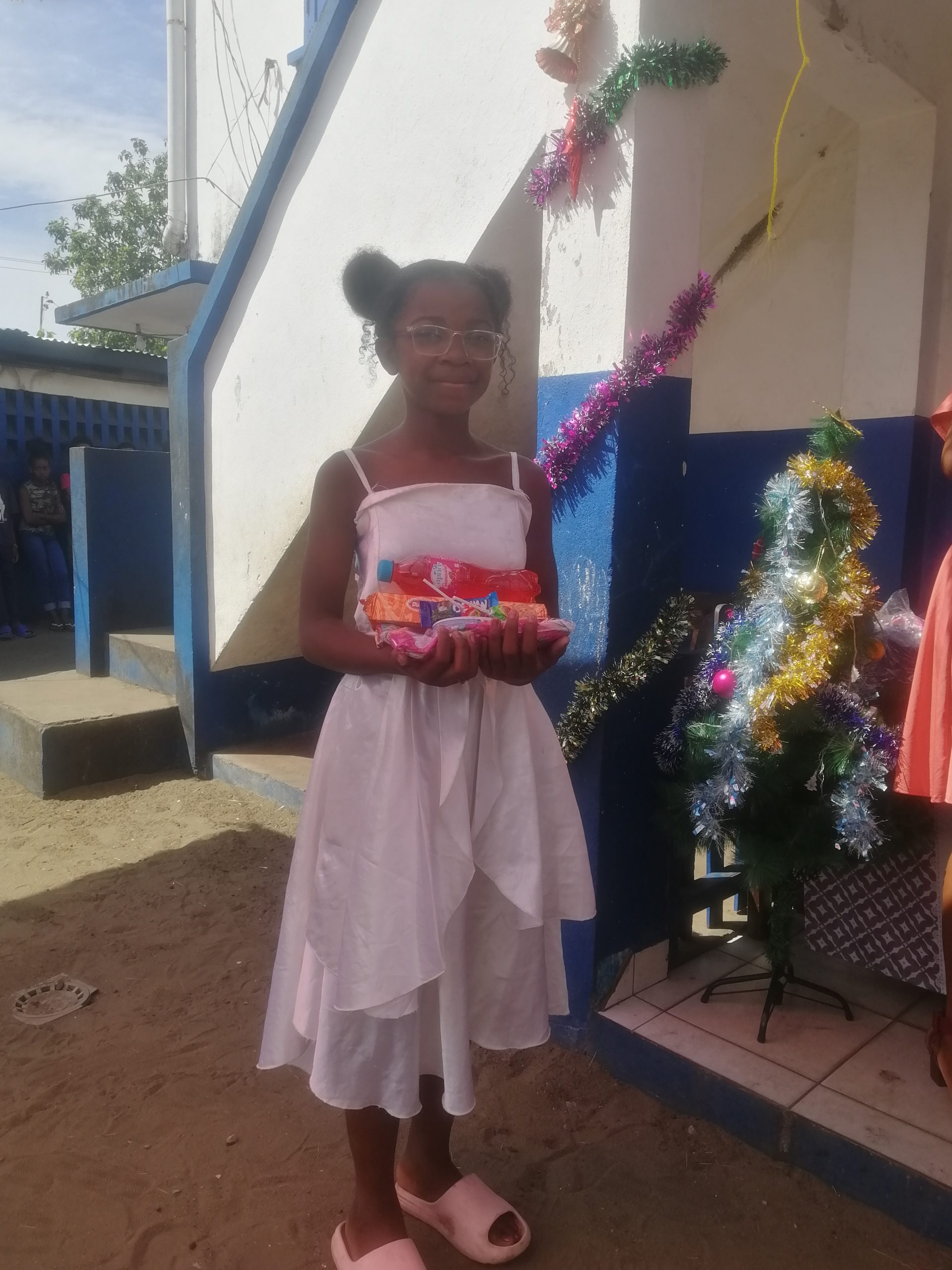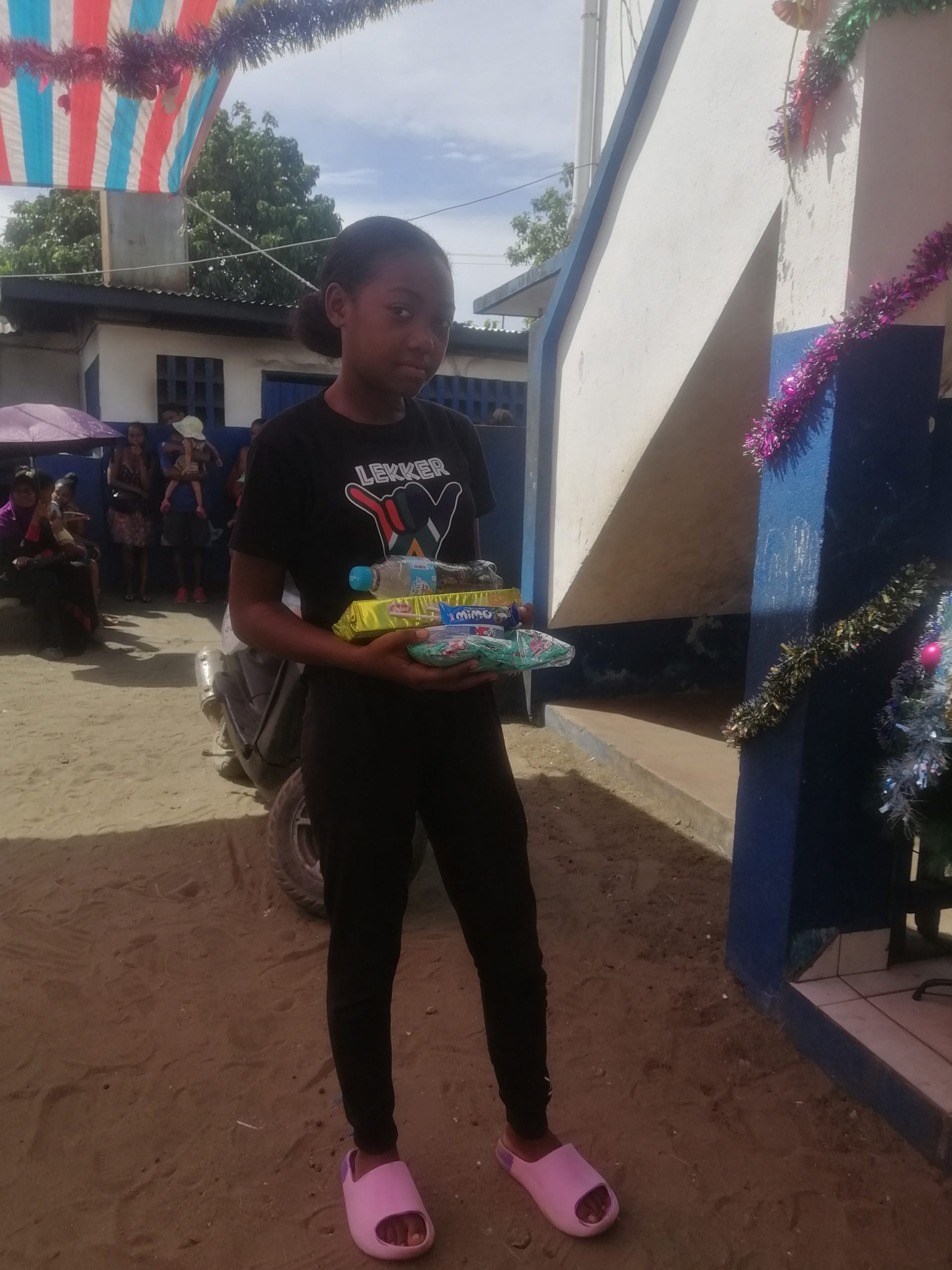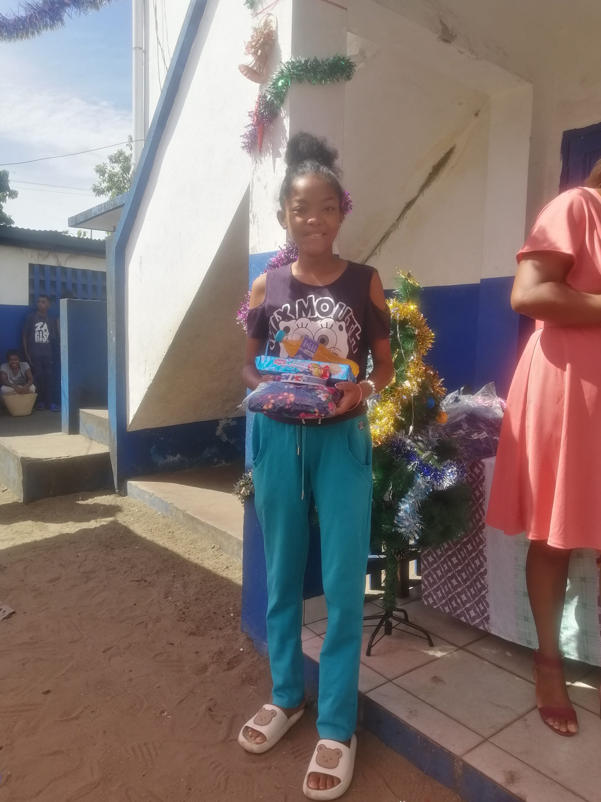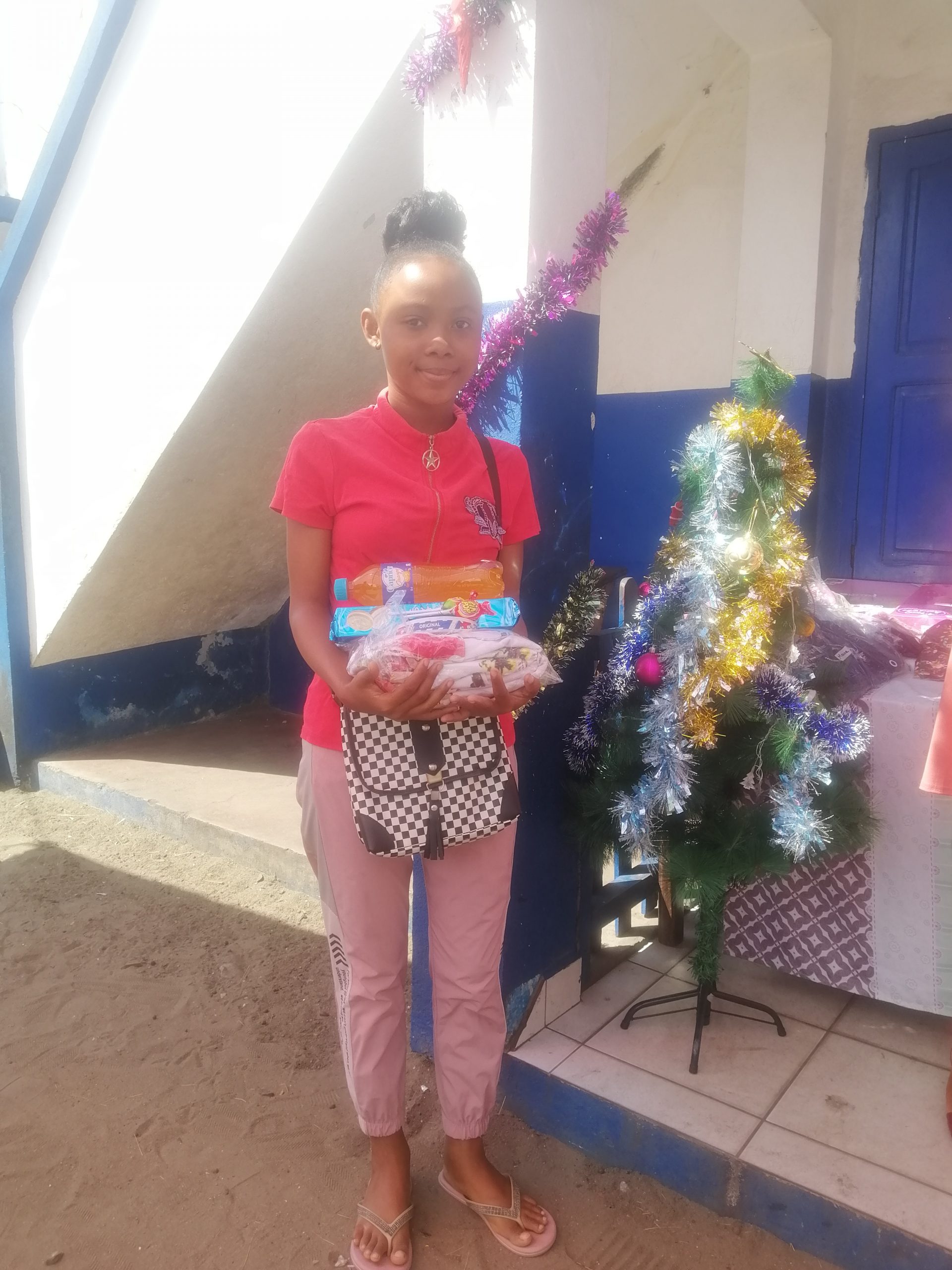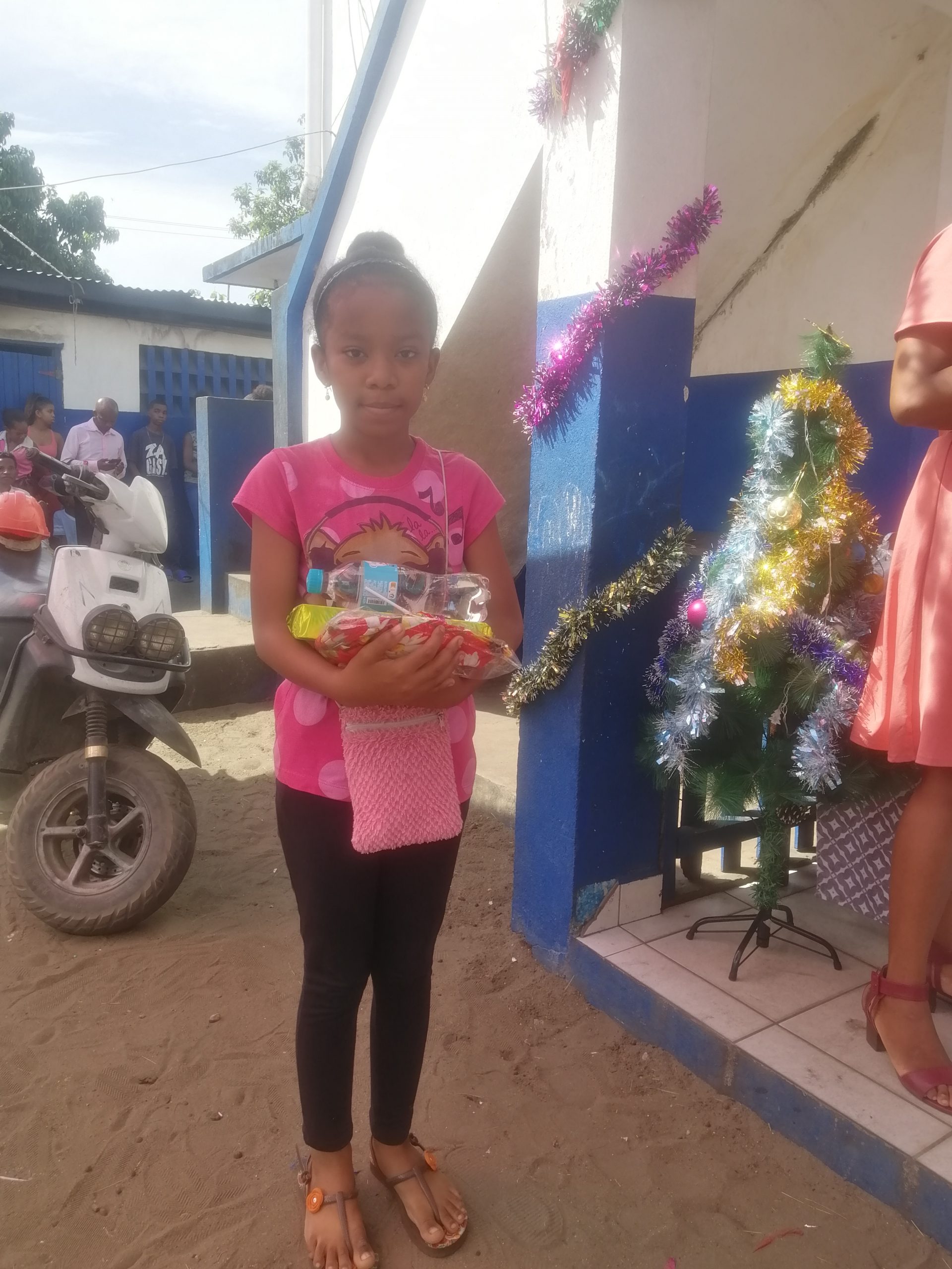 Pour les enfants en famille nous avons donné comme cadeaux : vêtement pour chacun et plus jouets pour les enfants en classe primaire. Pour les goûters : une boisson, une boîte de fromage, un biscuit GM, un chocolat et des bonbons sucettes.