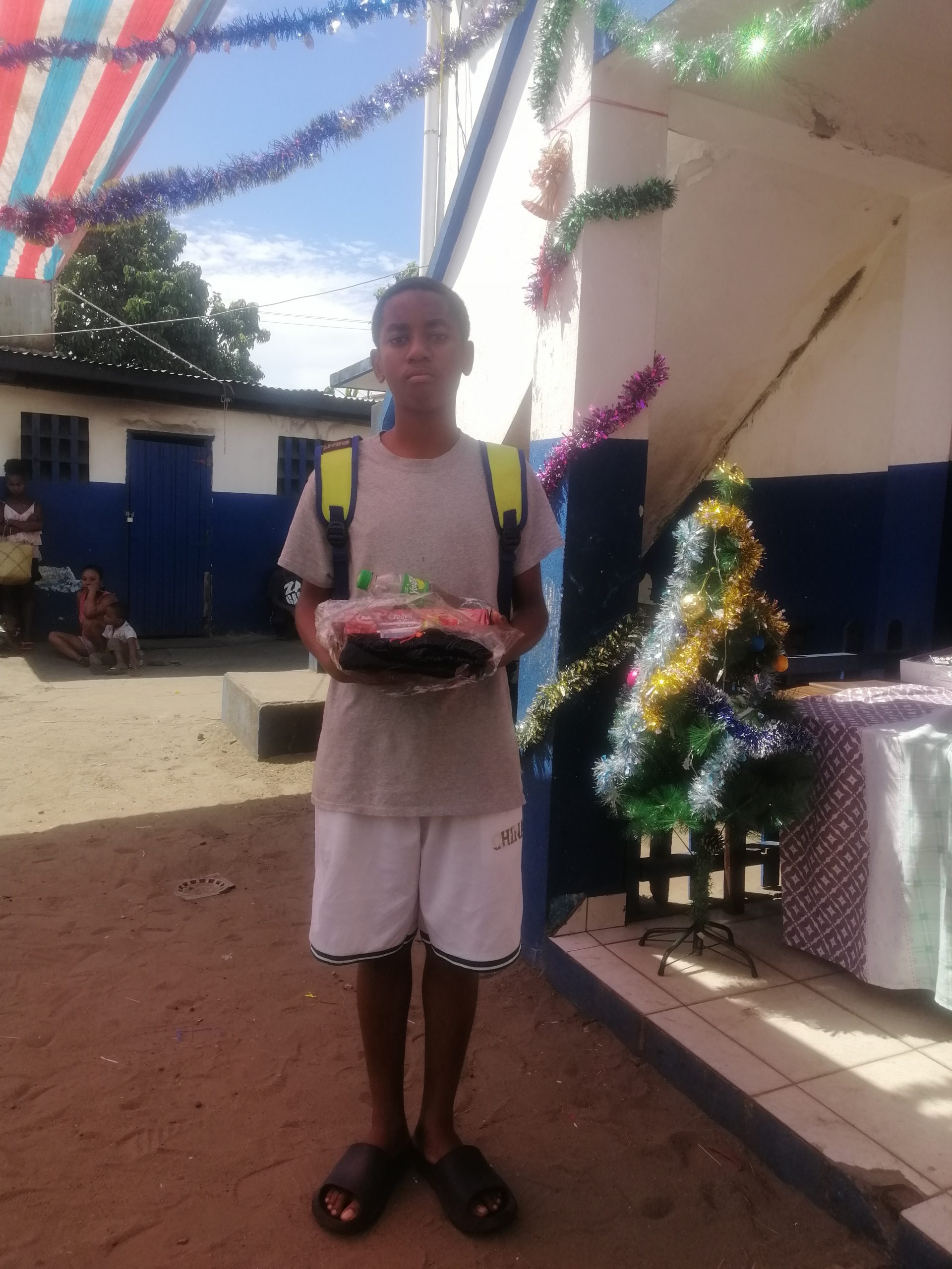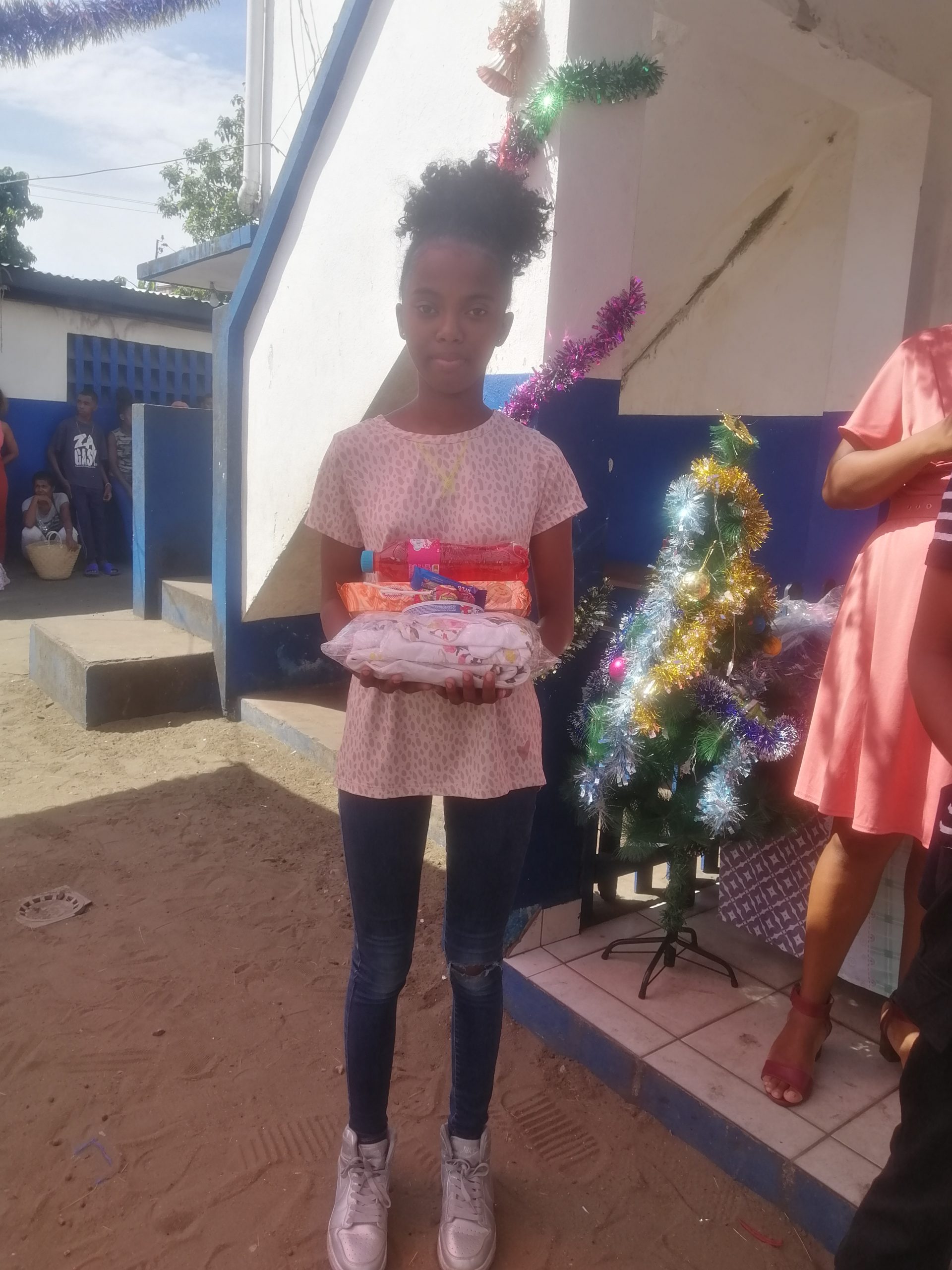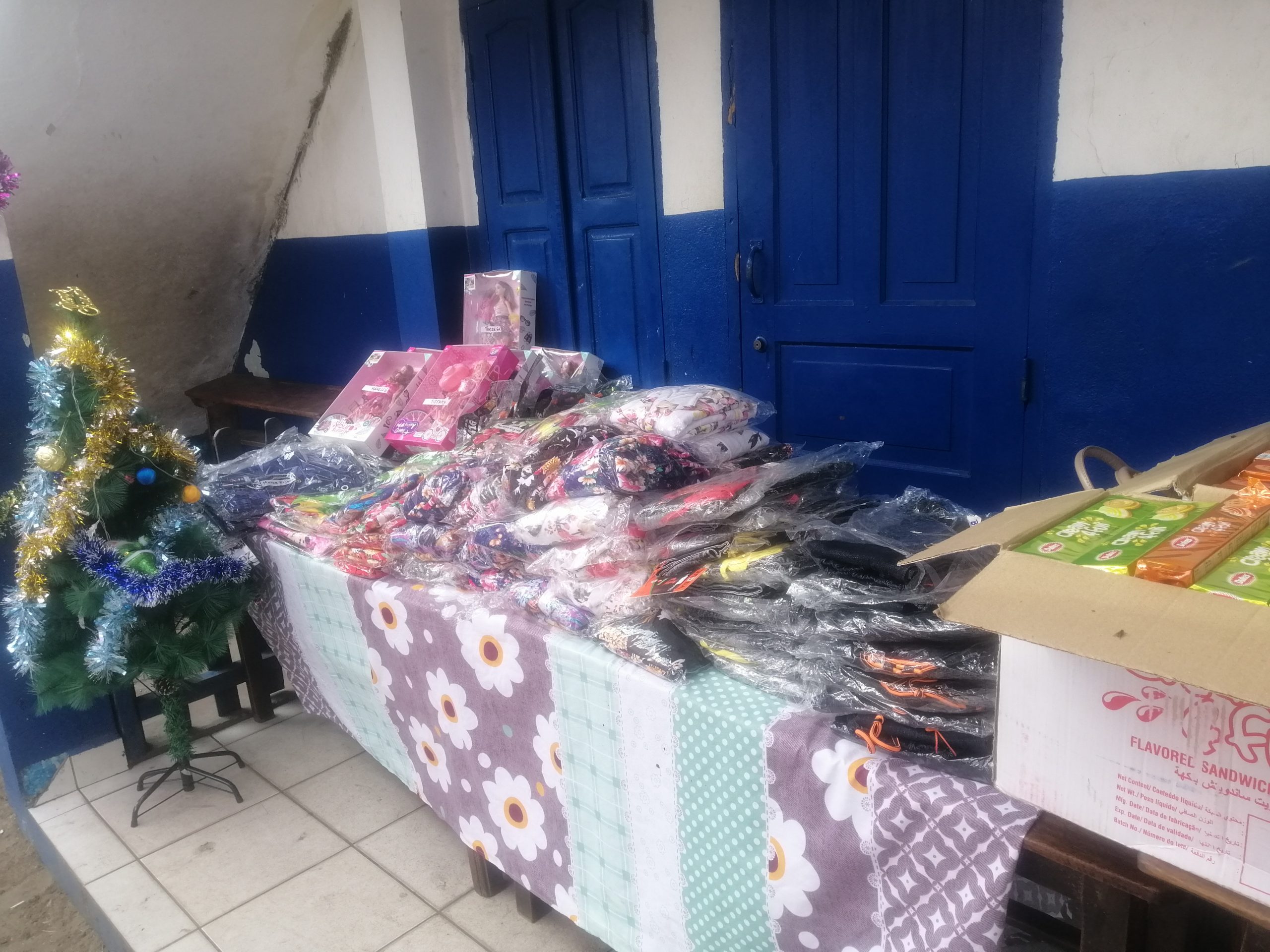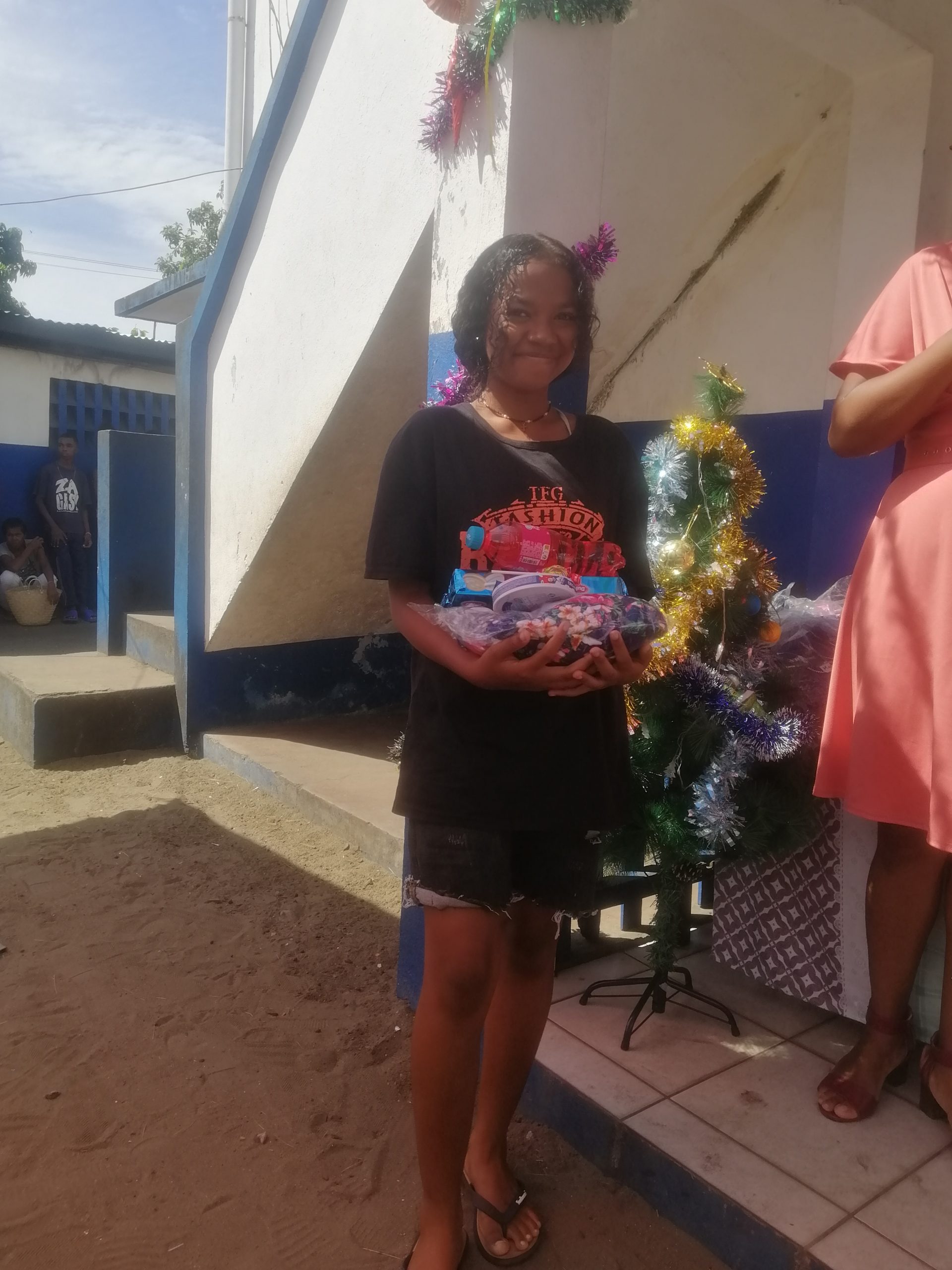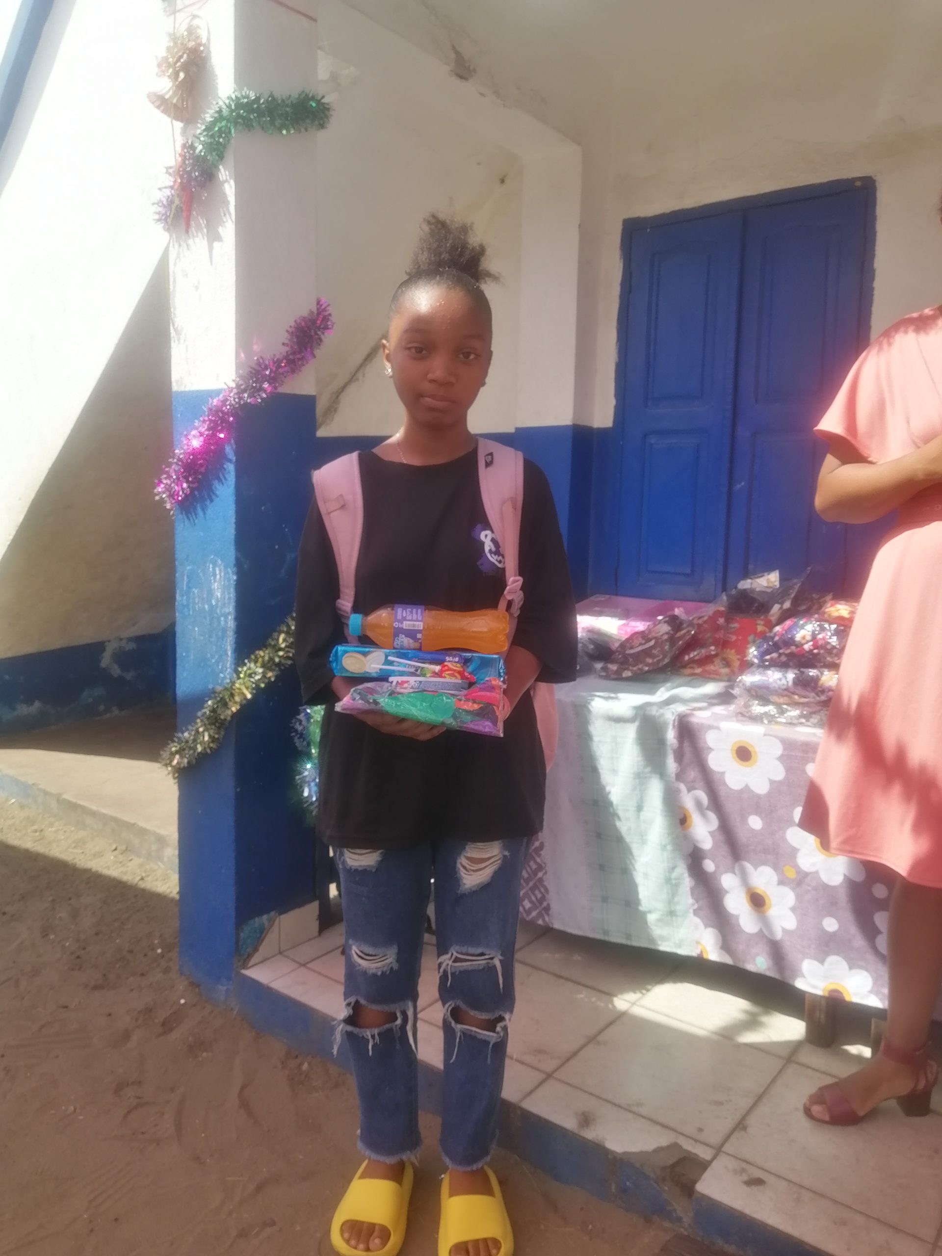 Pour les enfants en famille nous avons donné comme cadeaux : vêtement pour chacun et plus jouets pour les enfants en classe primaire. Pour les goûters : une boisson, une boîte de fromage, un biscuit GM, un chocolat et des bonbons sucettes.