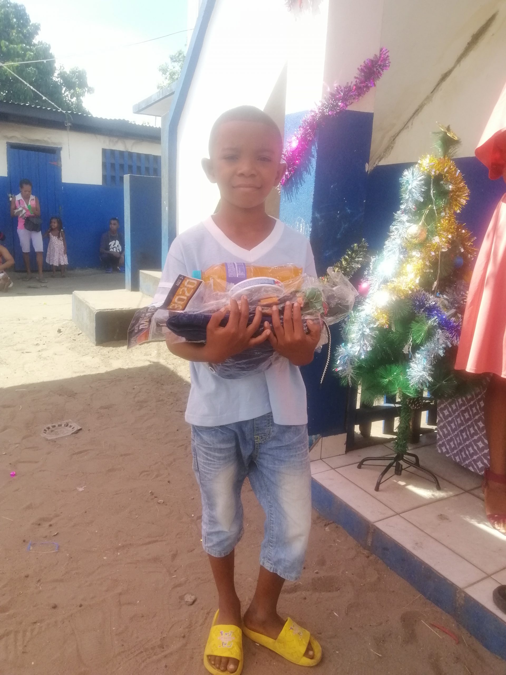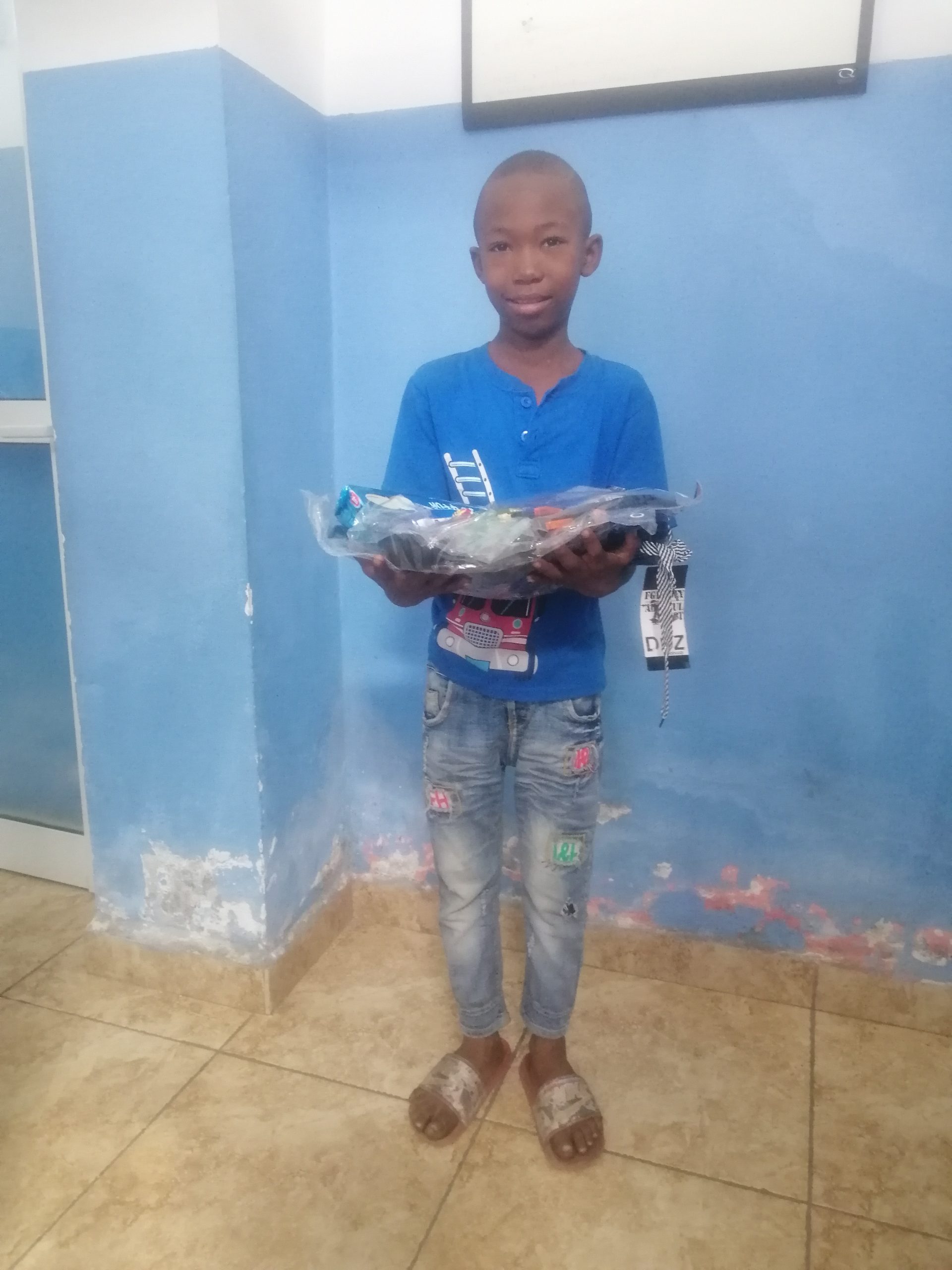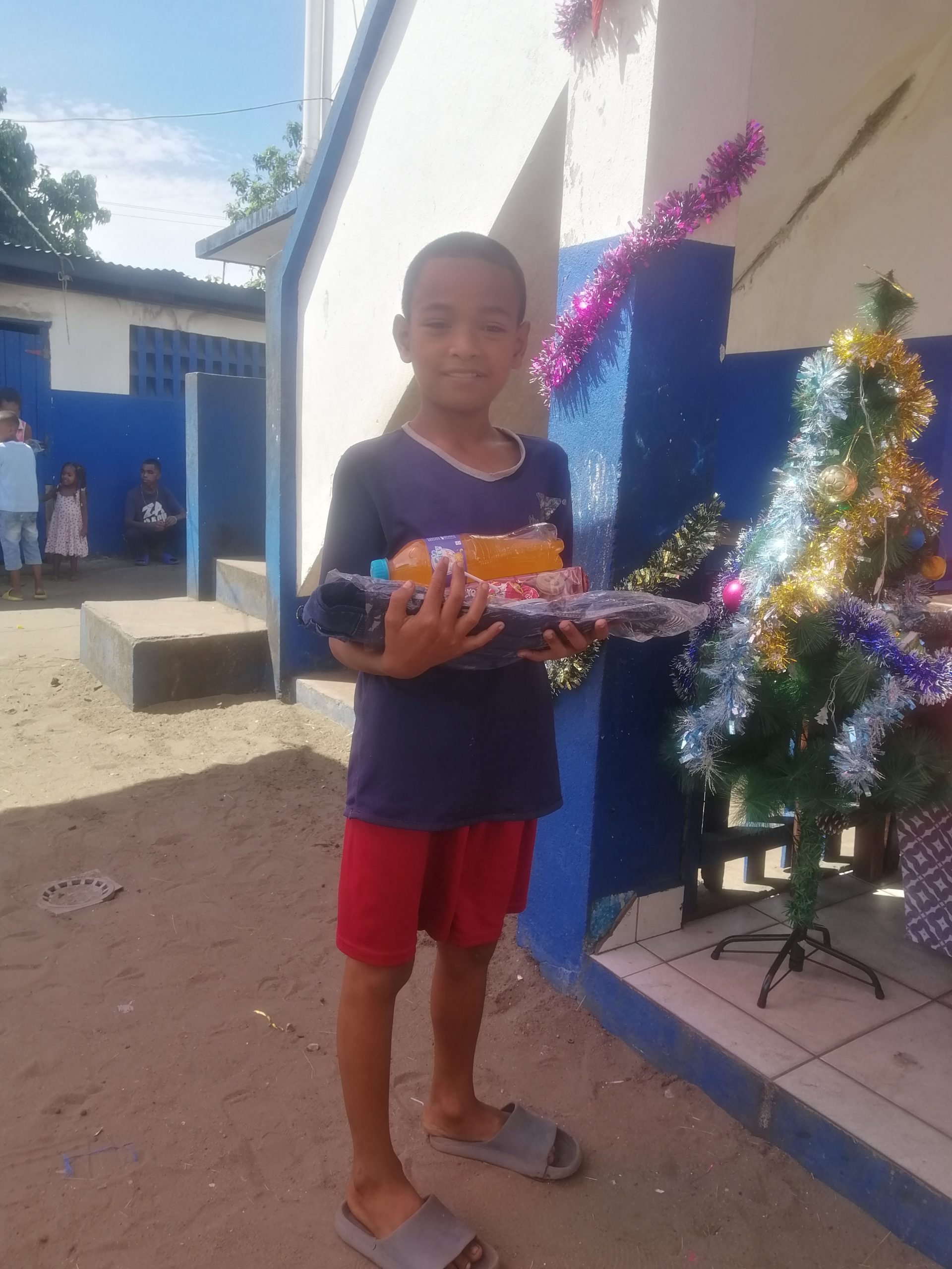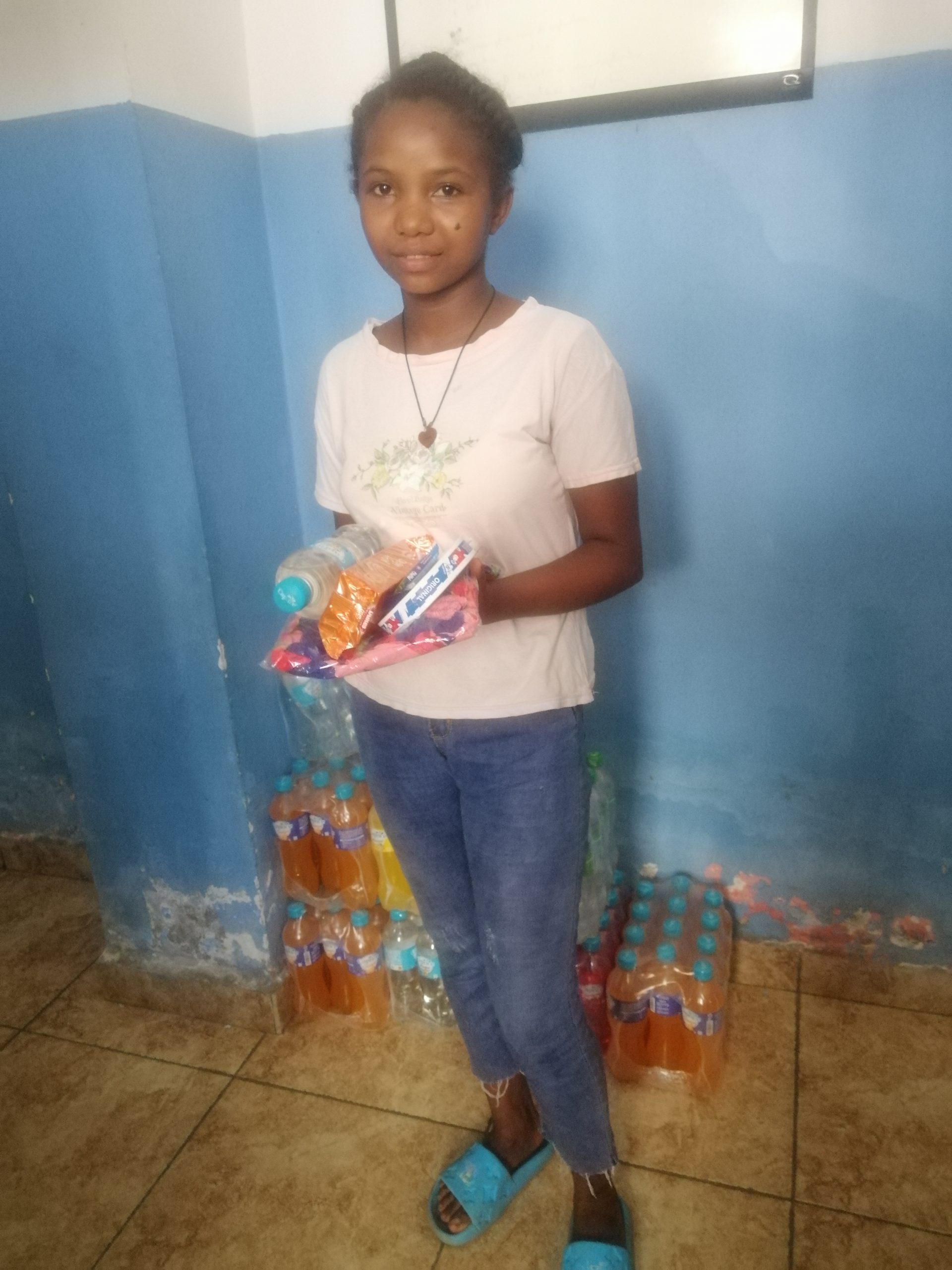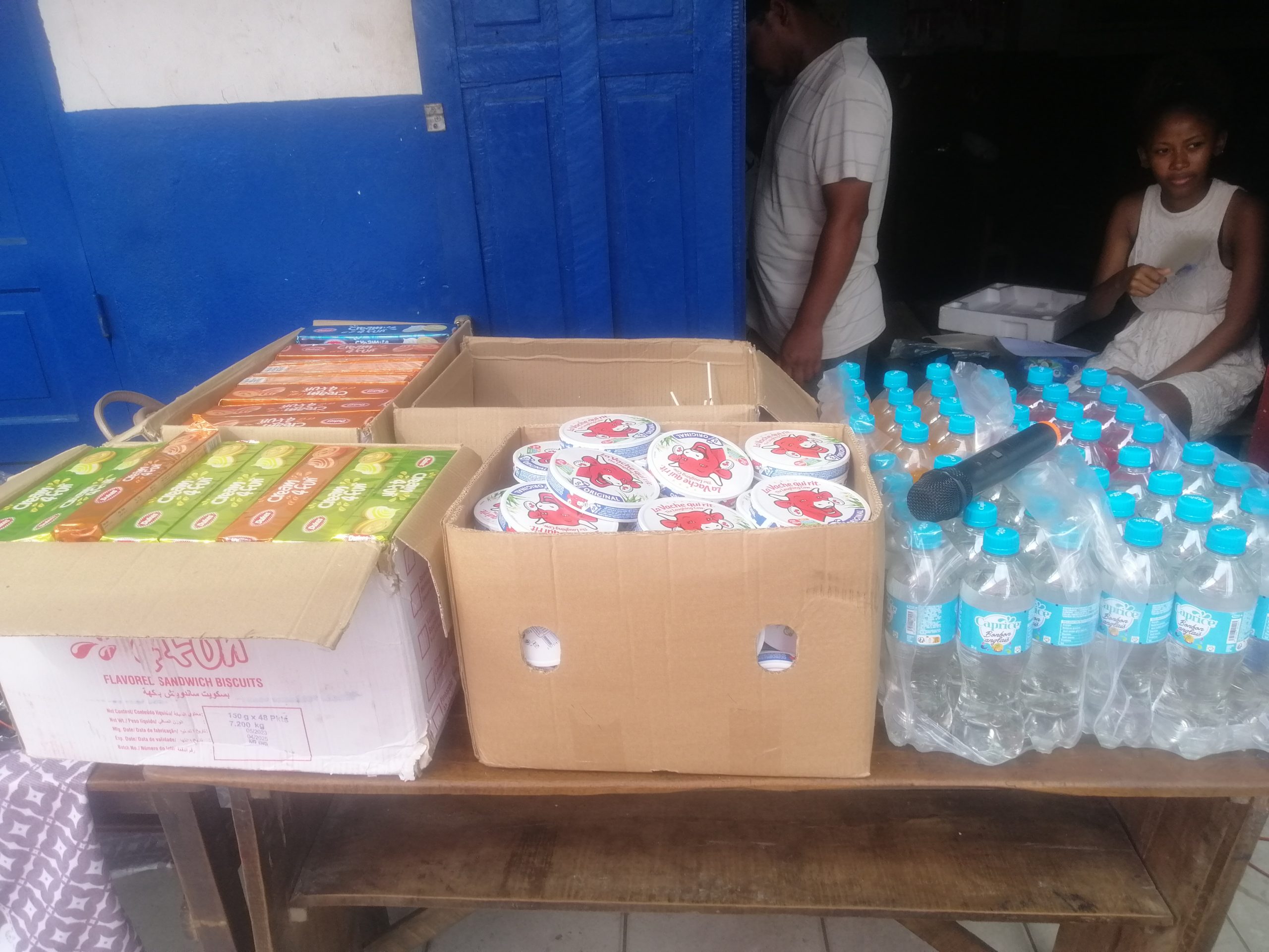 Pour les enfants en famille nous avons donné comme cadeaux : vêtement pour chacun et plus jouets pour les enfants en classe primaire. Pour les goûters : une boisson, une boîte de fromage, un biscuit GM, un chocolat et des bonbons sucettes.