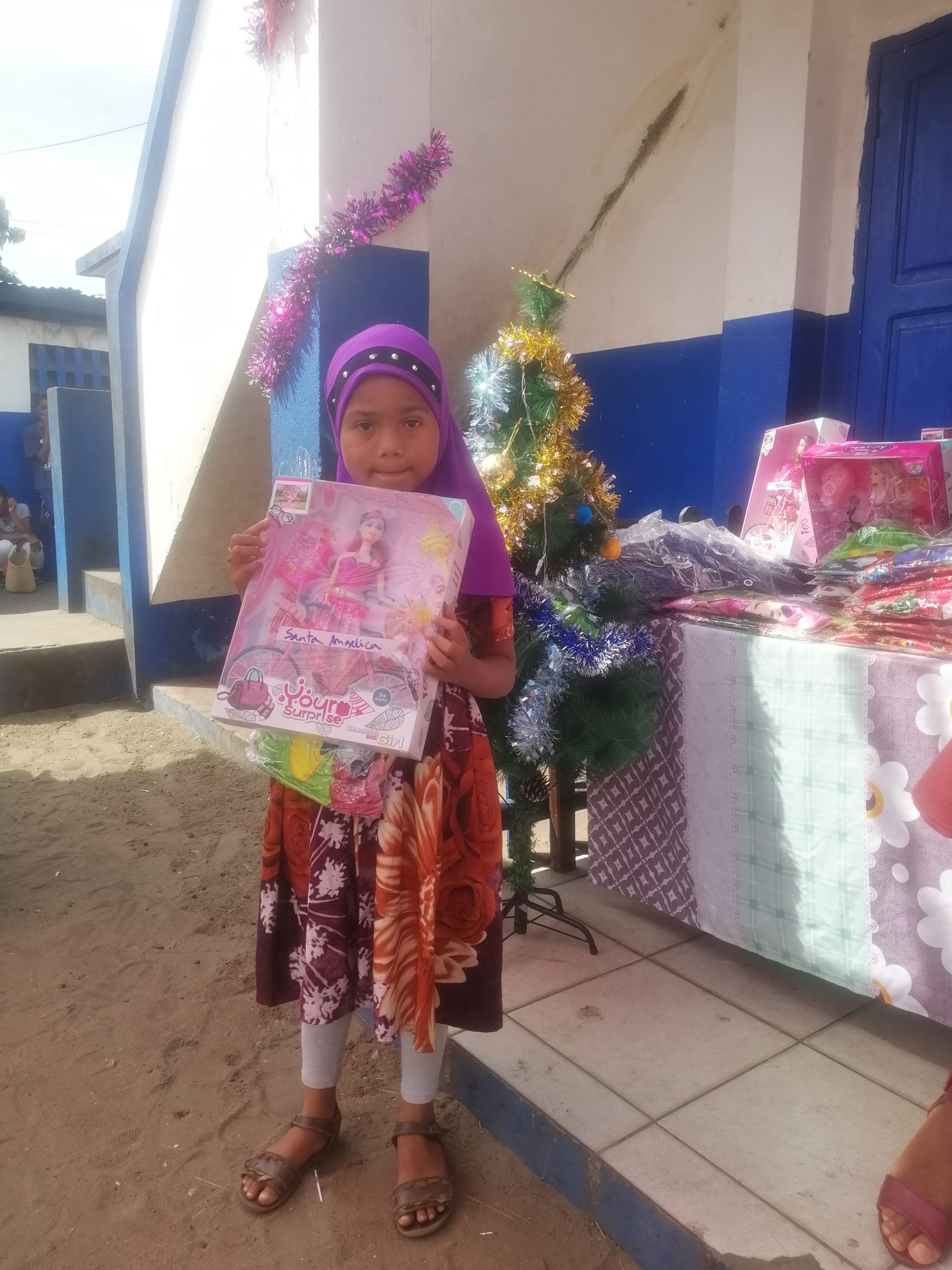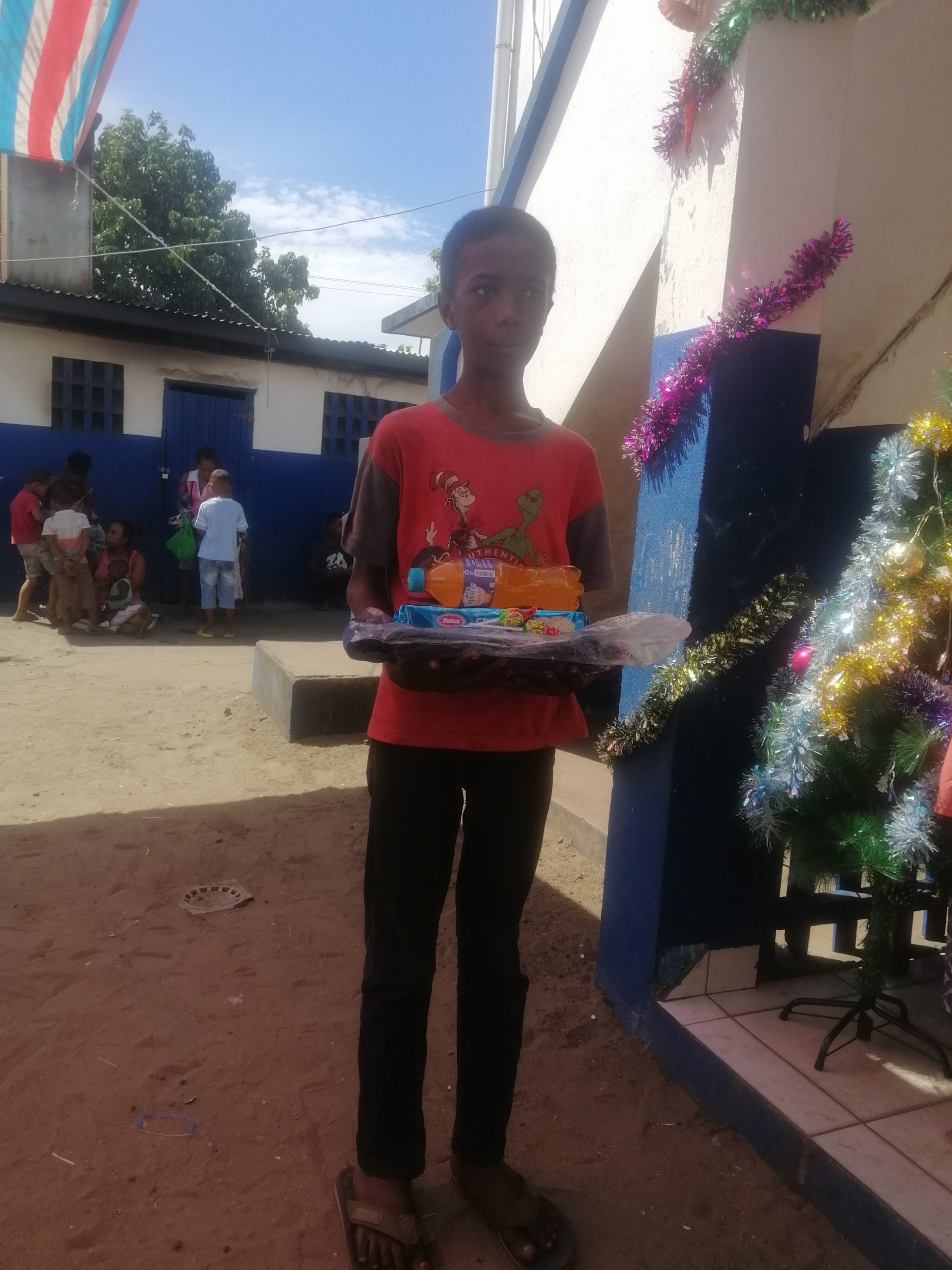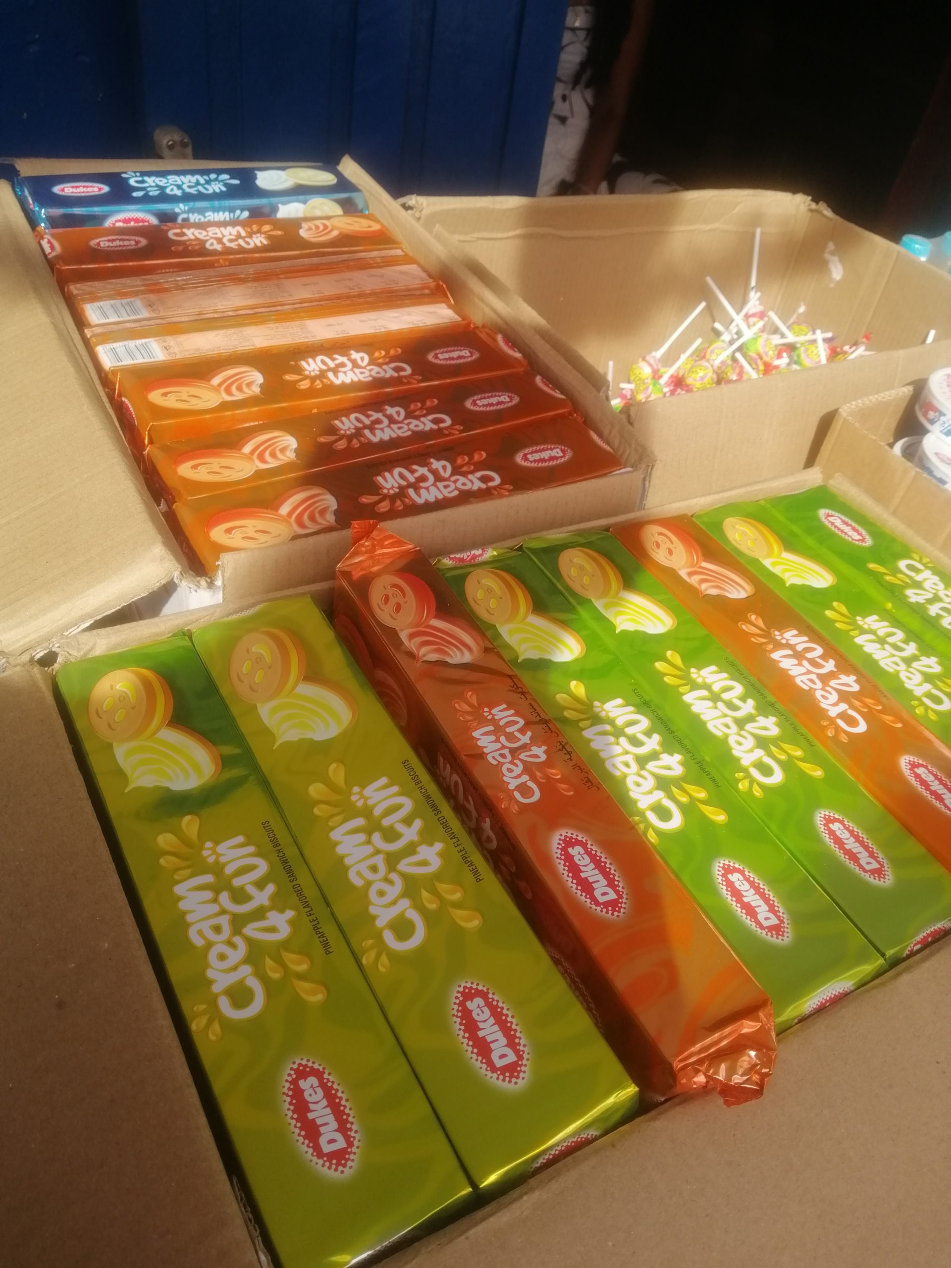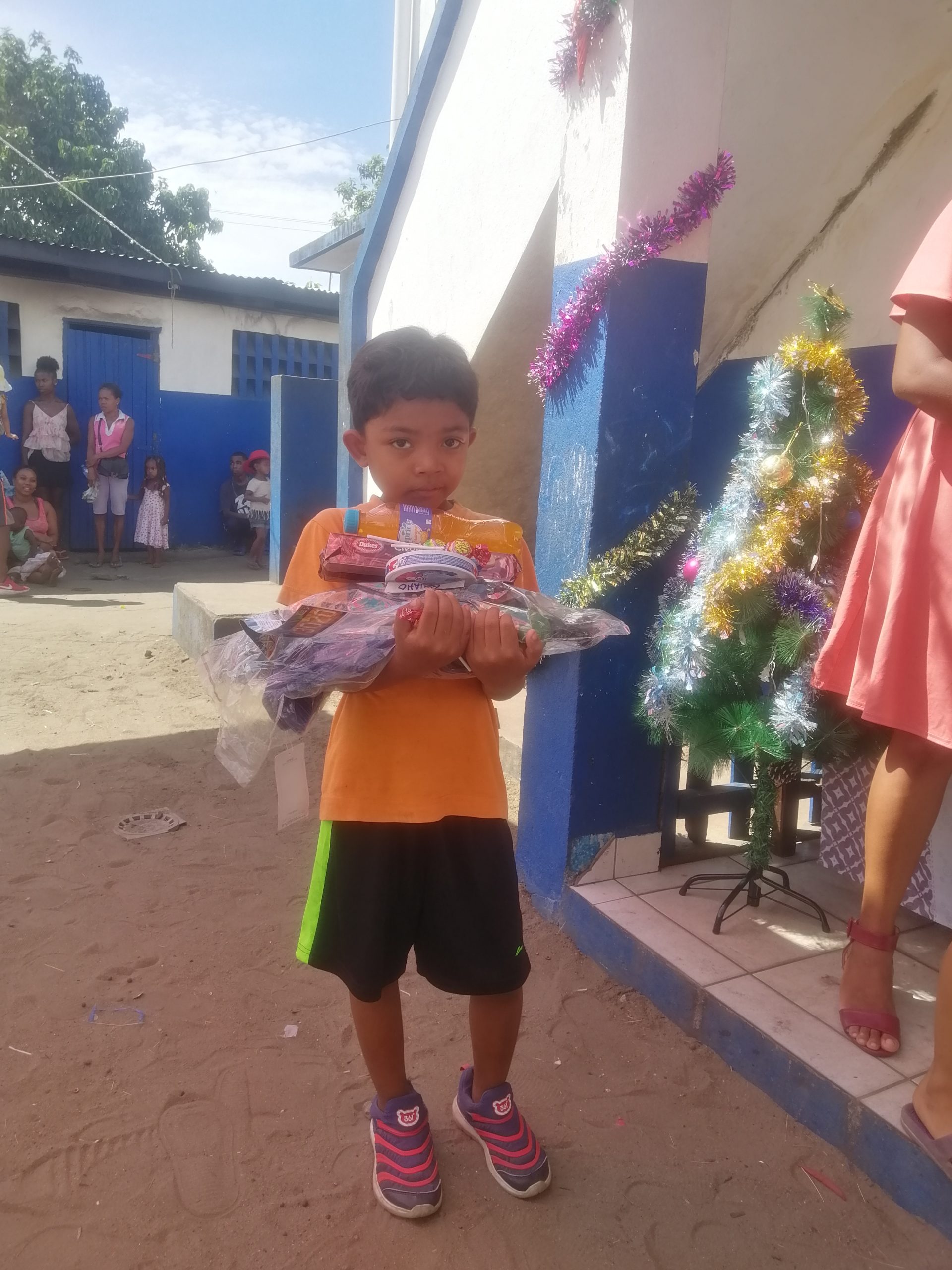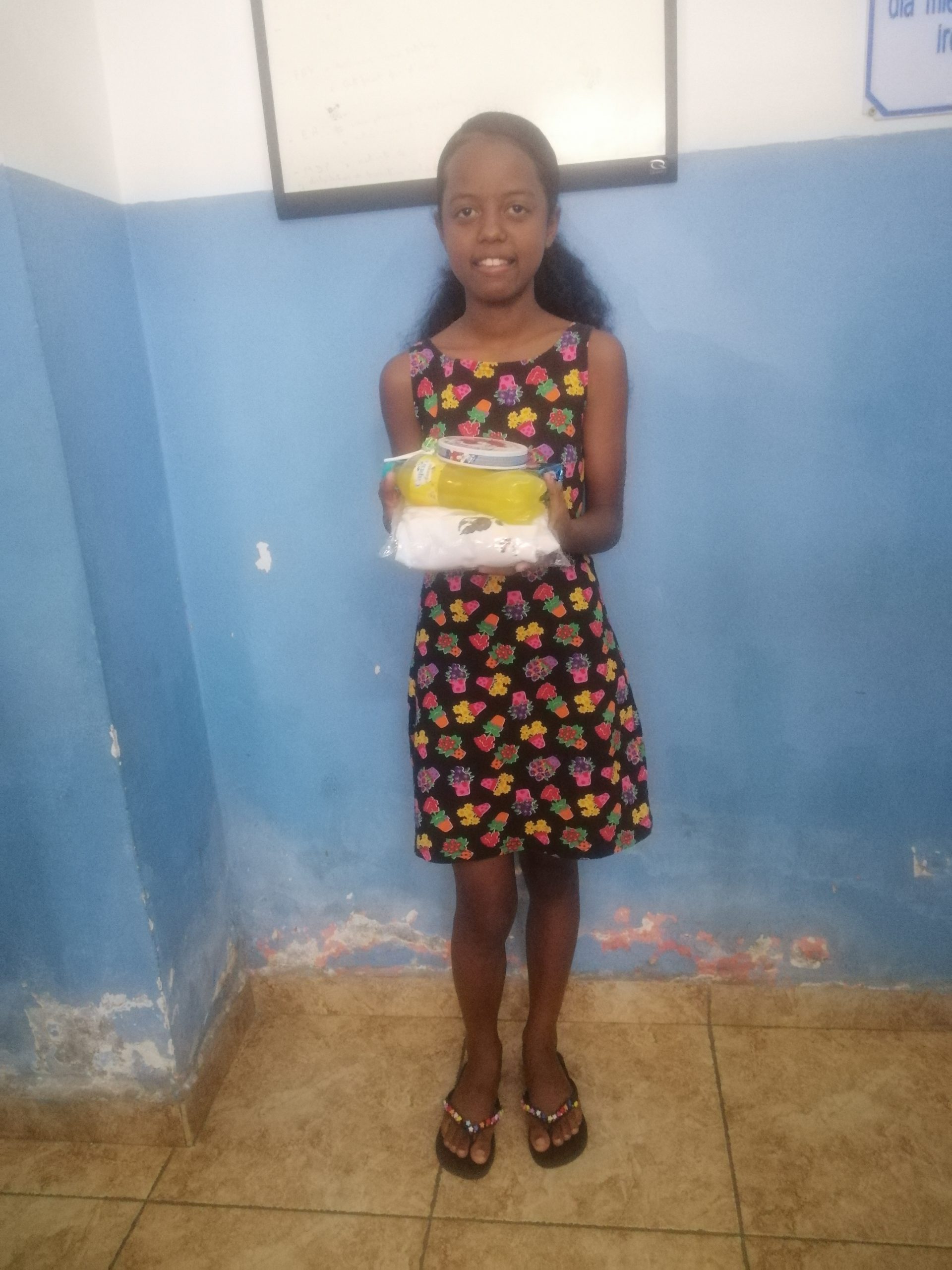 Pour les enfants en famille nous avons donné comme cadeaux : vêtement pour chacun et plus jouets pour les enfants en classe primaire. Pour les goûters : une boisson, une boîte de fromage, un biscuit GM, un chocolat et des bonbons sucettes.