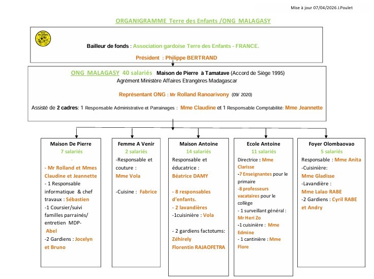 55 salariés Malgaches de notre représentation à Madagascar ont en charge la gestion de nos structures sur place (le siège, 2 orphelinats et 3 écoles), et le suivi et l’éducation d’environ 1300 enfants. L’organigramme de l’Ong à Tamatave est présenté ci-dessous.