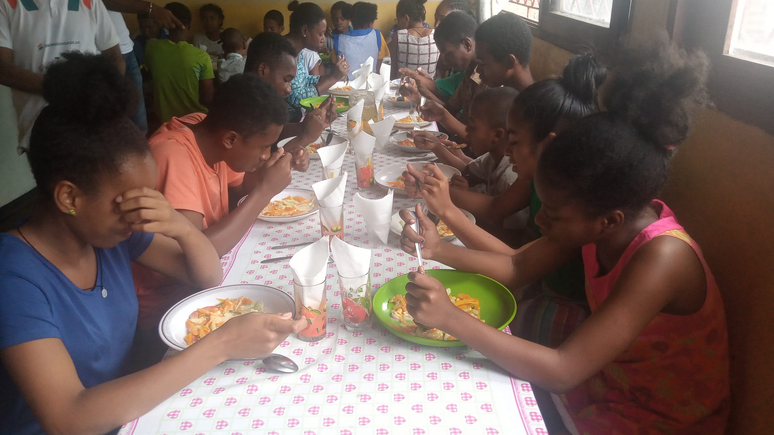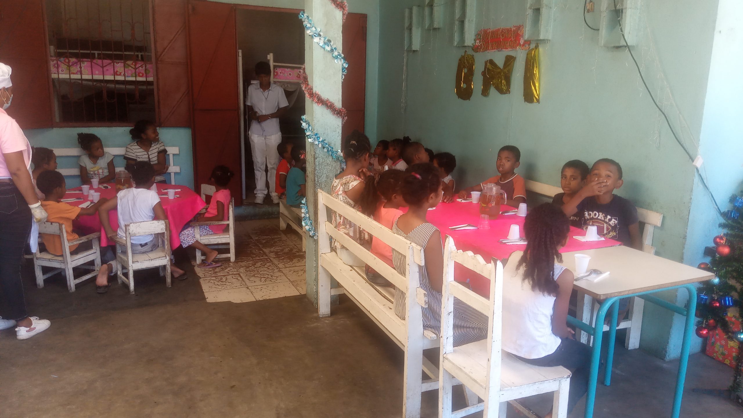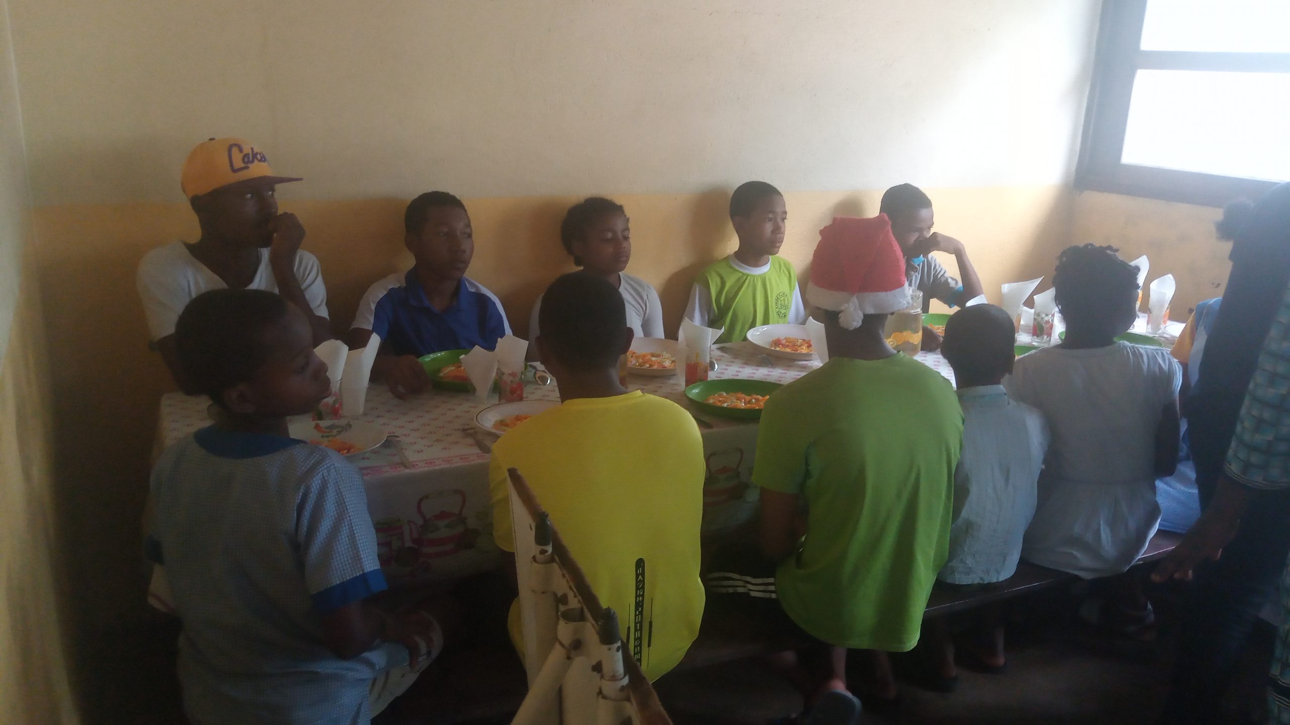 Mme Jeanine Sylla et moi sommes allés au foyer Olom-baovao pour la passation, et à midi l’équipe de la BNI (Banque Nationale pour l’Industrie) dirigée par son Directeur est venue au Foyer pour offrir le repas de midi aux enfants (entrée, plat de résistance, dessert) des bonbons, des biscuits, ainsi que quelques vêtements pour les enfants.