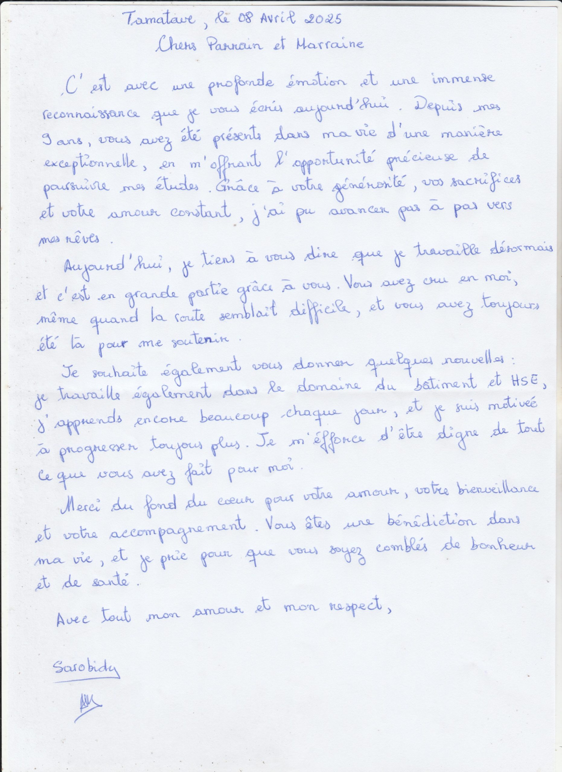 Lettre de Sarobidy à ses parrains