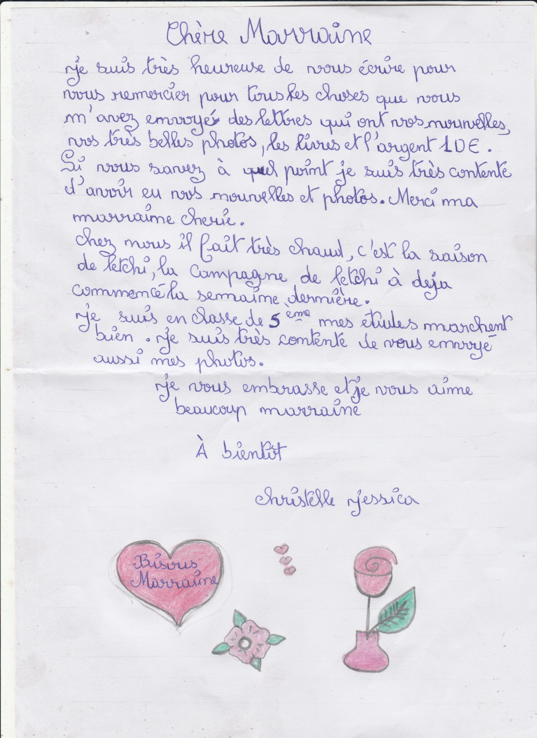Ses parrains, Nadine et Eric ont reçu une bien jolie lettre.